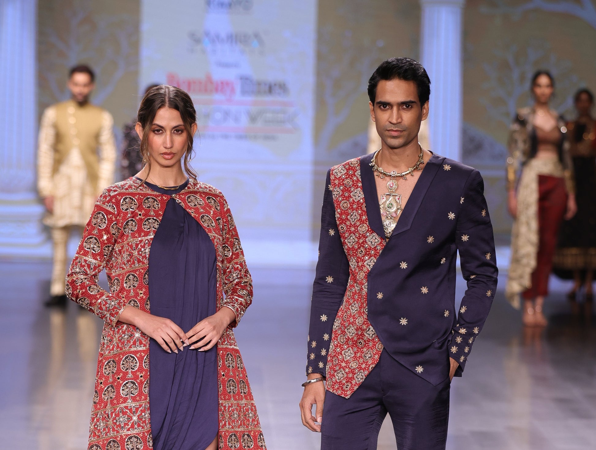 Designed as matching ensembles for men and women, these looks share a unified design language through Ajrakh detailing, handcrafted embroidery, and refined silhouettes—perfect for coordinated festive dressing, weddings, and special occasions.