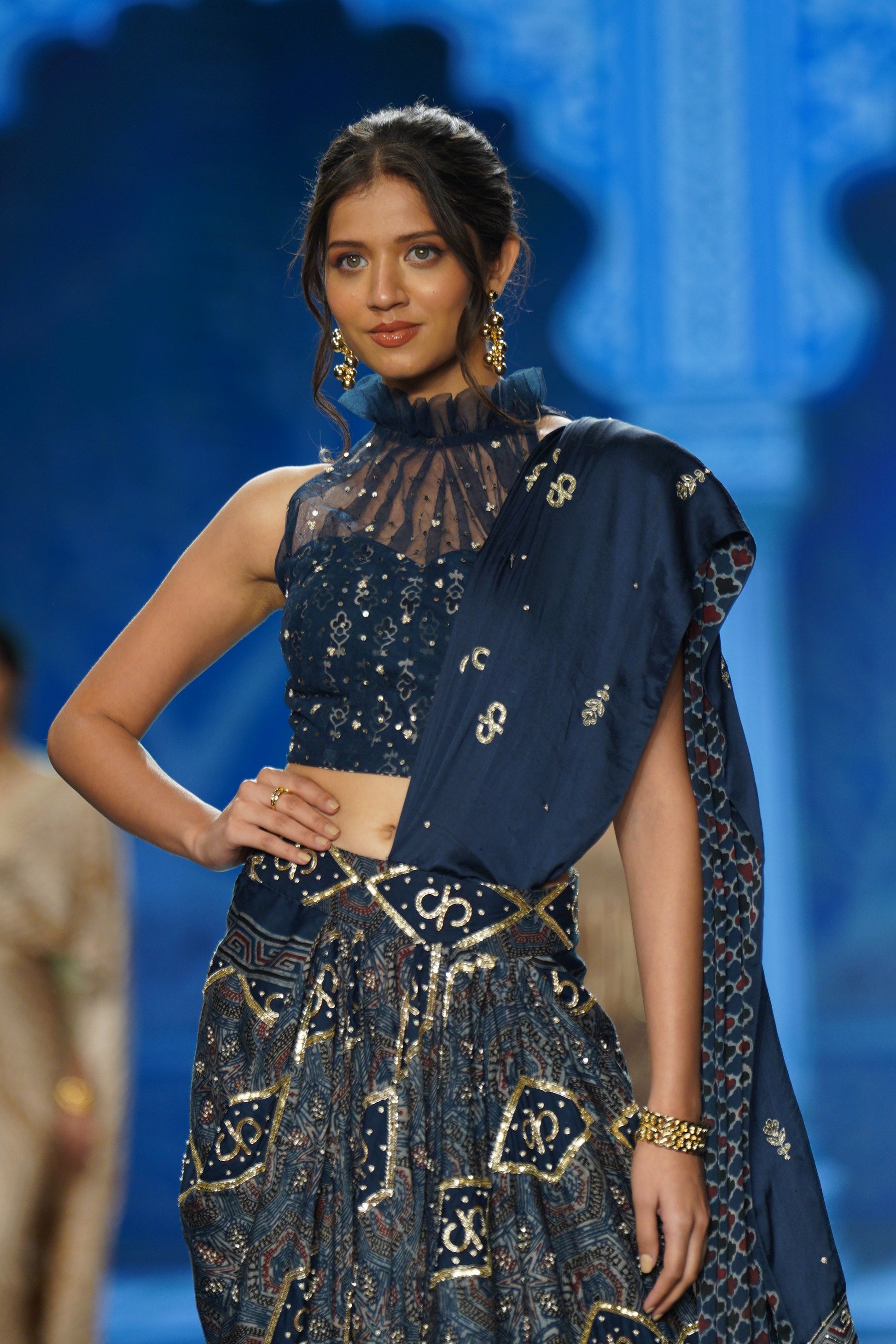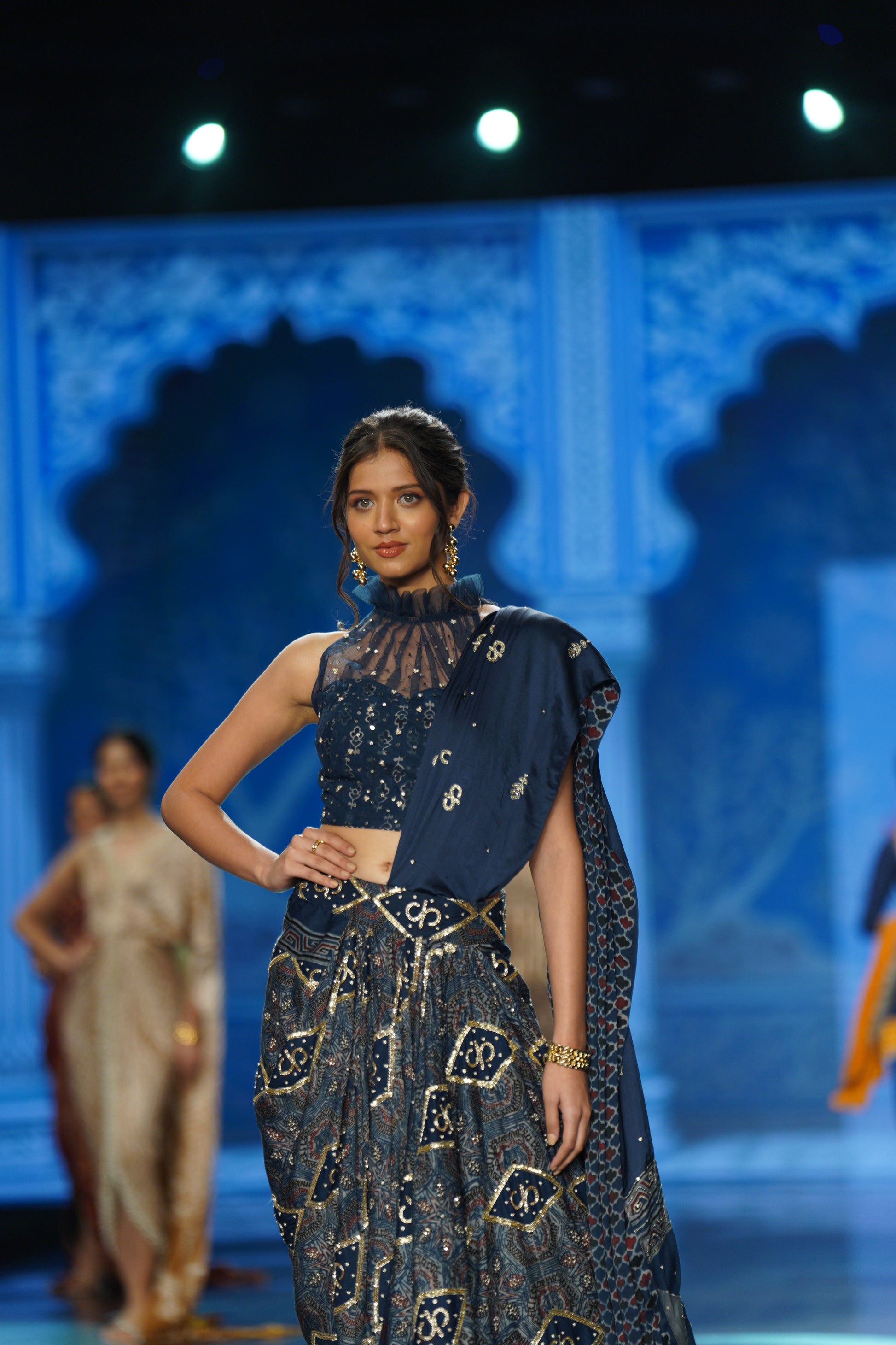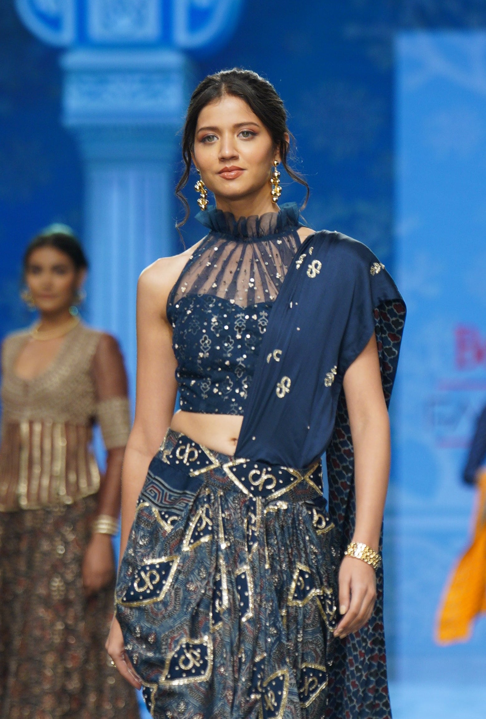 This elegant saree, paired with a modal Ajrakh blouse accented with net detailing, brings together heritage craft and modern styling. Crafted in soft modal Ajrakh, the saree offers a graceful drape with a timeless printed finish.