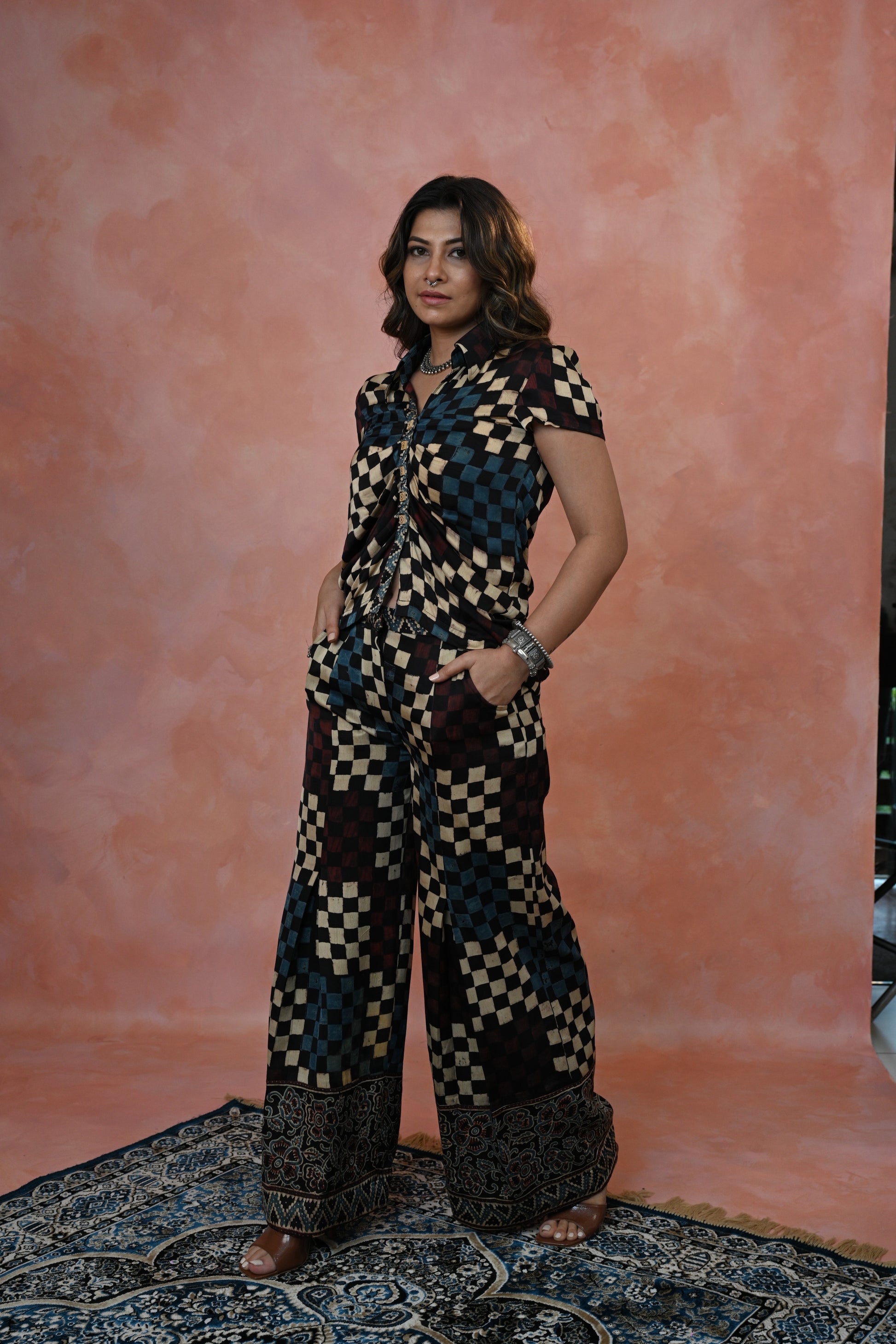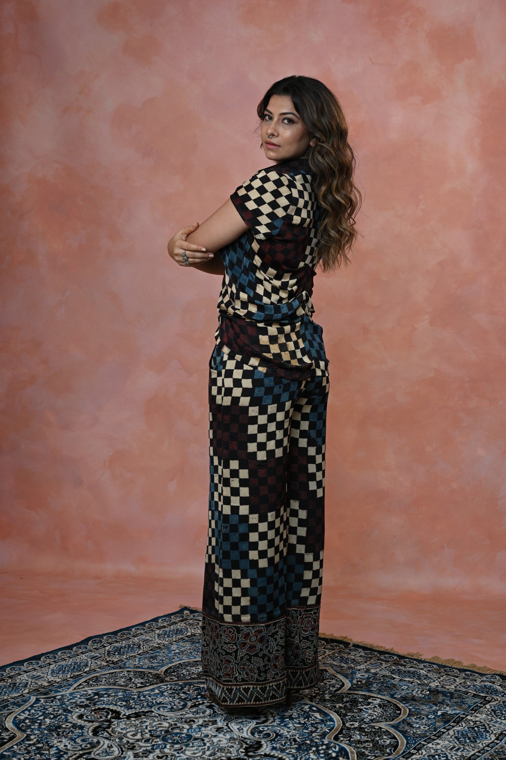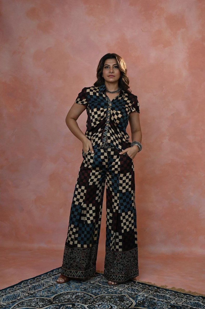Simple and elegant black Ajrak Hand Block Print shirt and bottom with rare checks print , front and back pleated shirt with cap sleevs with detailing of wooden bottons paired with box pleated pants with comfortable back elastic