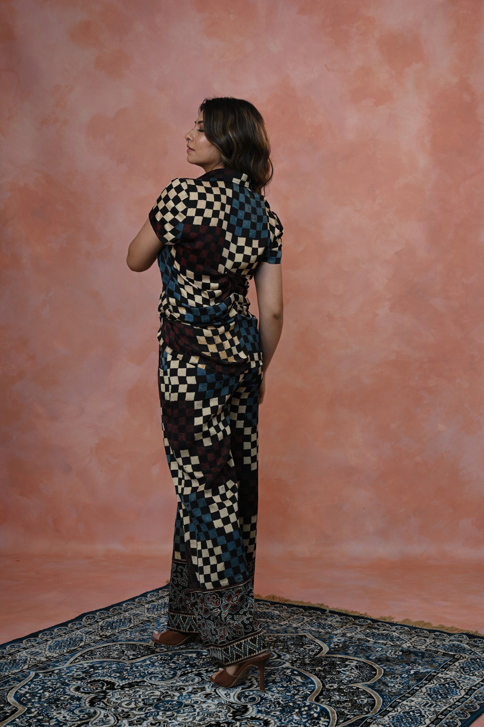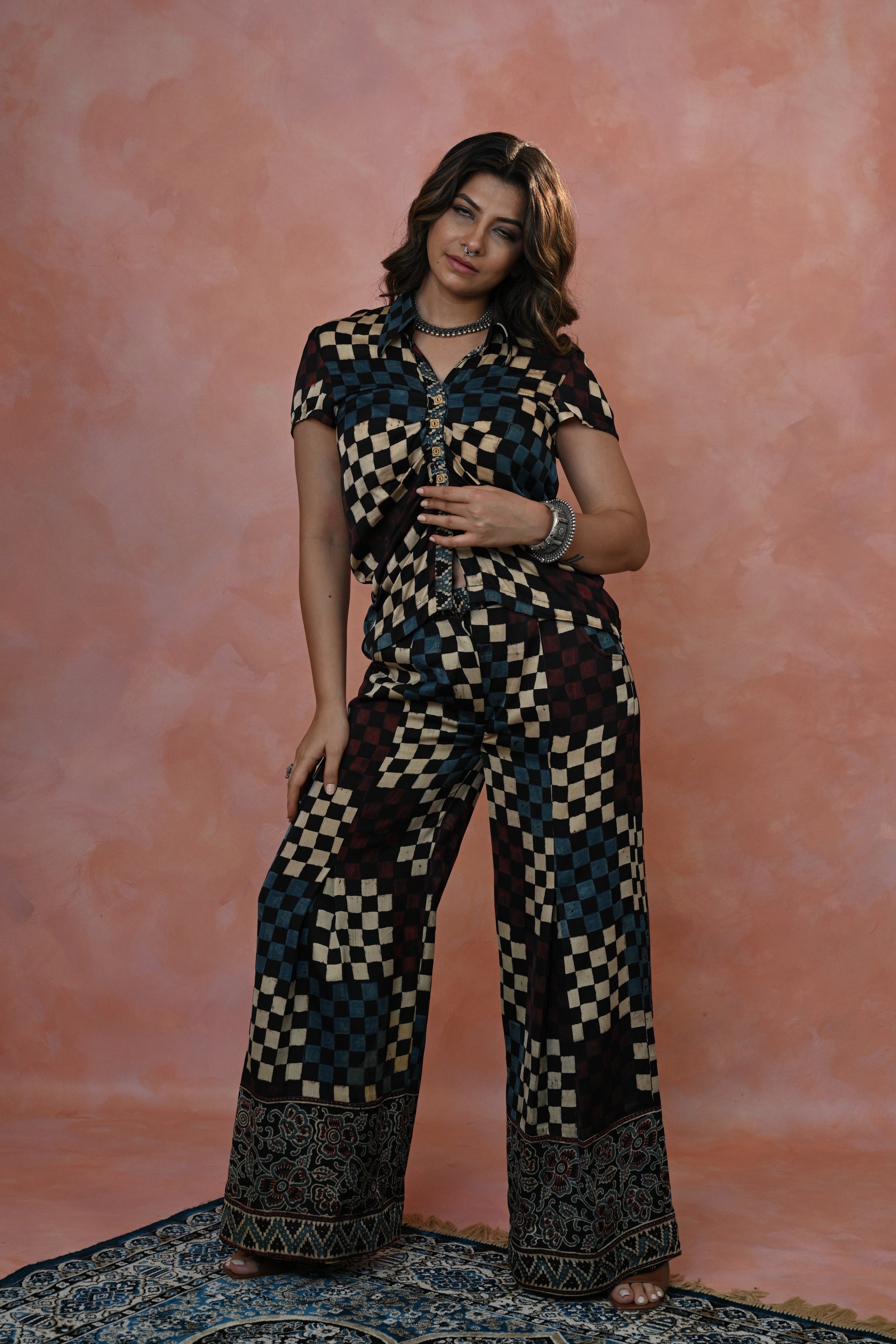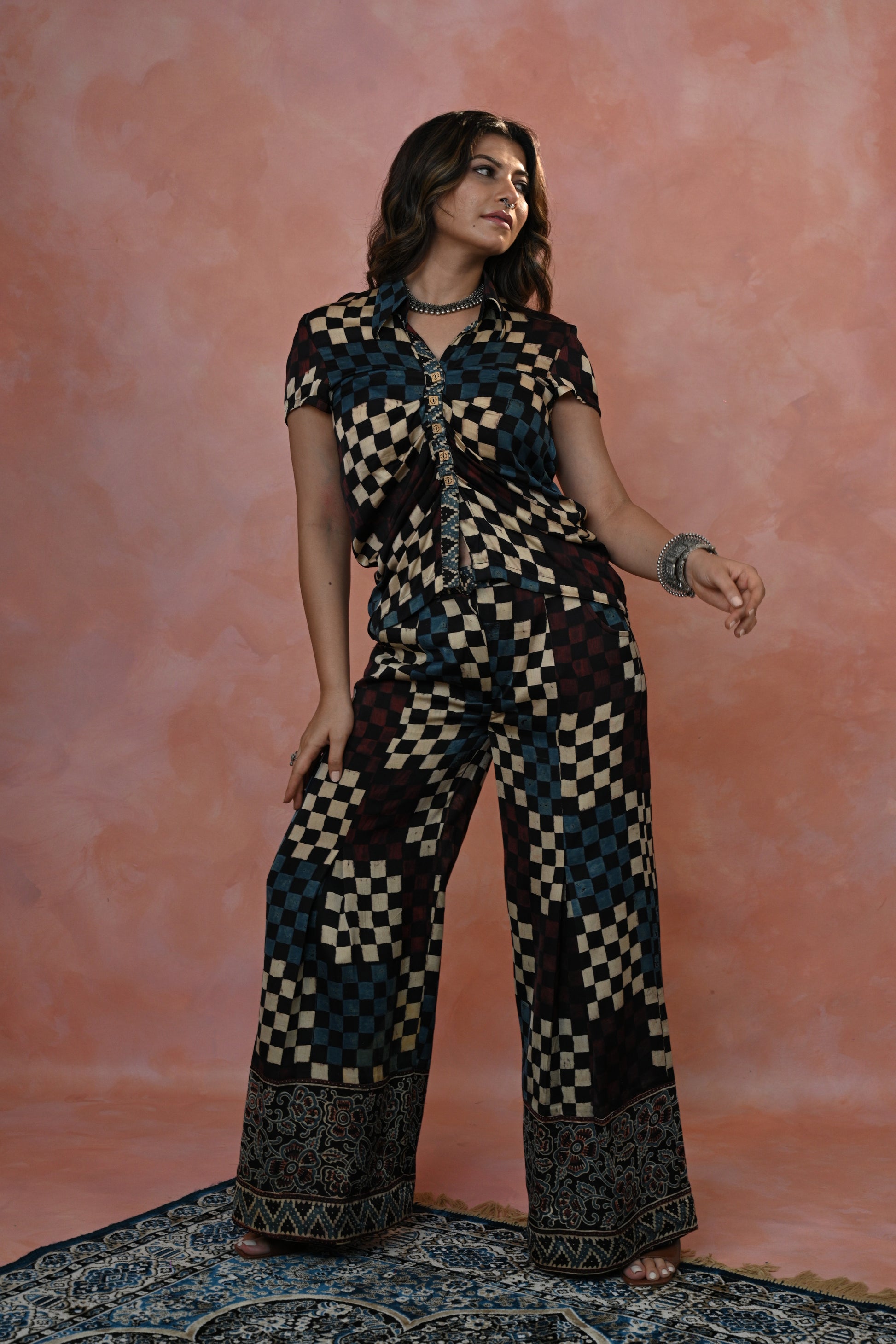 Simple and elegant black Ajrak Hand Block Print shirt and bottom with rare checks print , front and back pleated shirt with cap sleevs with detailing of wooden bottons paired with box pleated pants with comfortable back elastic