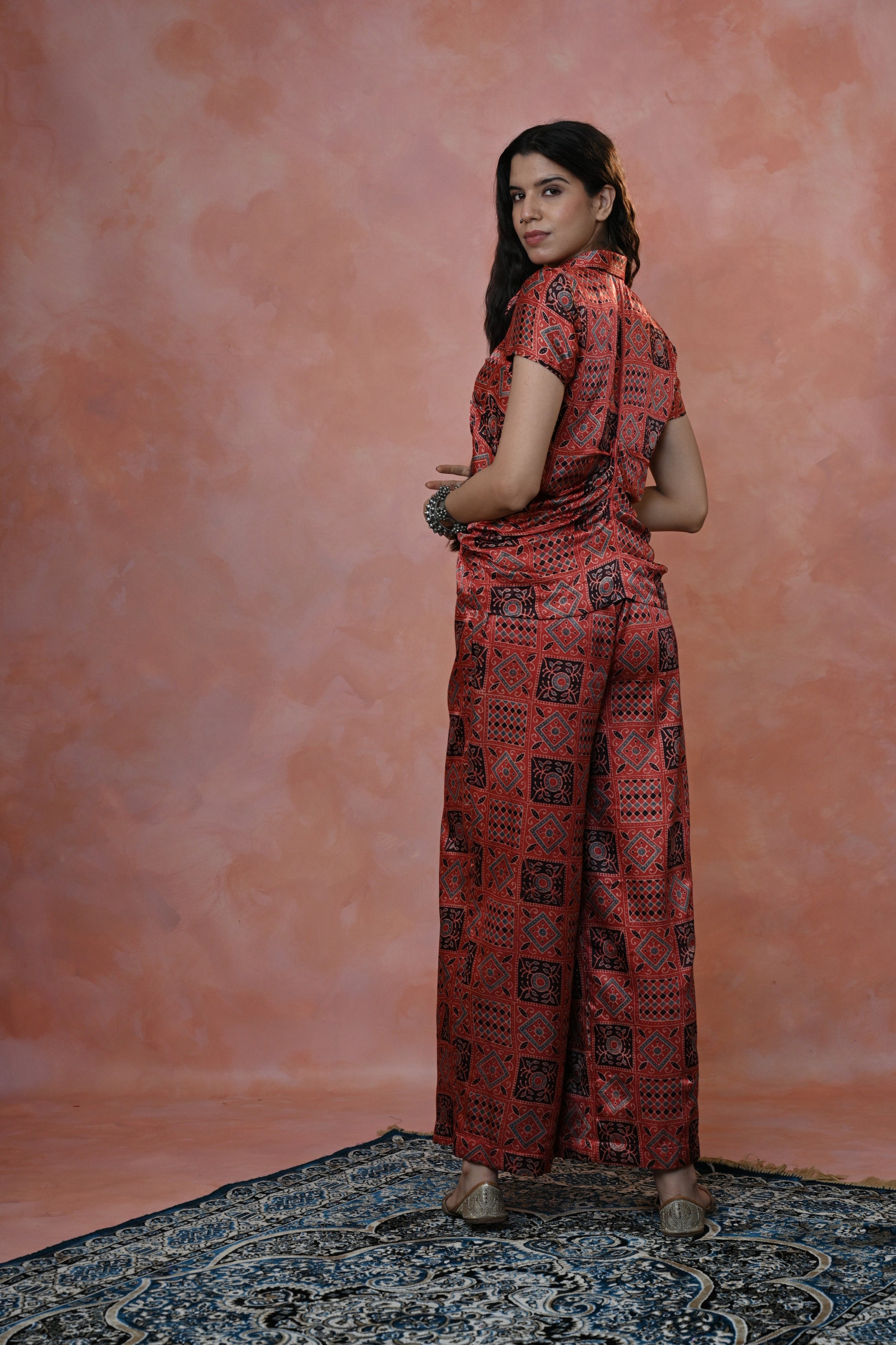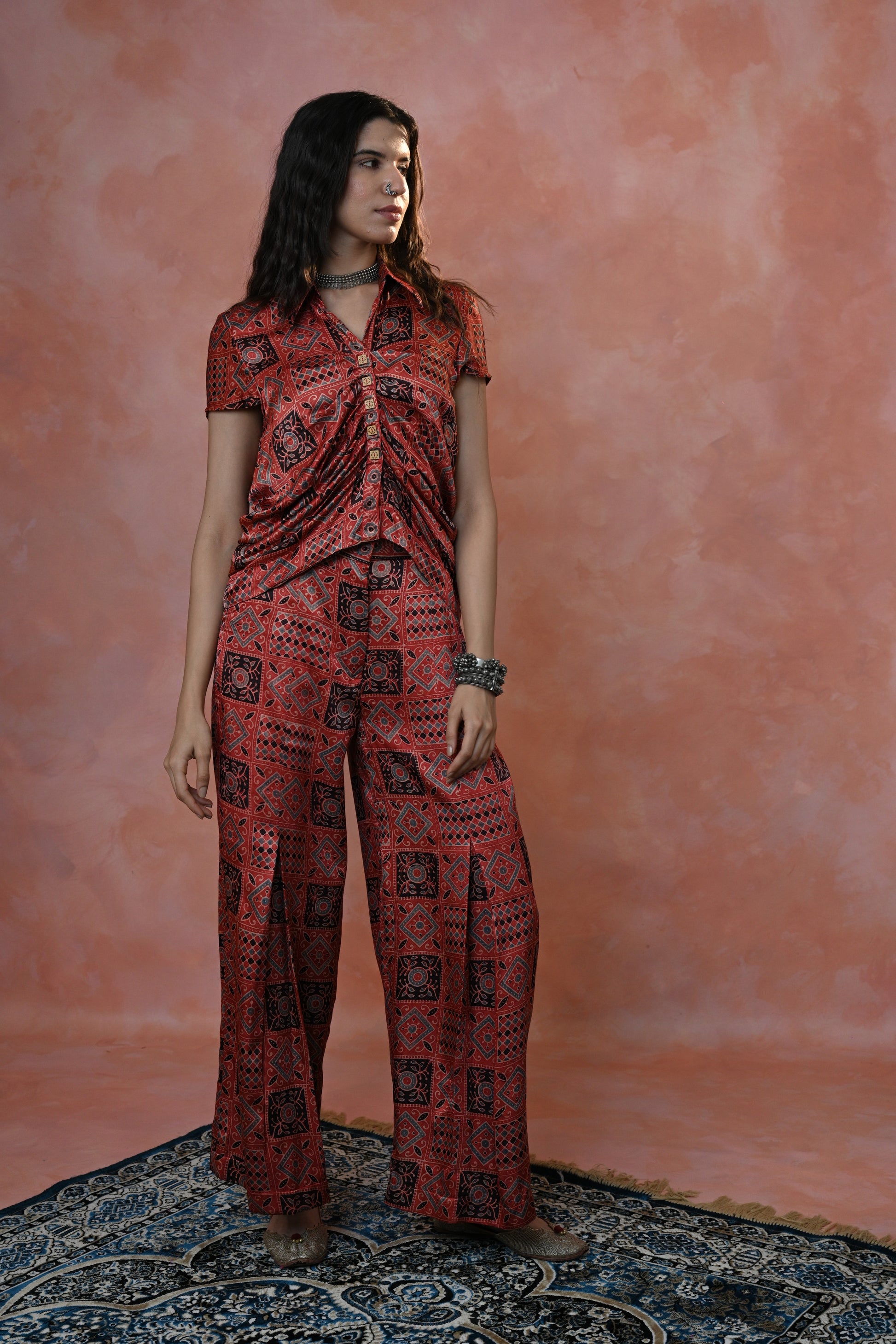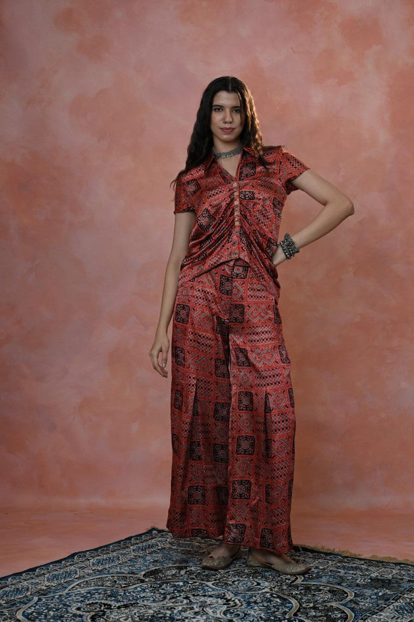 Simple and elegant rust Ajrak Hand Block print front and back pleated shirt with cap sleevs and wooden botton detailing paired with Ajrak Hand Block Print box pleated pants with comfortable back elastic