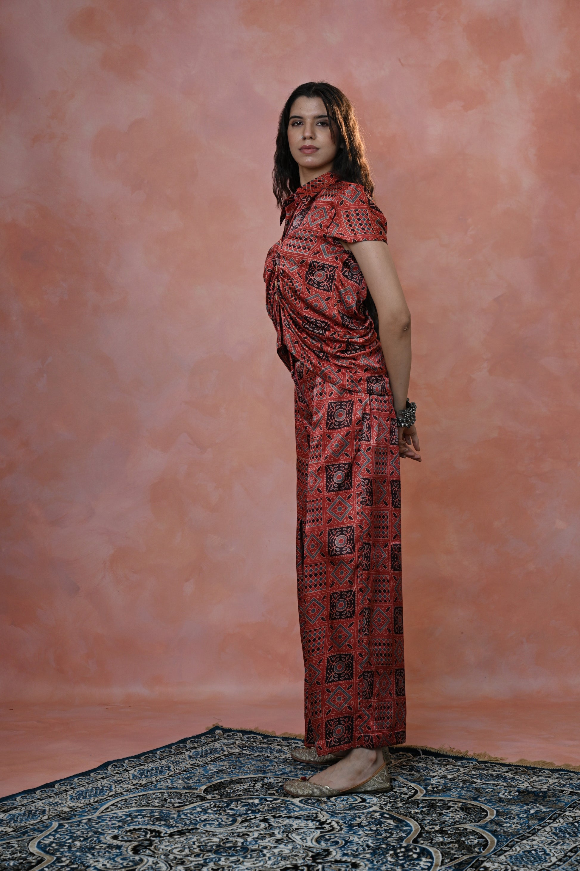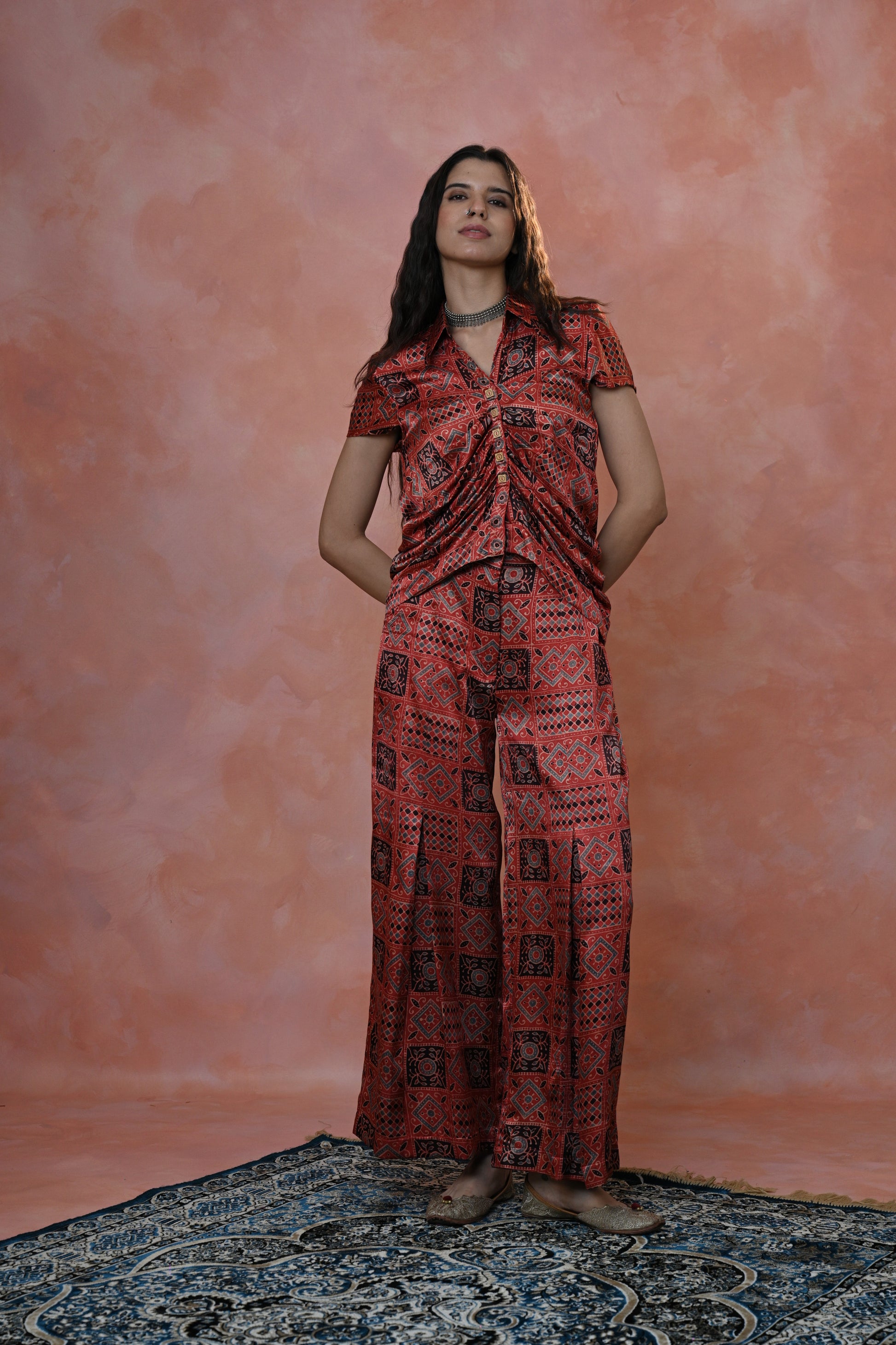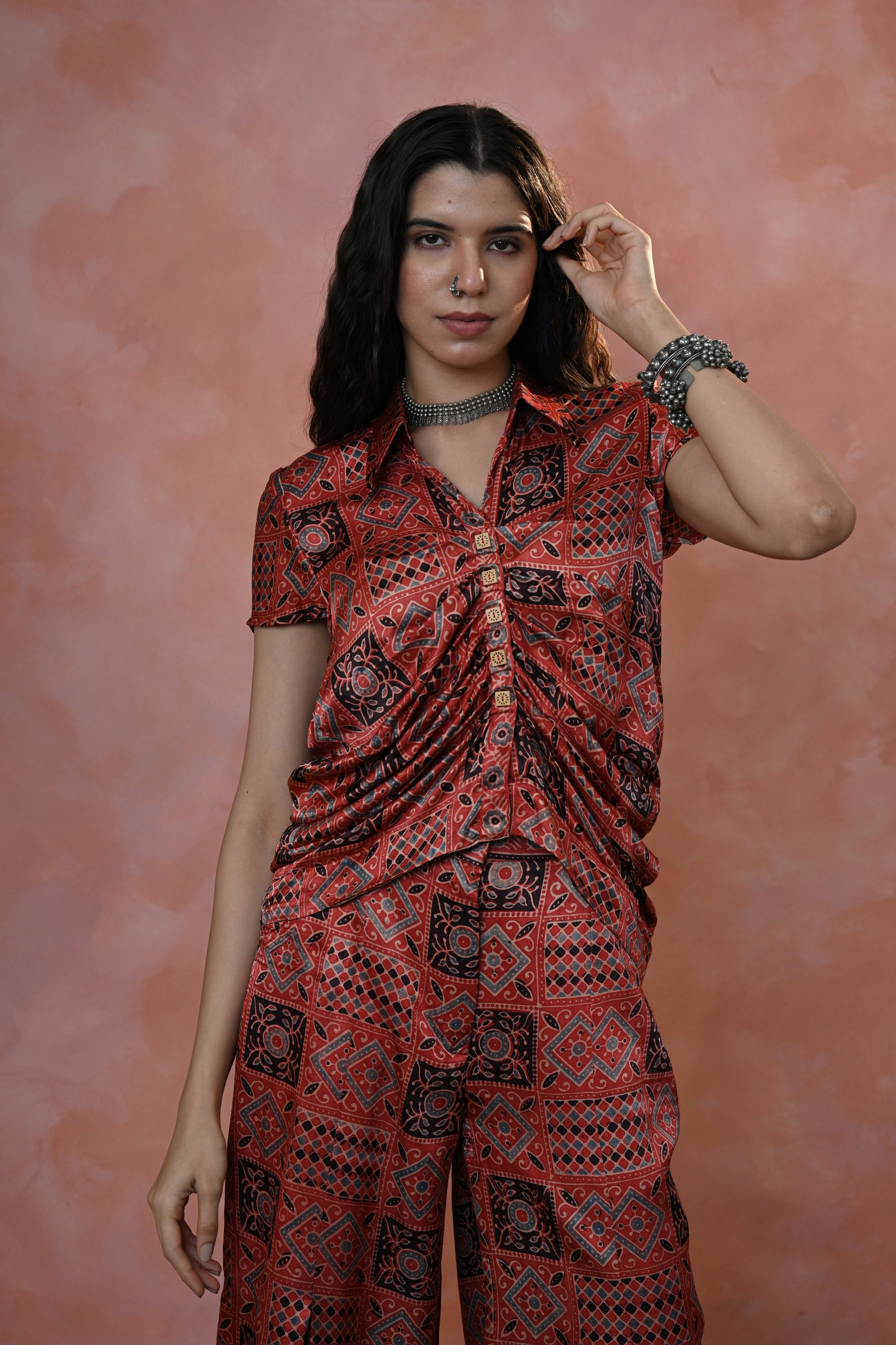 Simple and elegant rust Ajrak Hand Block print front and back pleated shirt with cap sleevs and wooden botton detailing paired with Ajrak Hand Block Print box pleated pants with comfortable back elastic