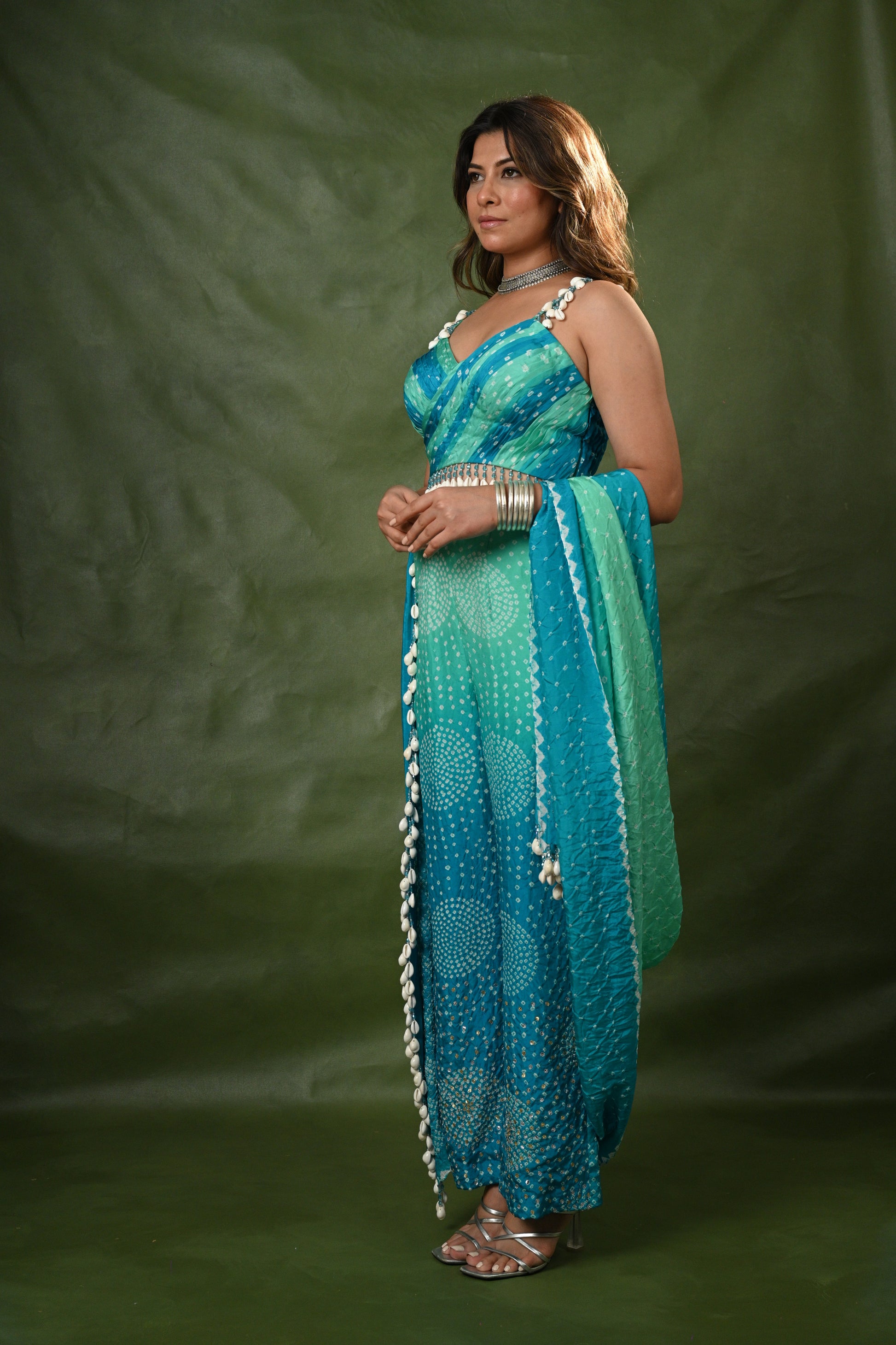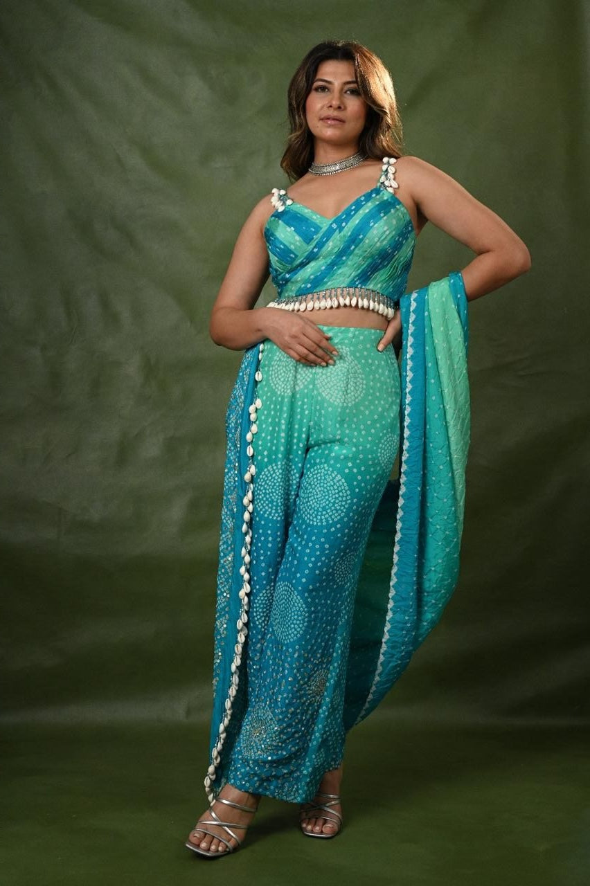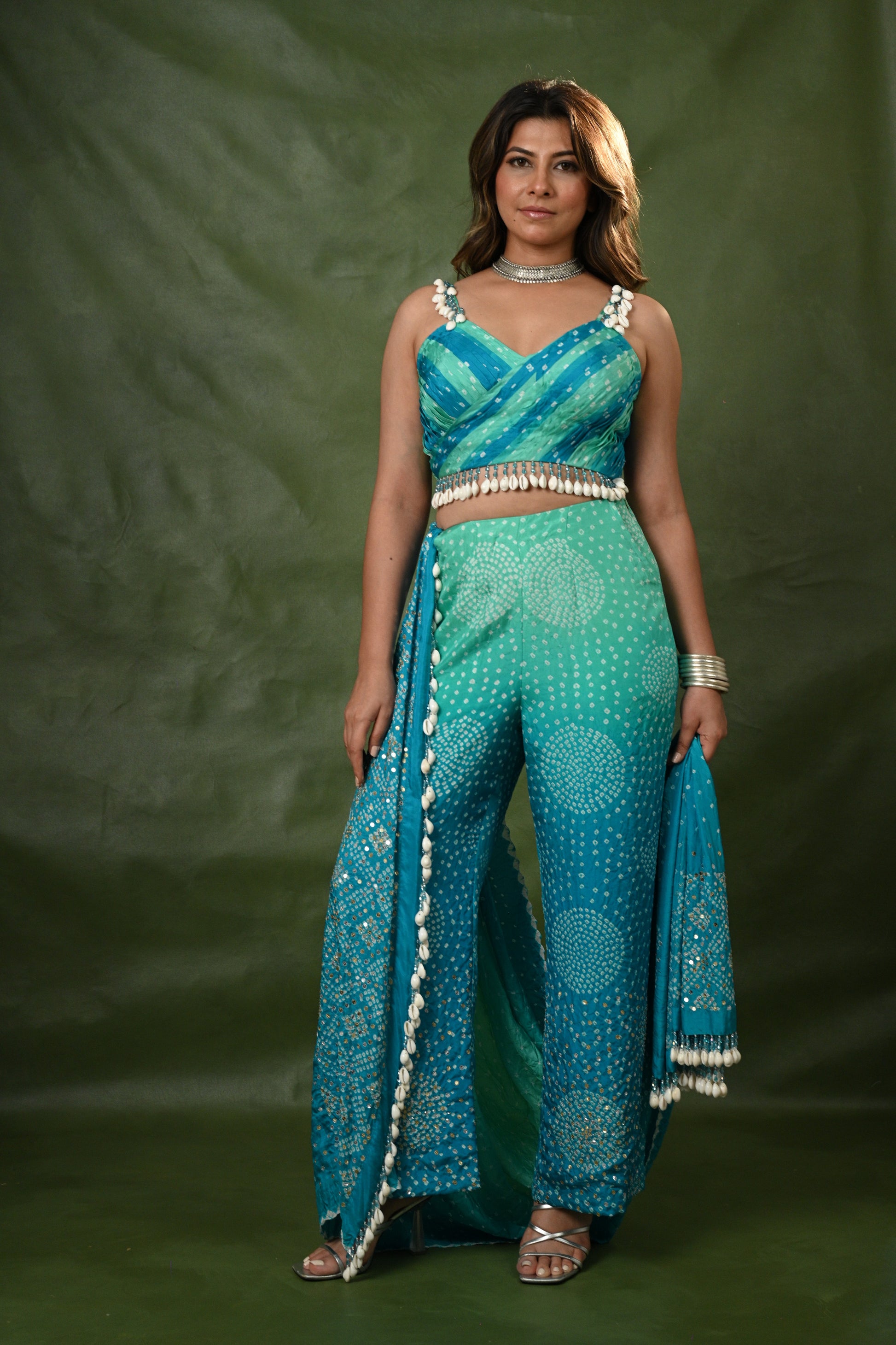 Modern Aqua blue pleated blouse in Bandhni with kodi tasels on waist and shoulder strap paired with wide leg pants with Khat Work highliting and Habutai Silk Bandhni duppata with tasels on both sides of duppata