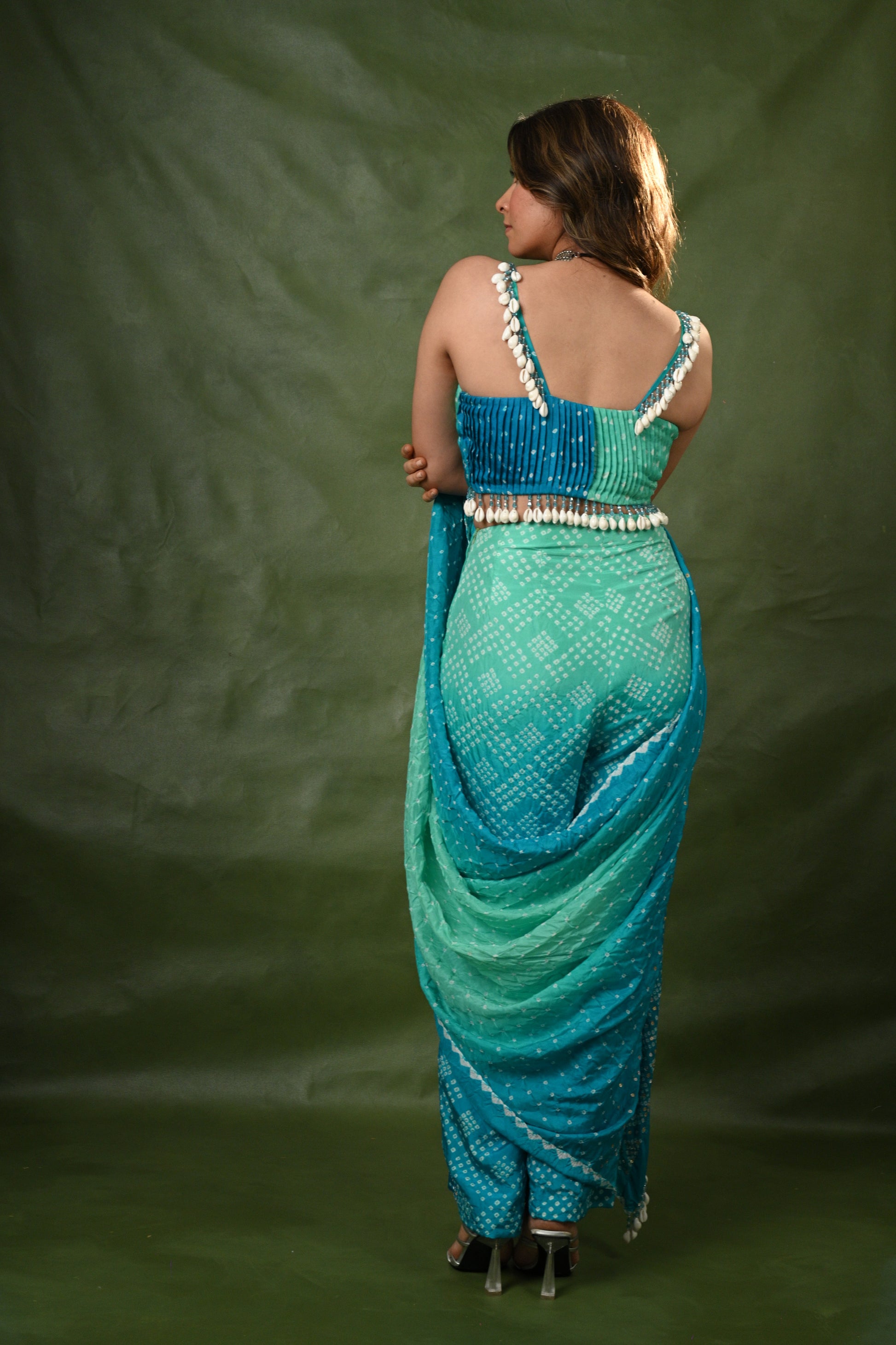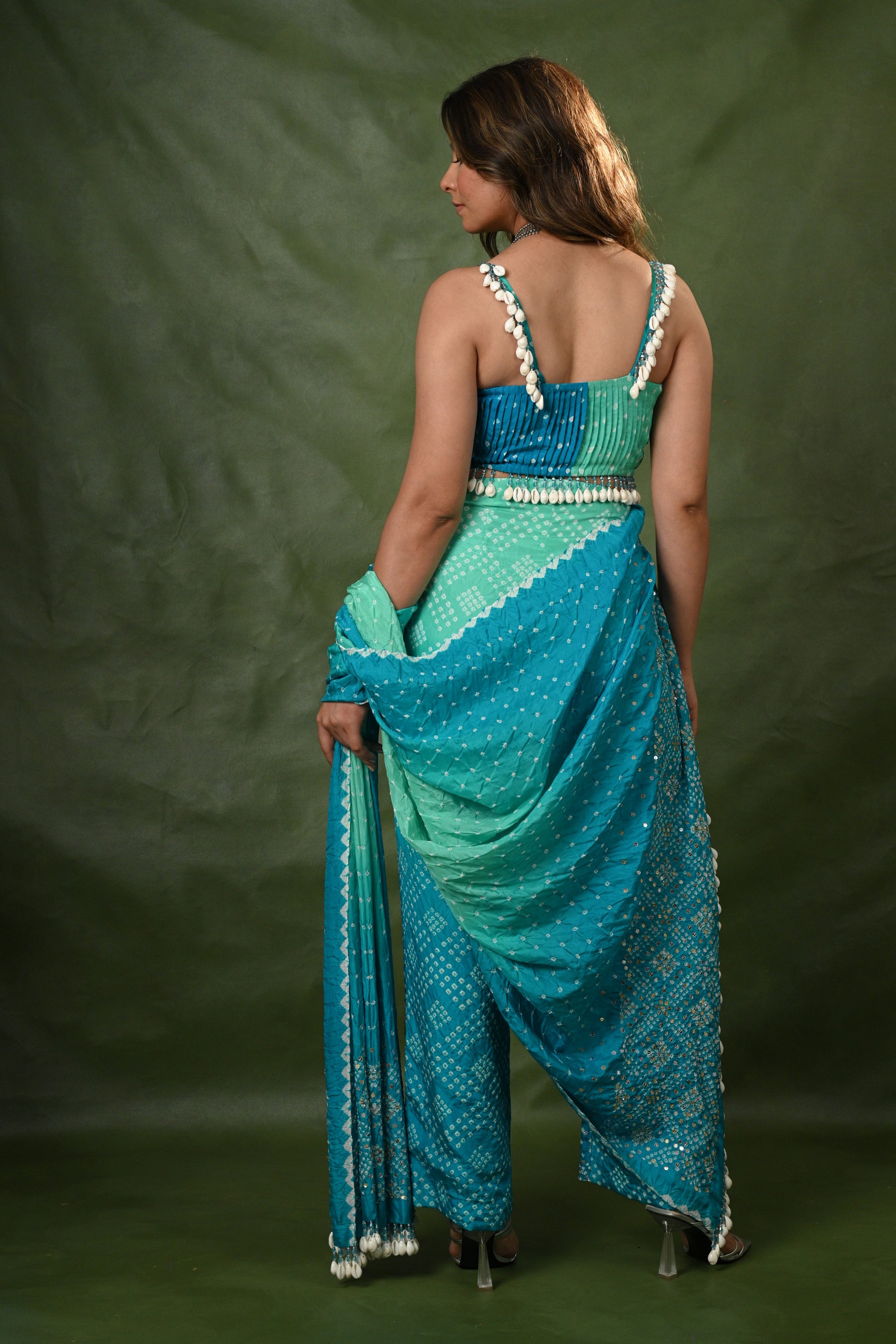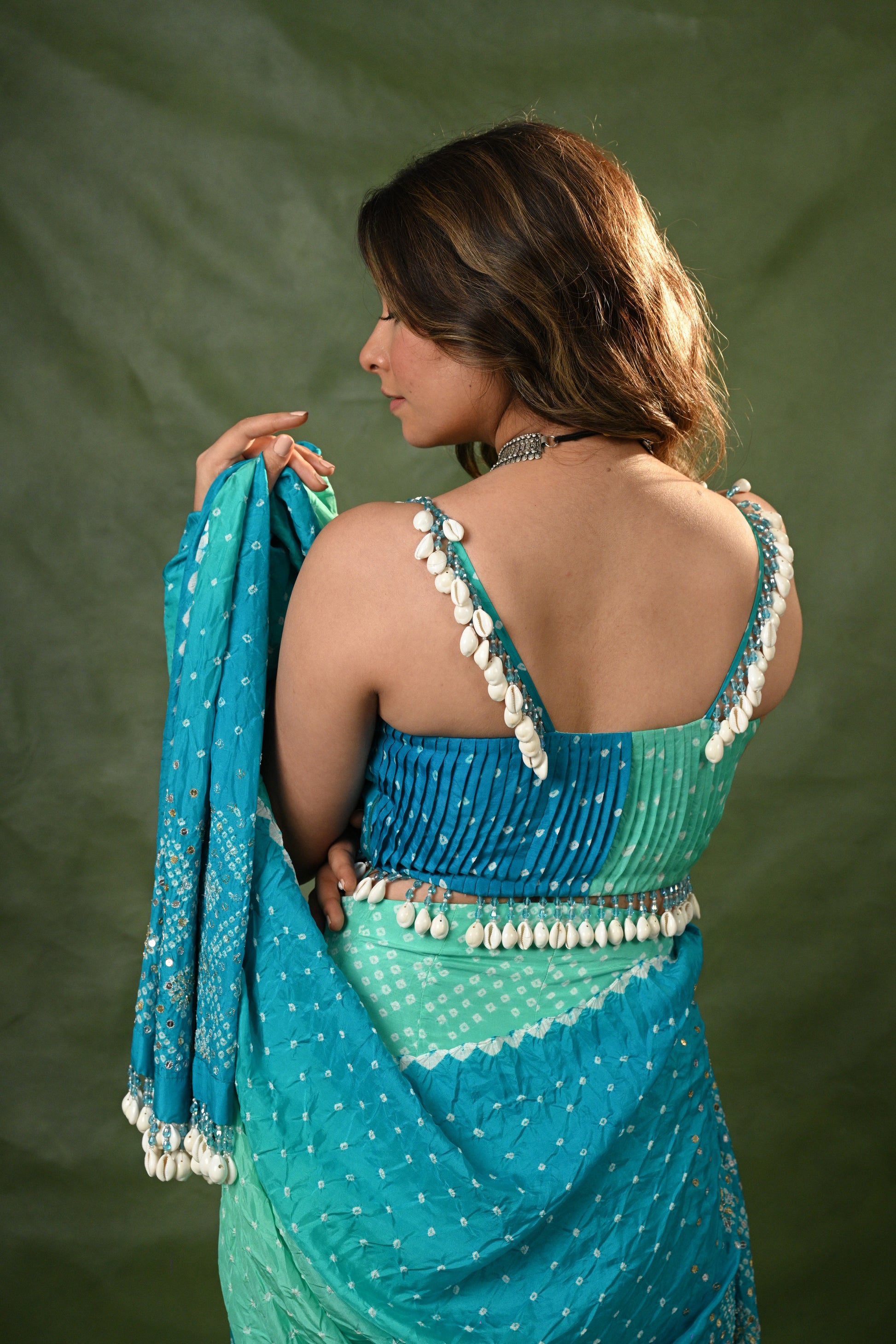 Modern Aqua blue pleated blouse in Bandhni with kodi tasels on waist and shoulder strap paired with wide leg pants with Khat Work highliting and Habutai Silk Bandhni duppata with tasels on both sides of duppata