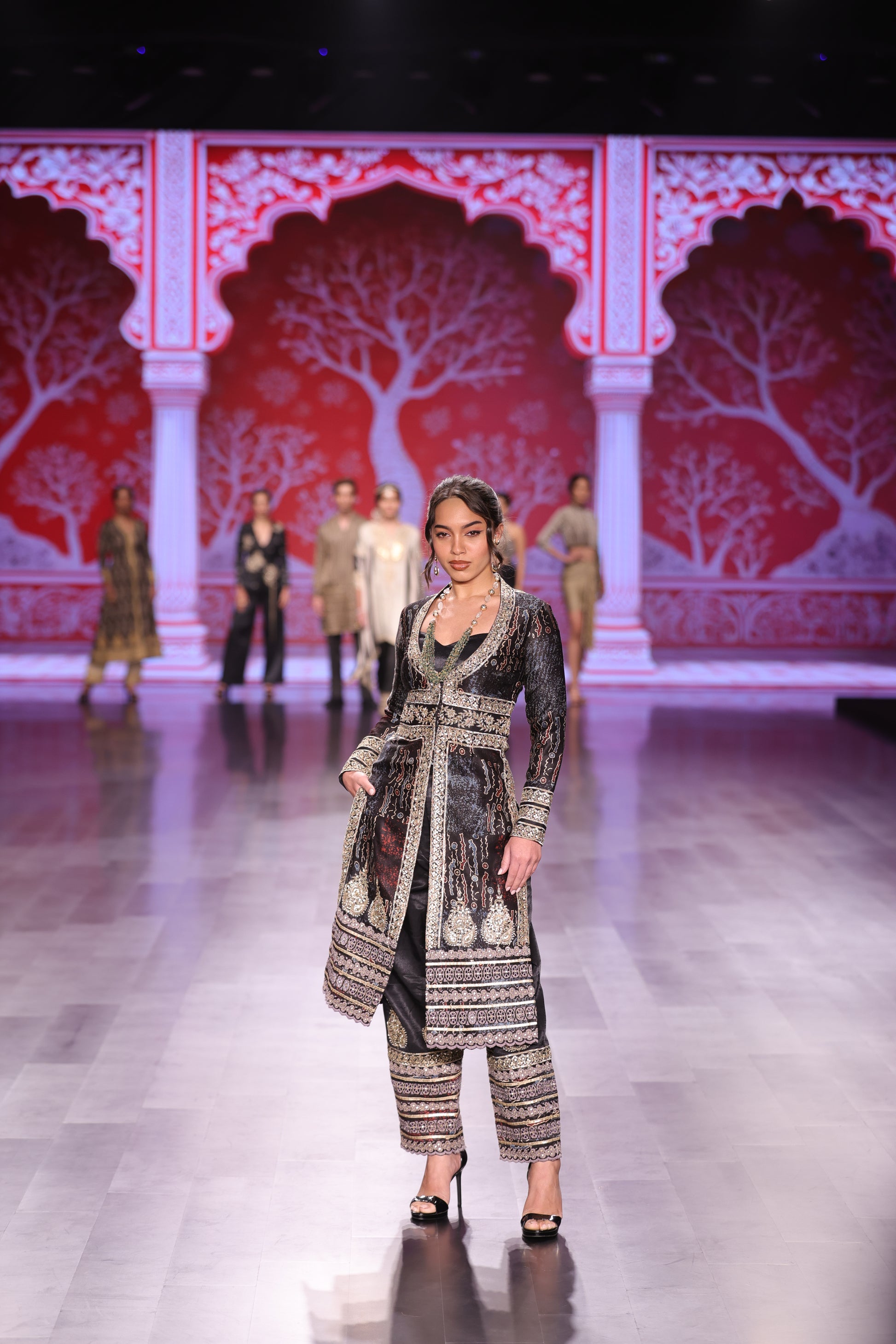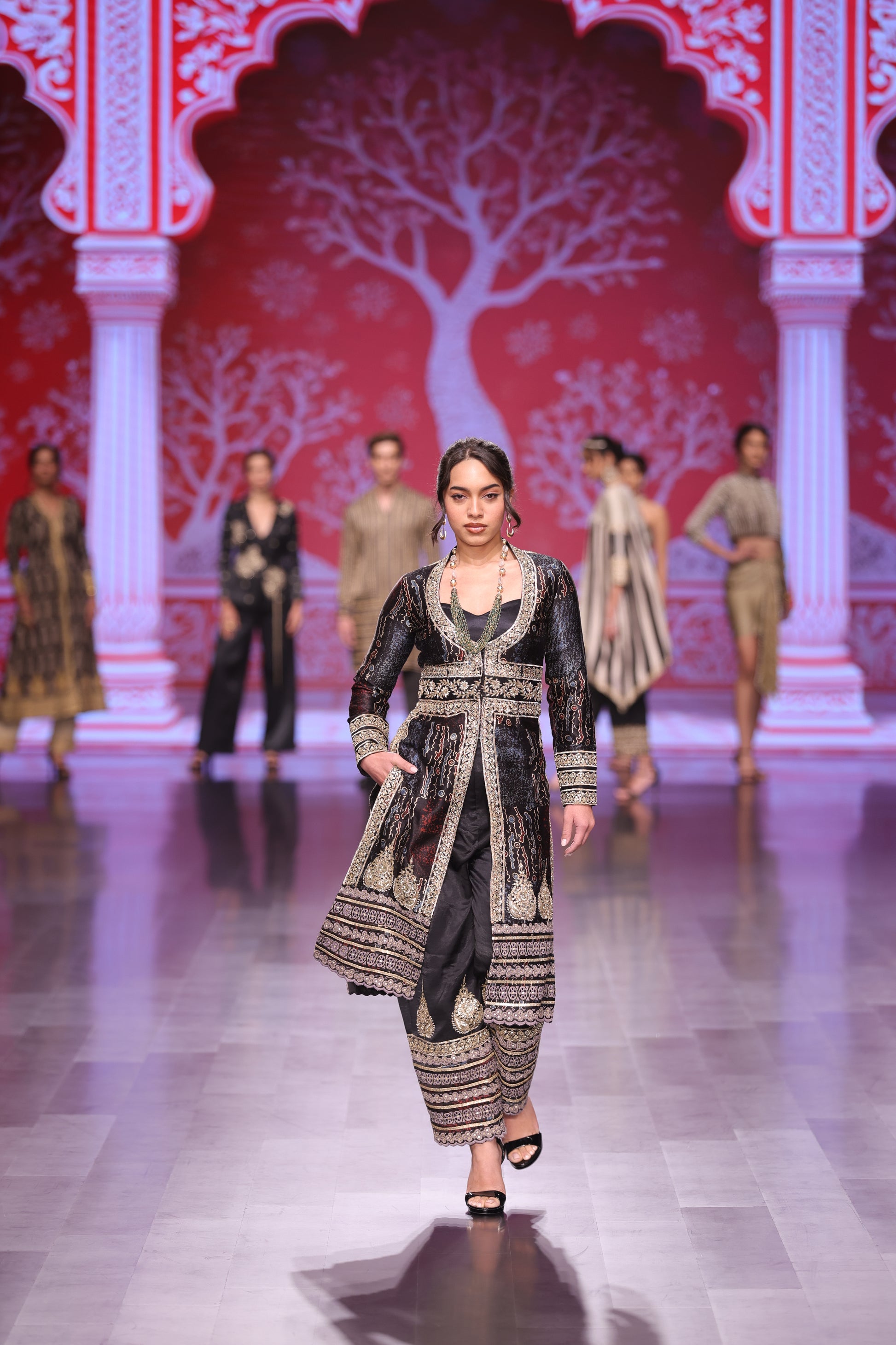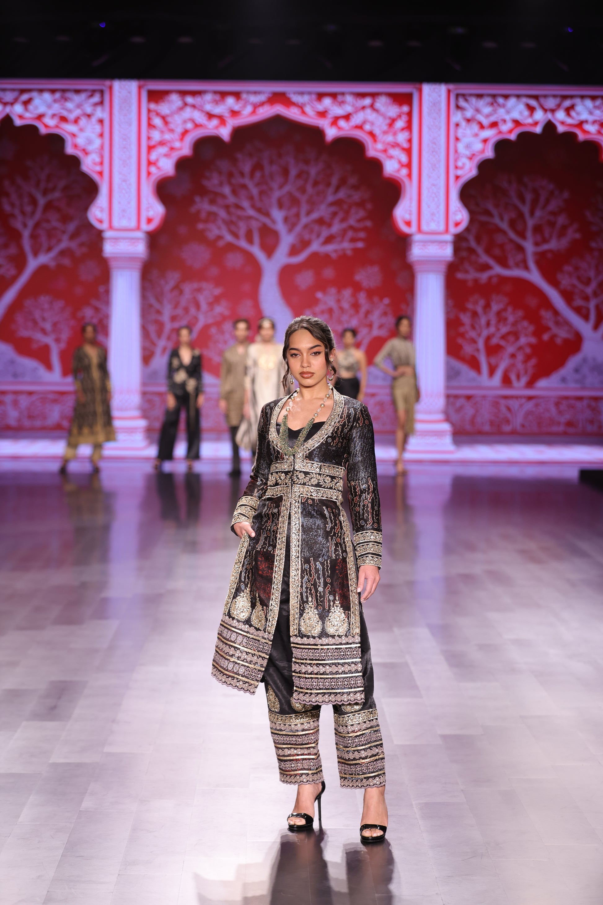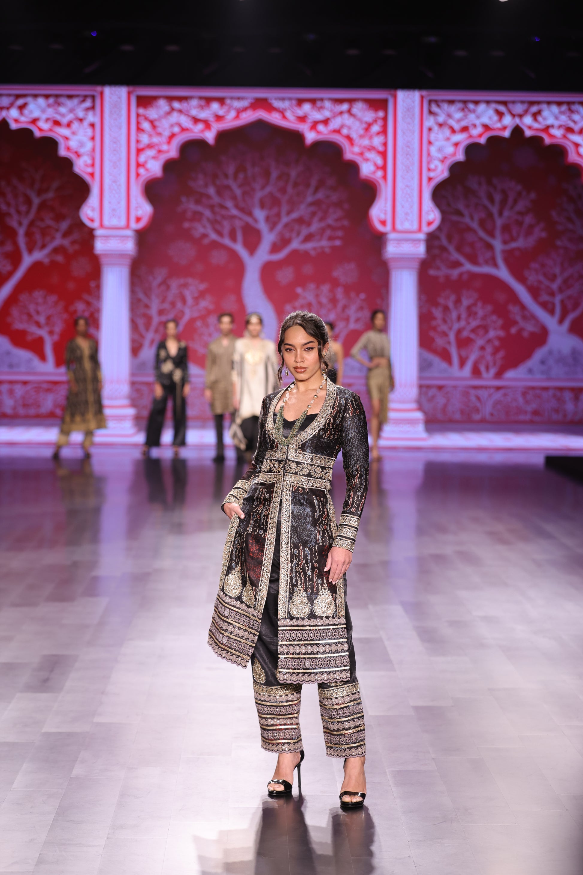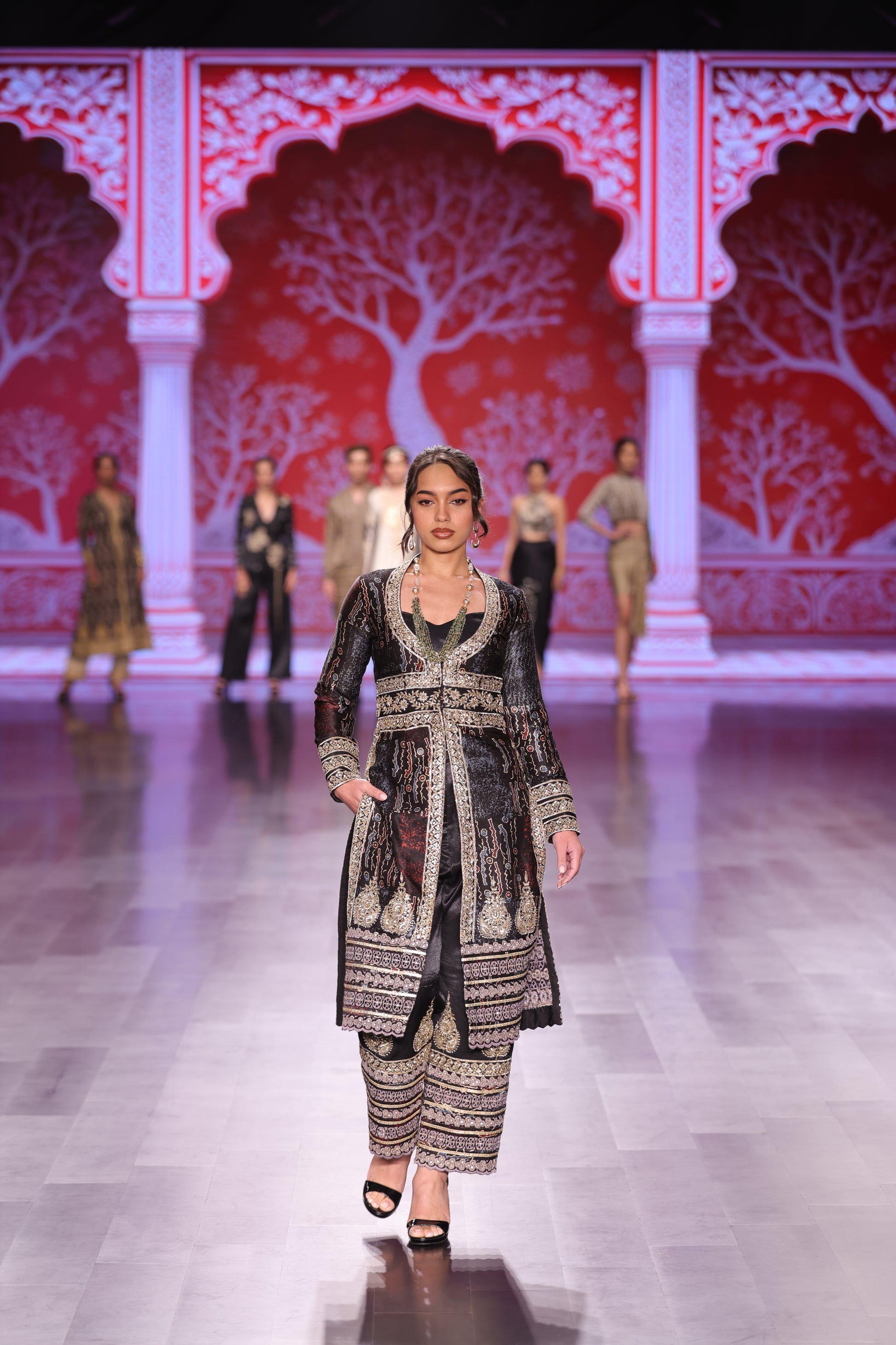 This elegant kurta and pants set is crafted in rich Mashru, featuring a timeless Ajrakh print that reflects heritage artistry. The kurta is further enhanced with delicate Sifli work, adding subtle texture and depth.