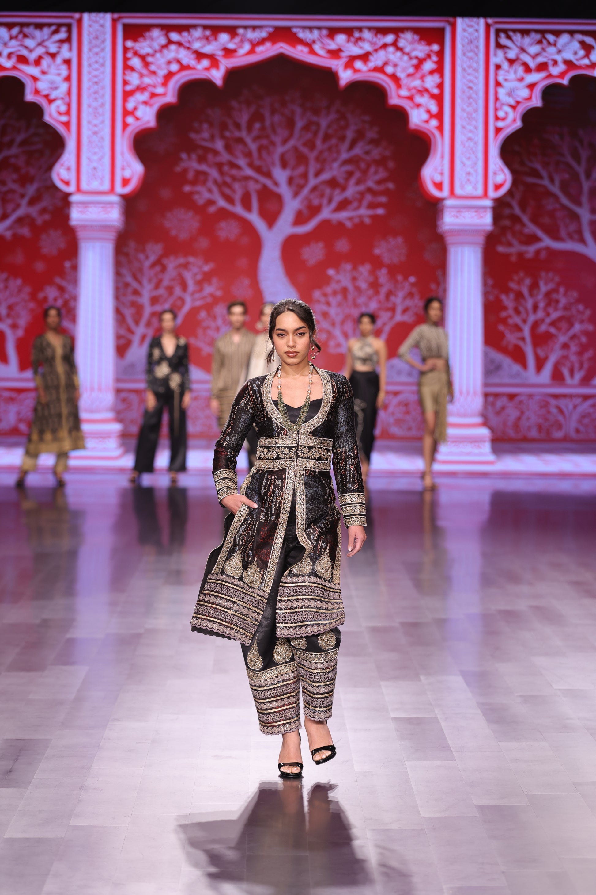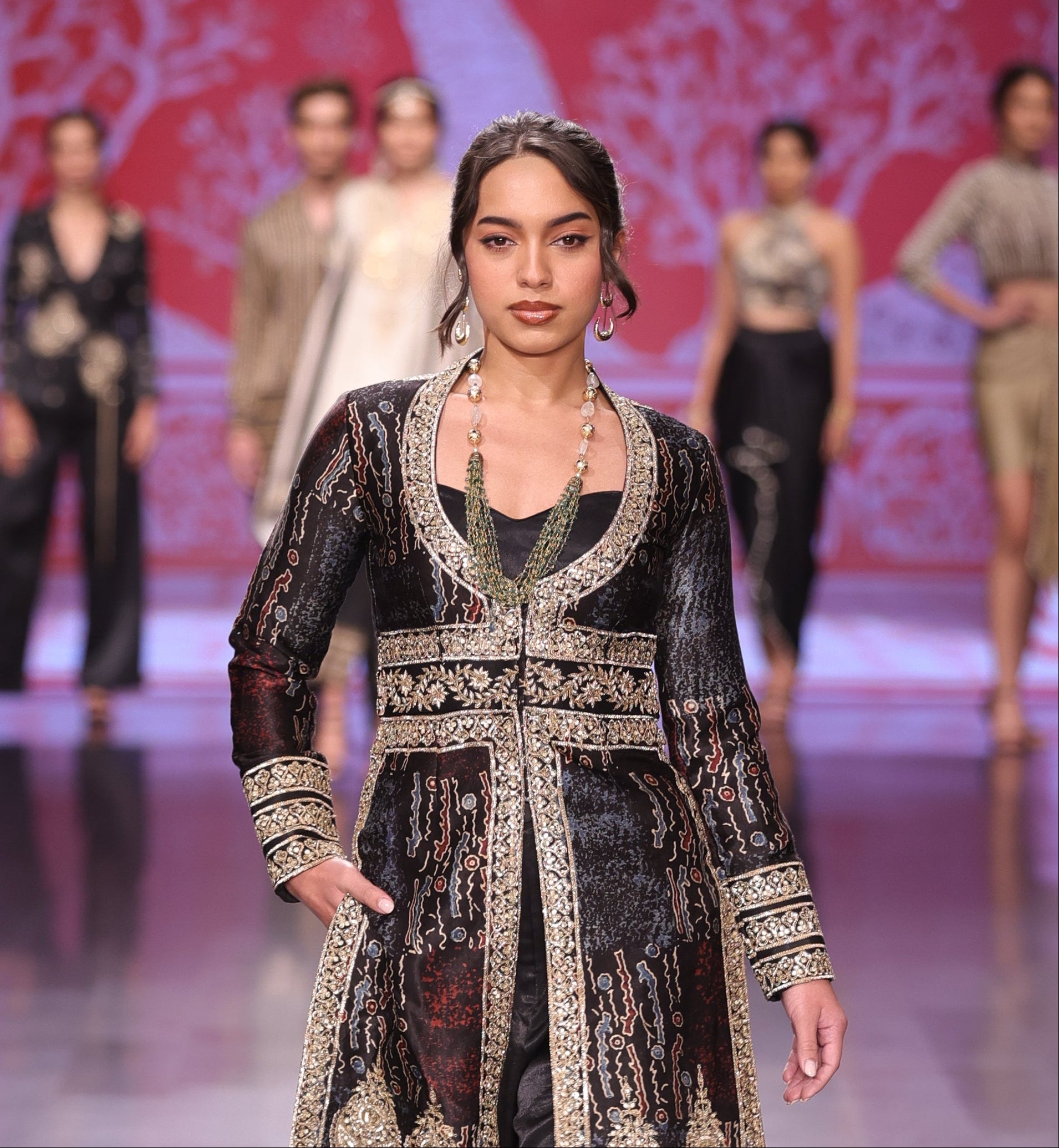 Fine Aari embroidery, paired with refined Zardozi work, elevates the ensemble with handcrafted detail and a gentle sheen. Each element is thoughtfully executed by skilled artisans, bringing together tradition and craftsmanship.