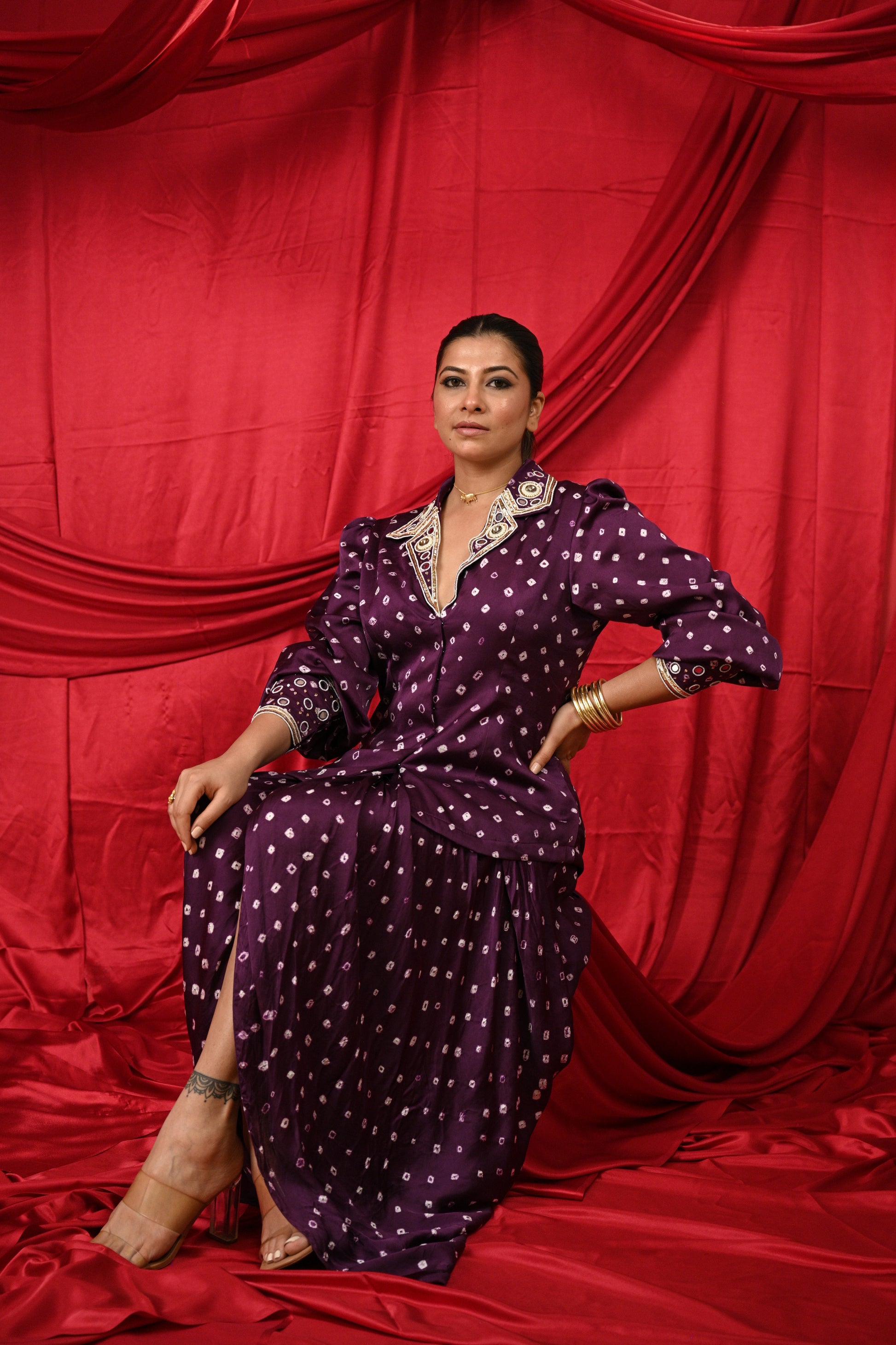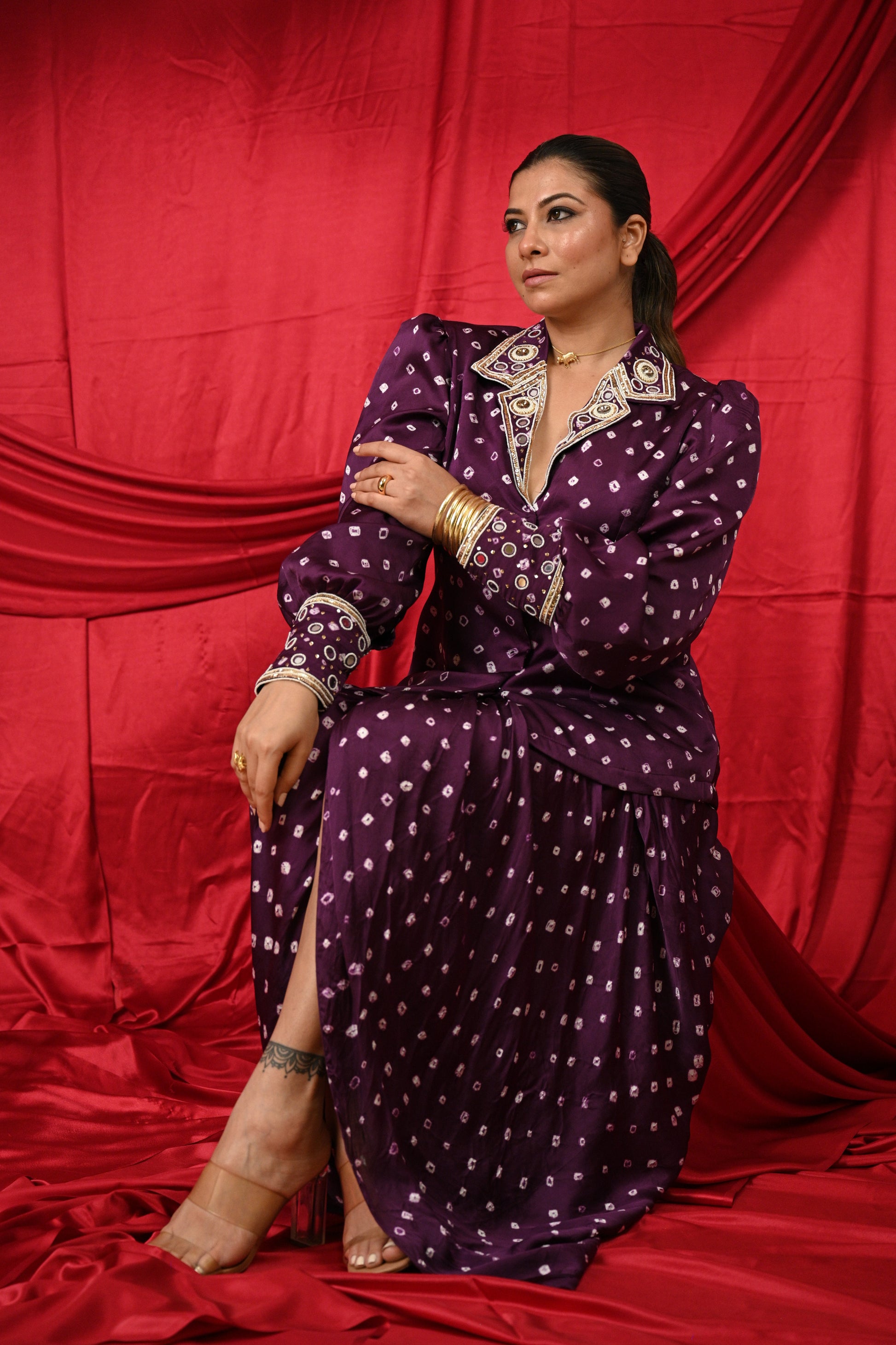 Dreamy Bandhani blazer with flapped collar highlighted with Mirror Hand Khat Work with balloon sleeves highlighted with Hand Khat Work and front open with hook-eye along with lovely cowl dothi skirt