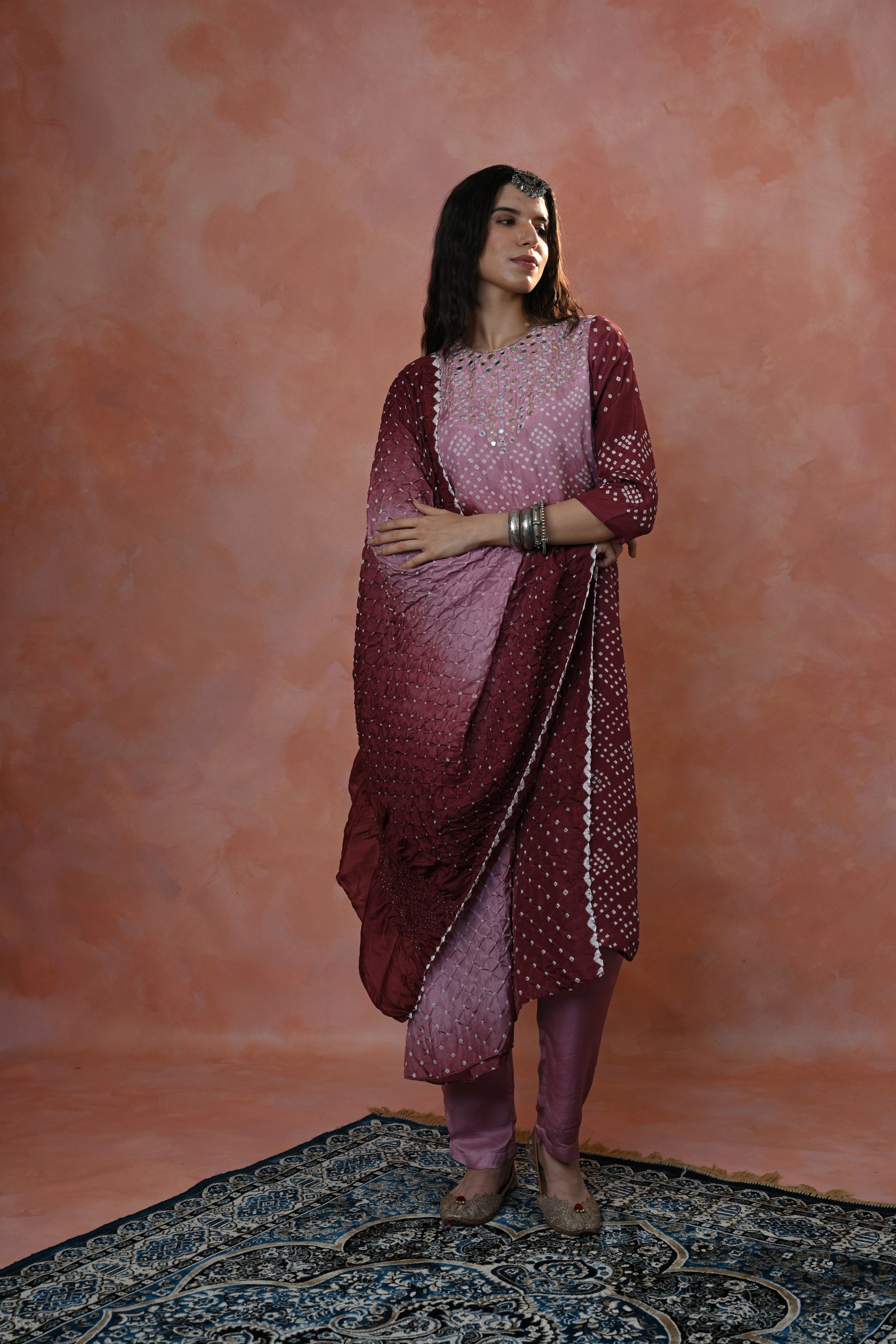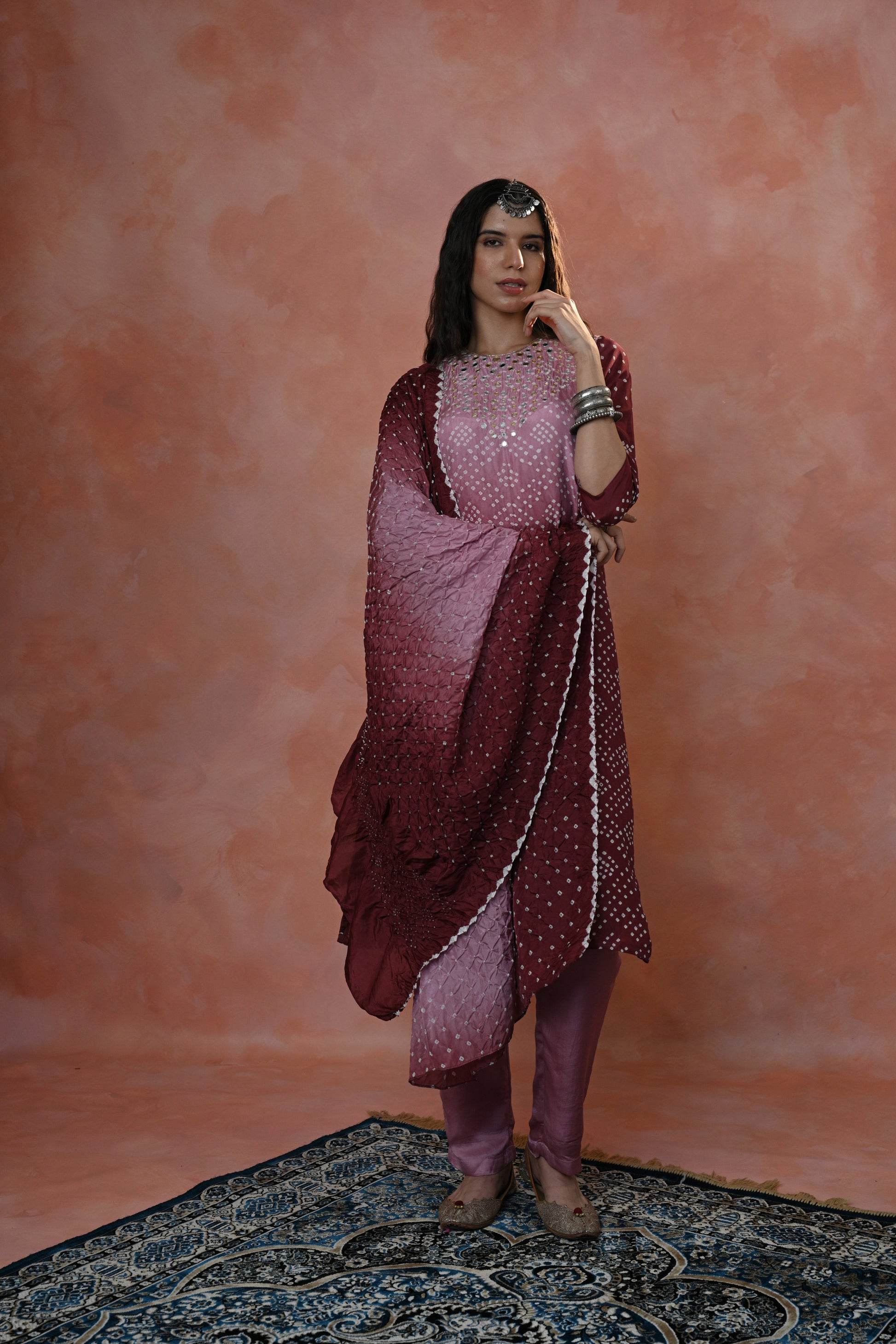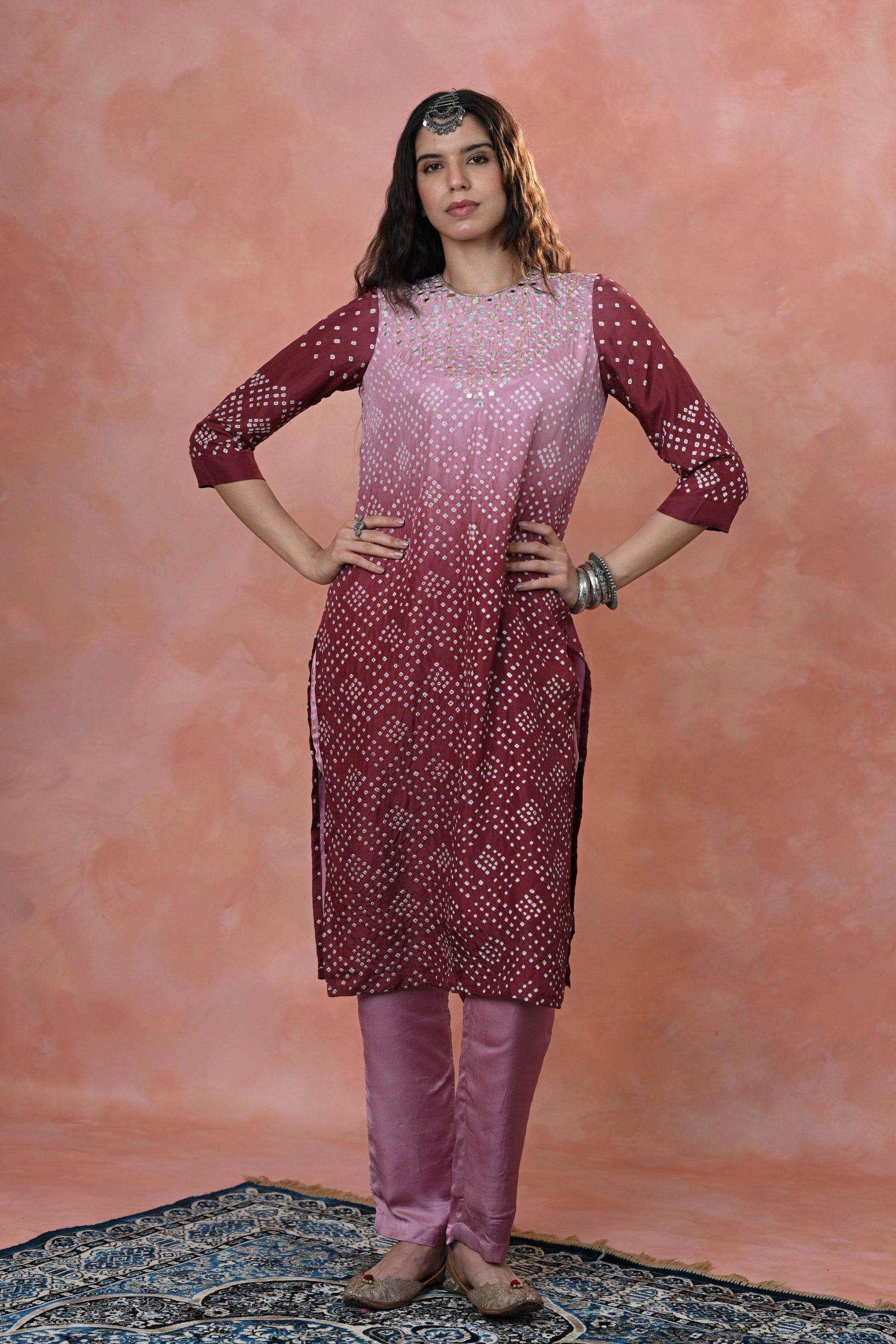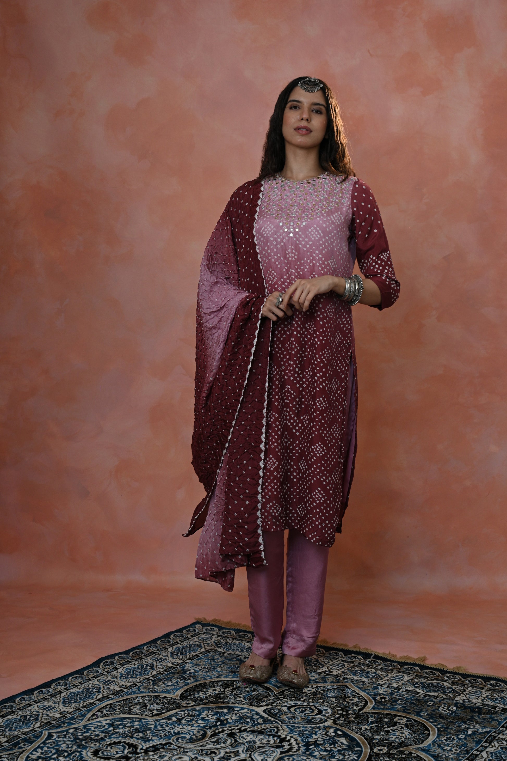 stunning Kurta Set crafted in luxurious Habutai Silk, featuring graceful ombre shades adorned with intricate Single Dot Bandhni and exquisite hand-done khat work with mirror accents.