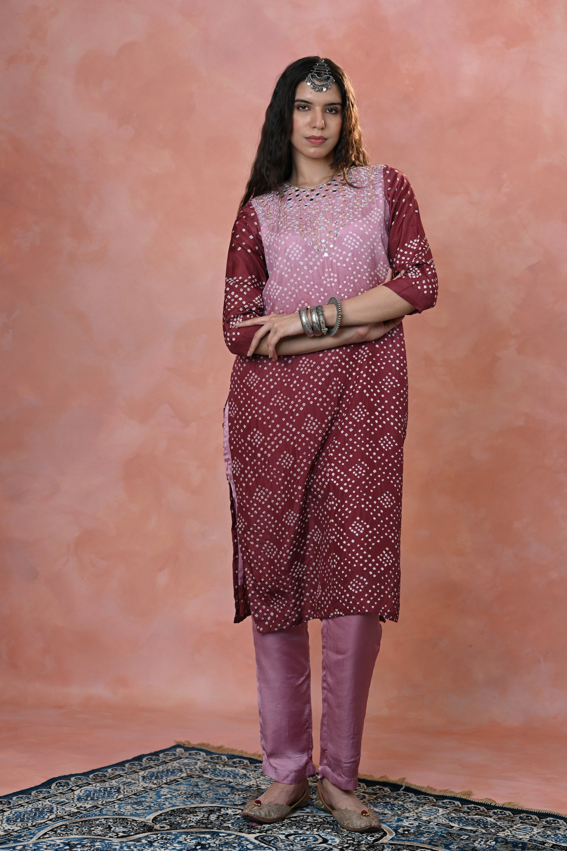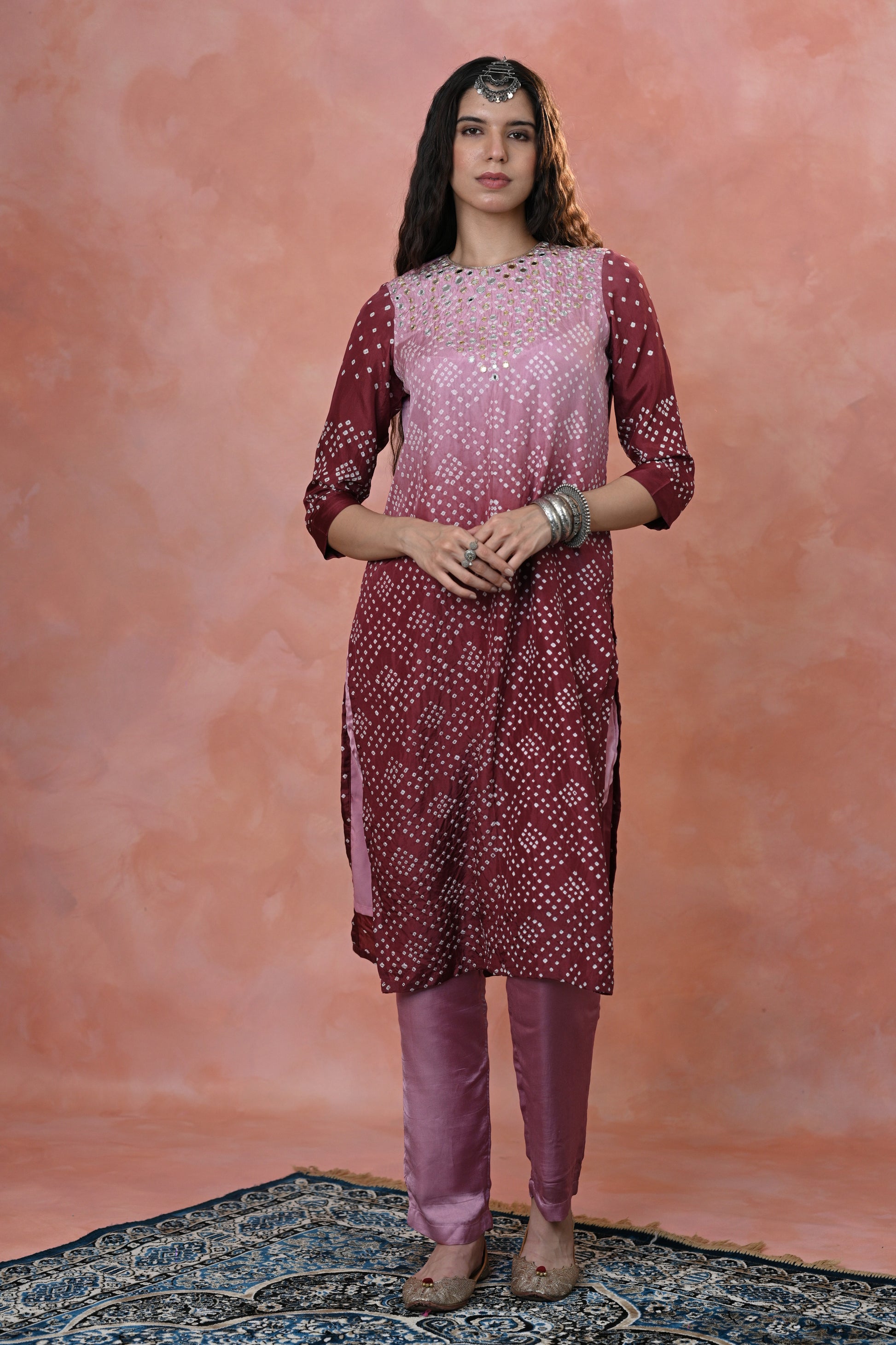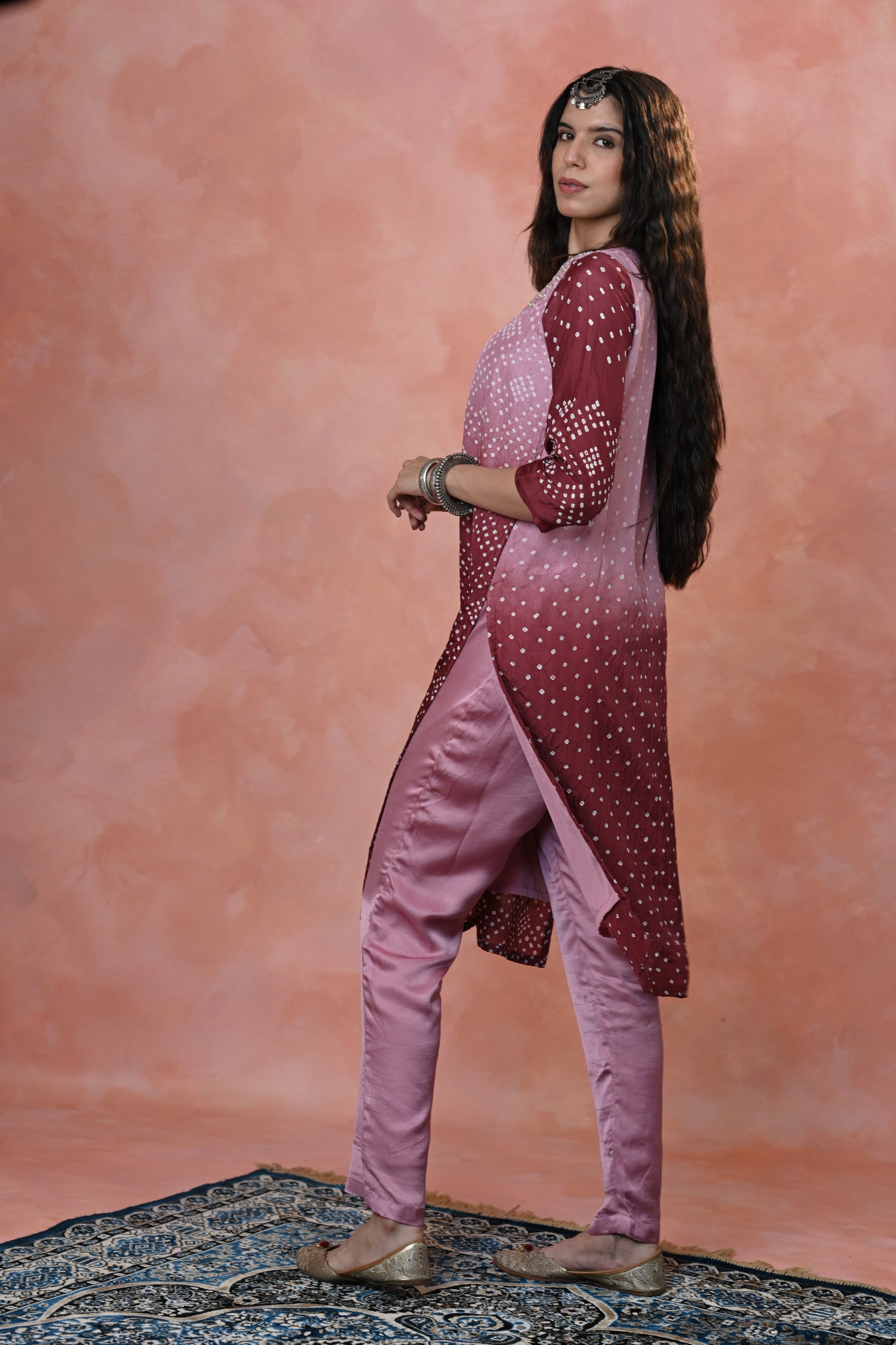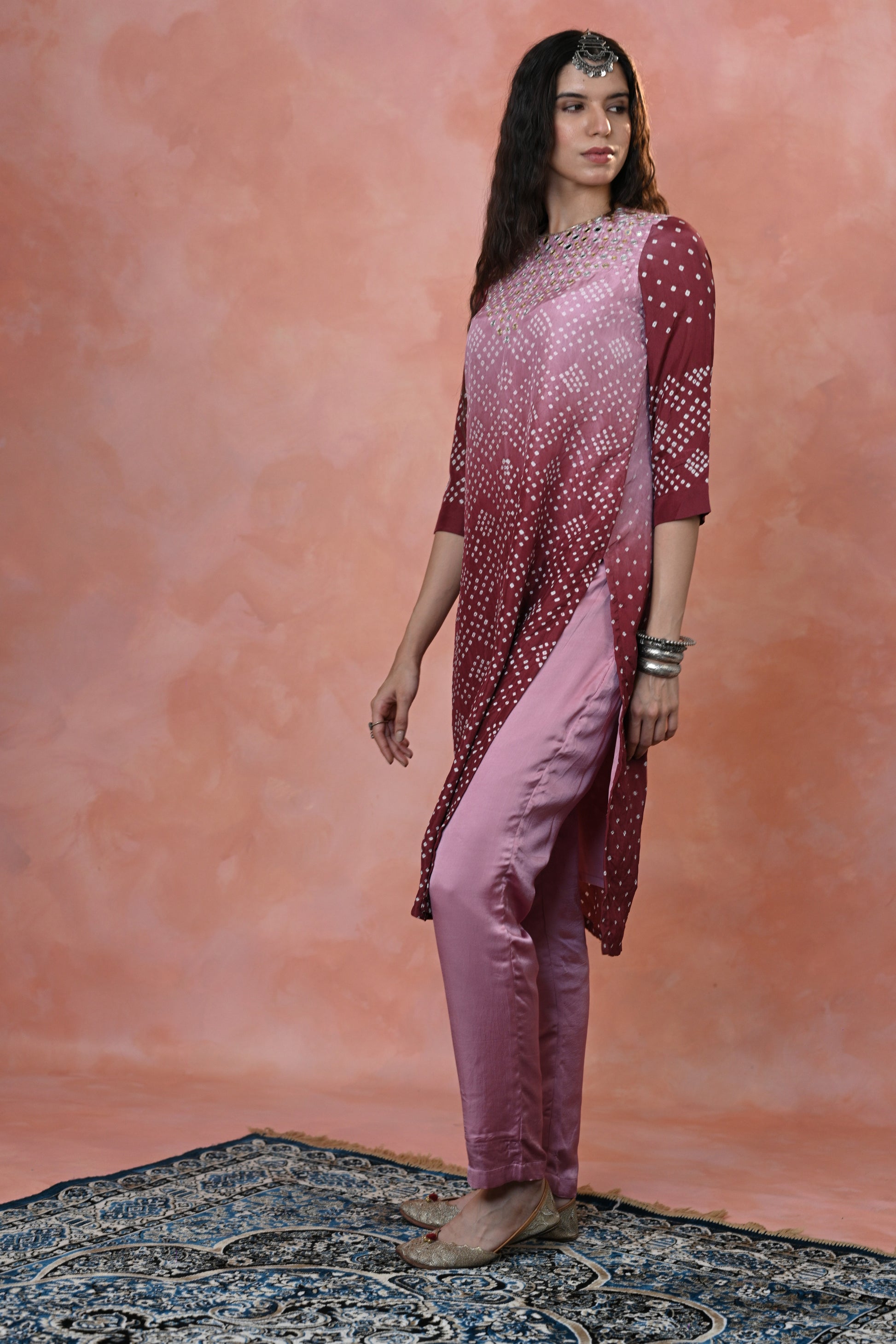 stunning Kurta Set crafted in luxurious Habutai Silk, featuring graceful ombre shades adorned with intricate Single Dot Bandhni and exquisite hand-done khat work with mirror accents.