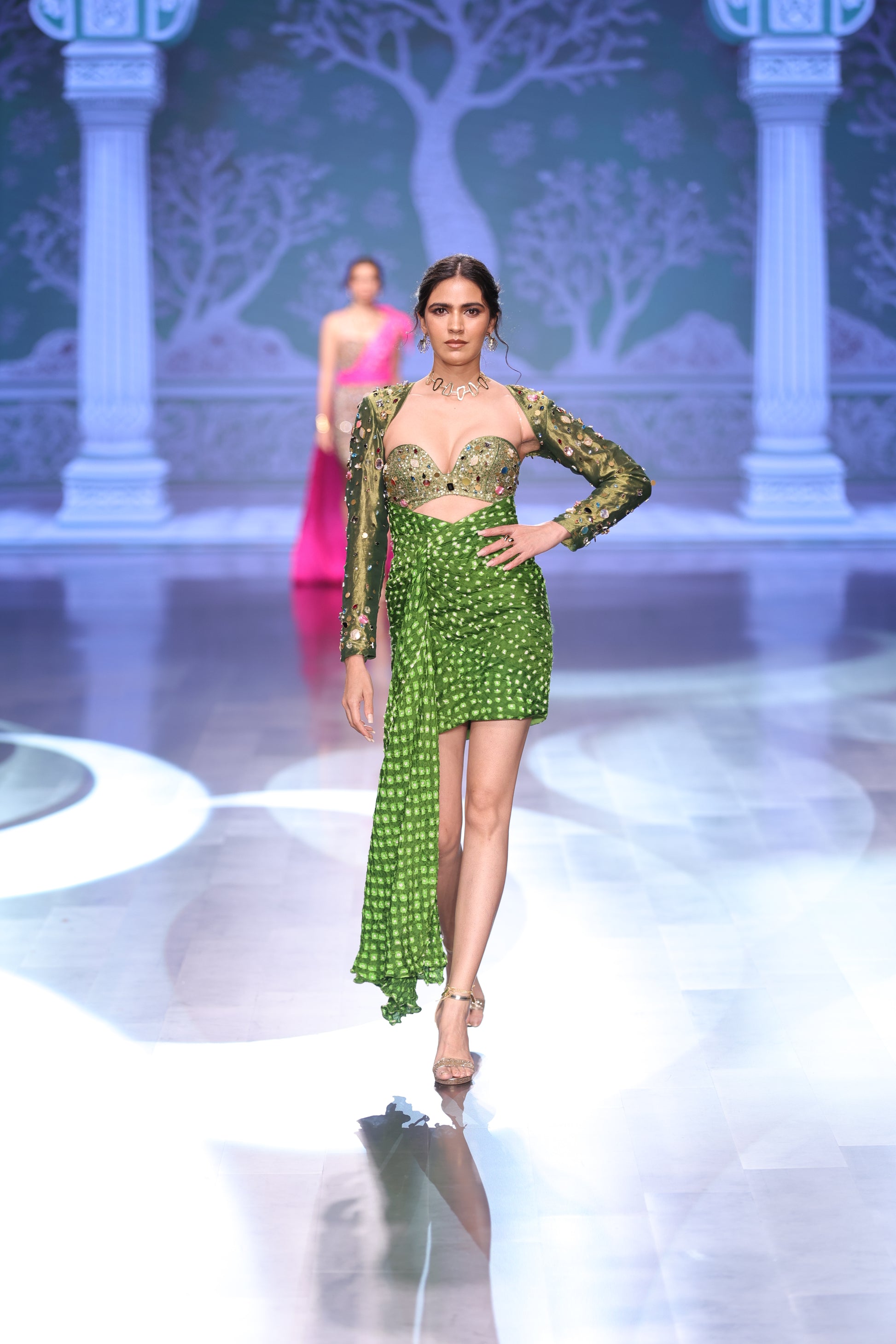This elegant ensemble features a cape and one-piece, designed to bring together fluid layers and rich textures. The cape, crafted in shine tissue, adds a luminous finish and graceful movement.