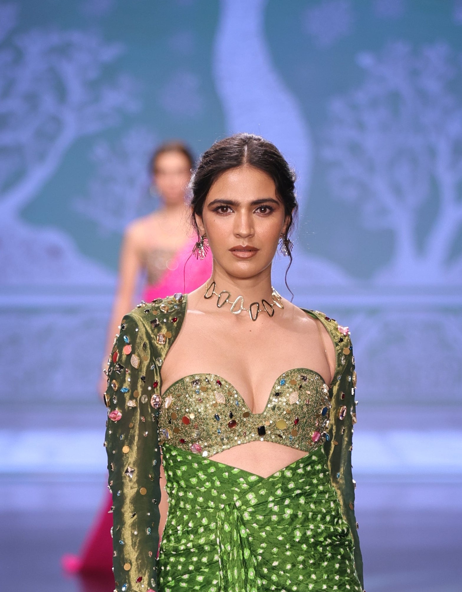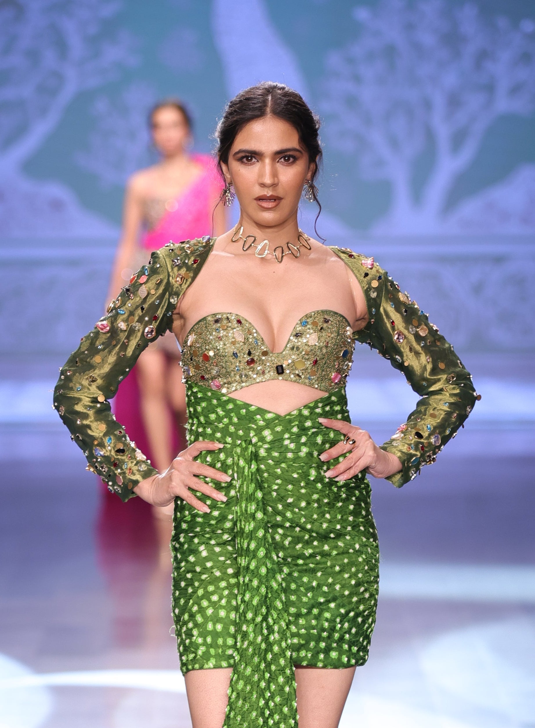 The one-piece, made in a blend of tissue and Gajji Bandhani, offers depth and traditional charm with a refined drape. Delicate stone work, enhanced with subtle embellished detailing, adds texture and gentle sparkle, elevating the ensemble with handcrafted finesse.
