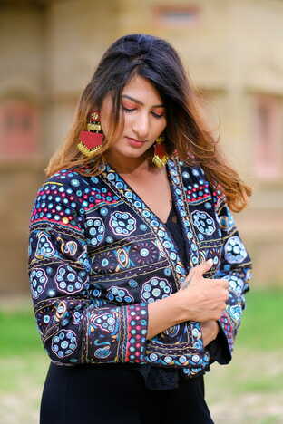 These hand embroidered jackets can be styled with almost any outfit and has a fusion of three Hand embroidery art forms of Kutch.