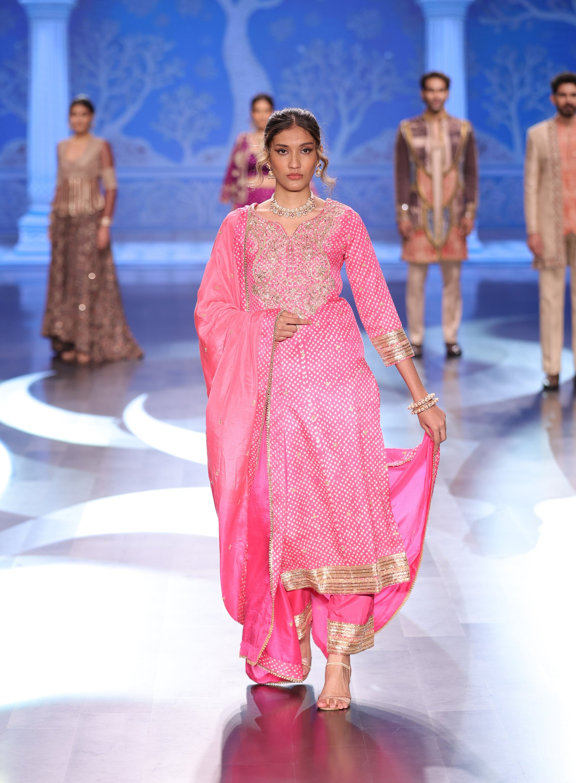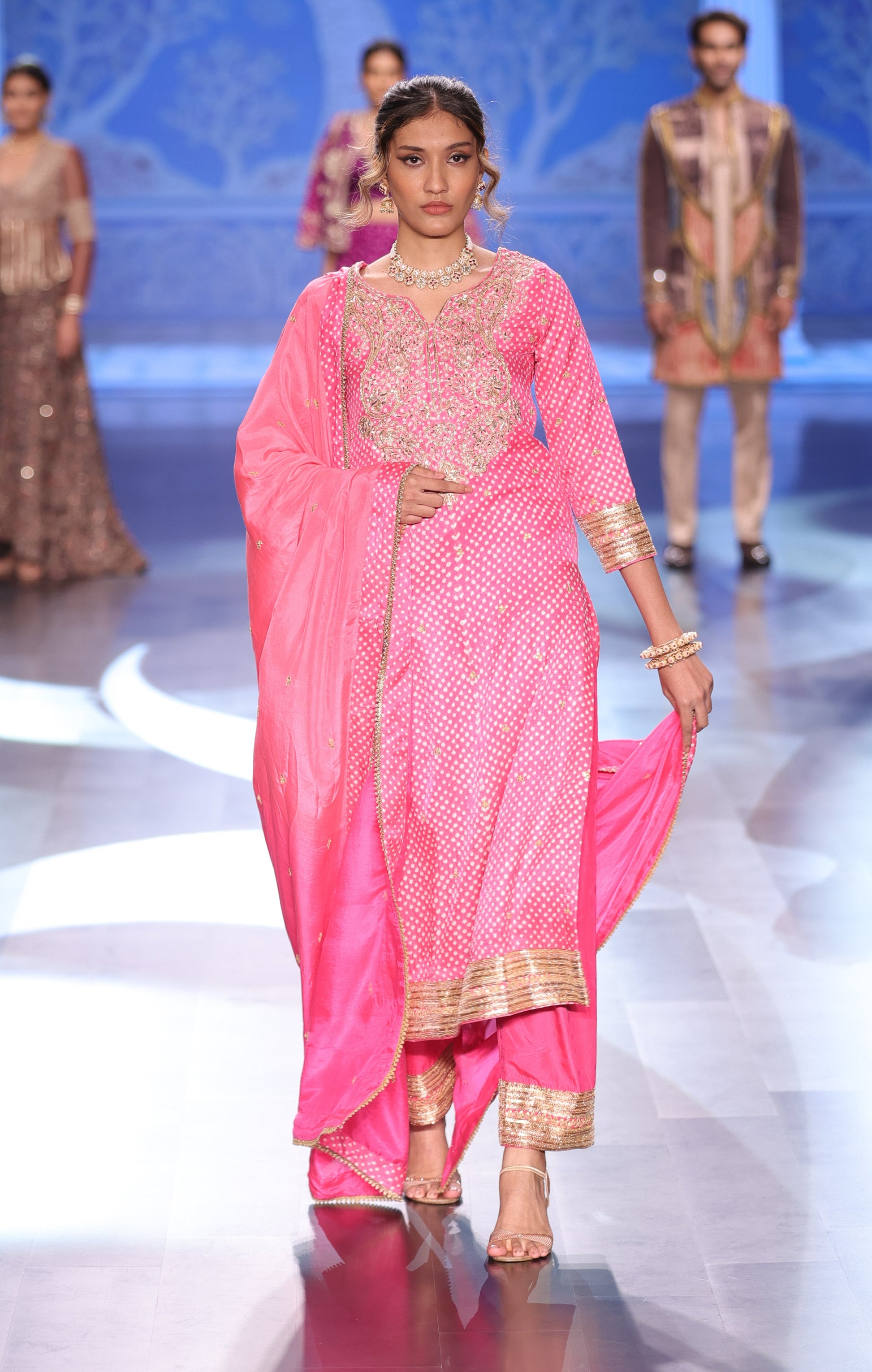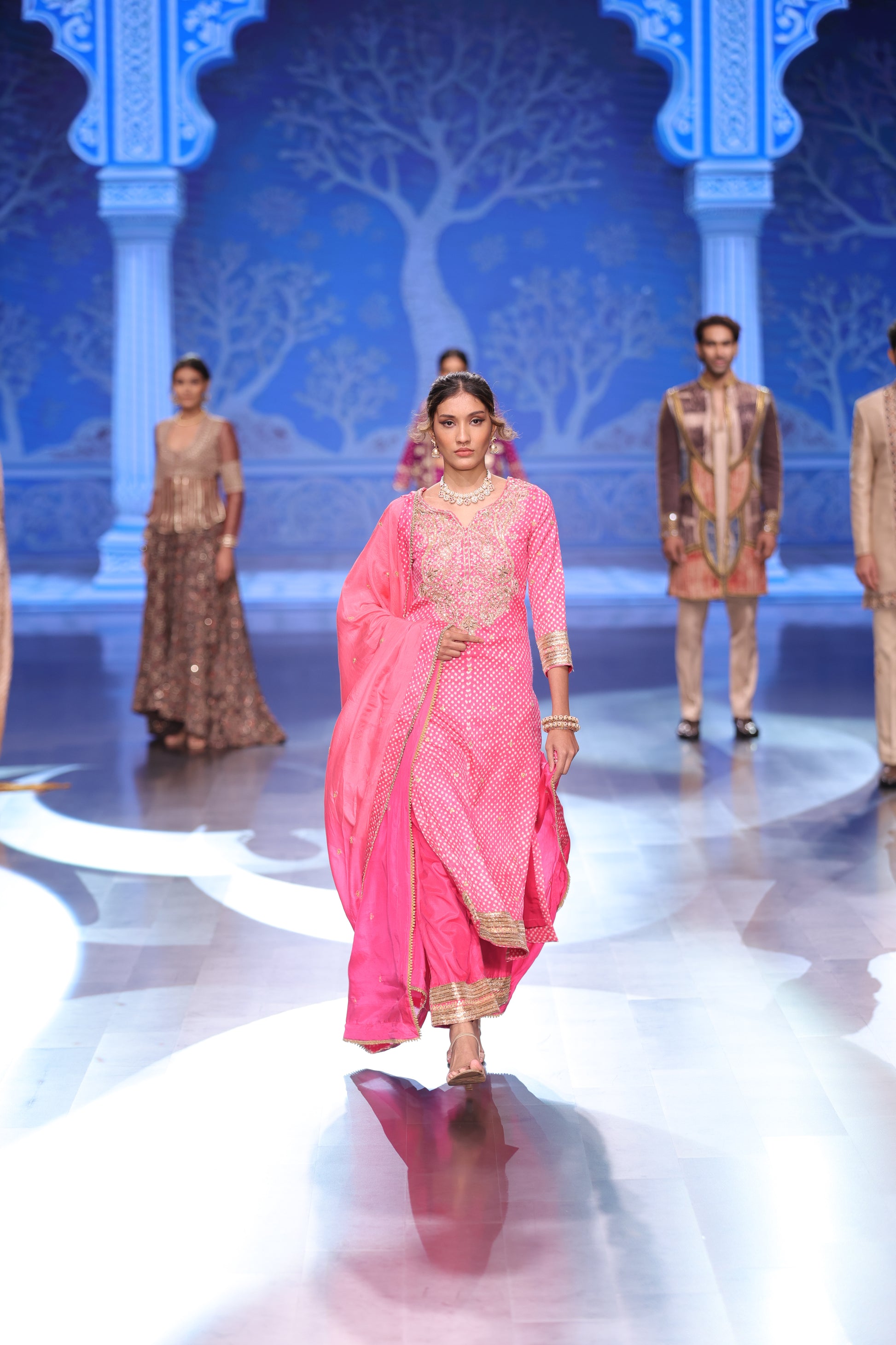 This elegant kurta set with dupatta brings together heritage textiles and refined craftsmanship. The kurta is crafted in rich Gajji Bandhani, offering depth and traditional charm, while the bottom and dupatta are made in lightweight Habutai, creating a soft and graceful contrast.