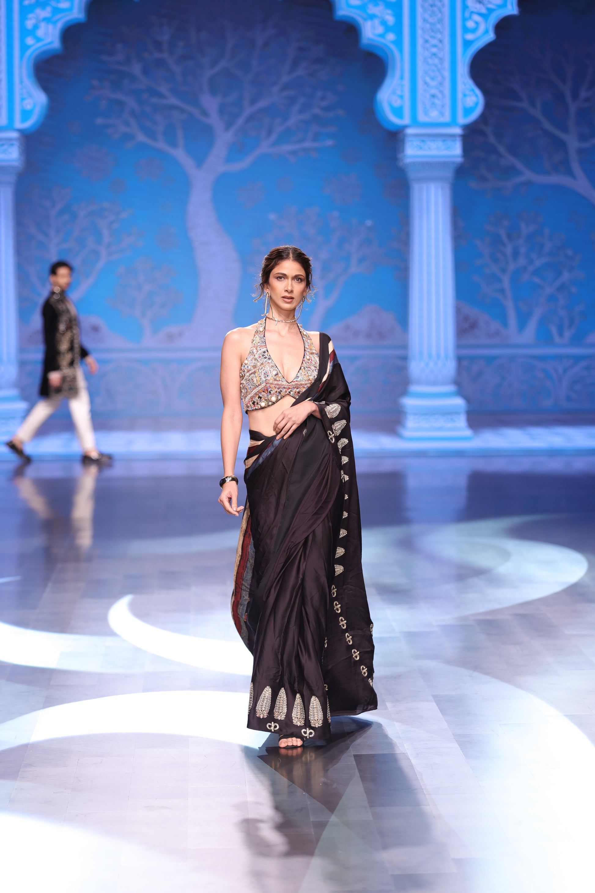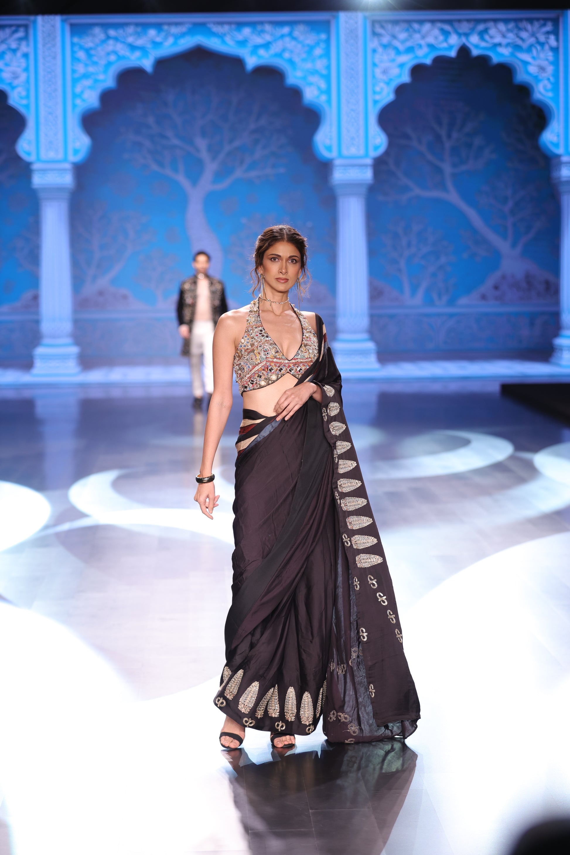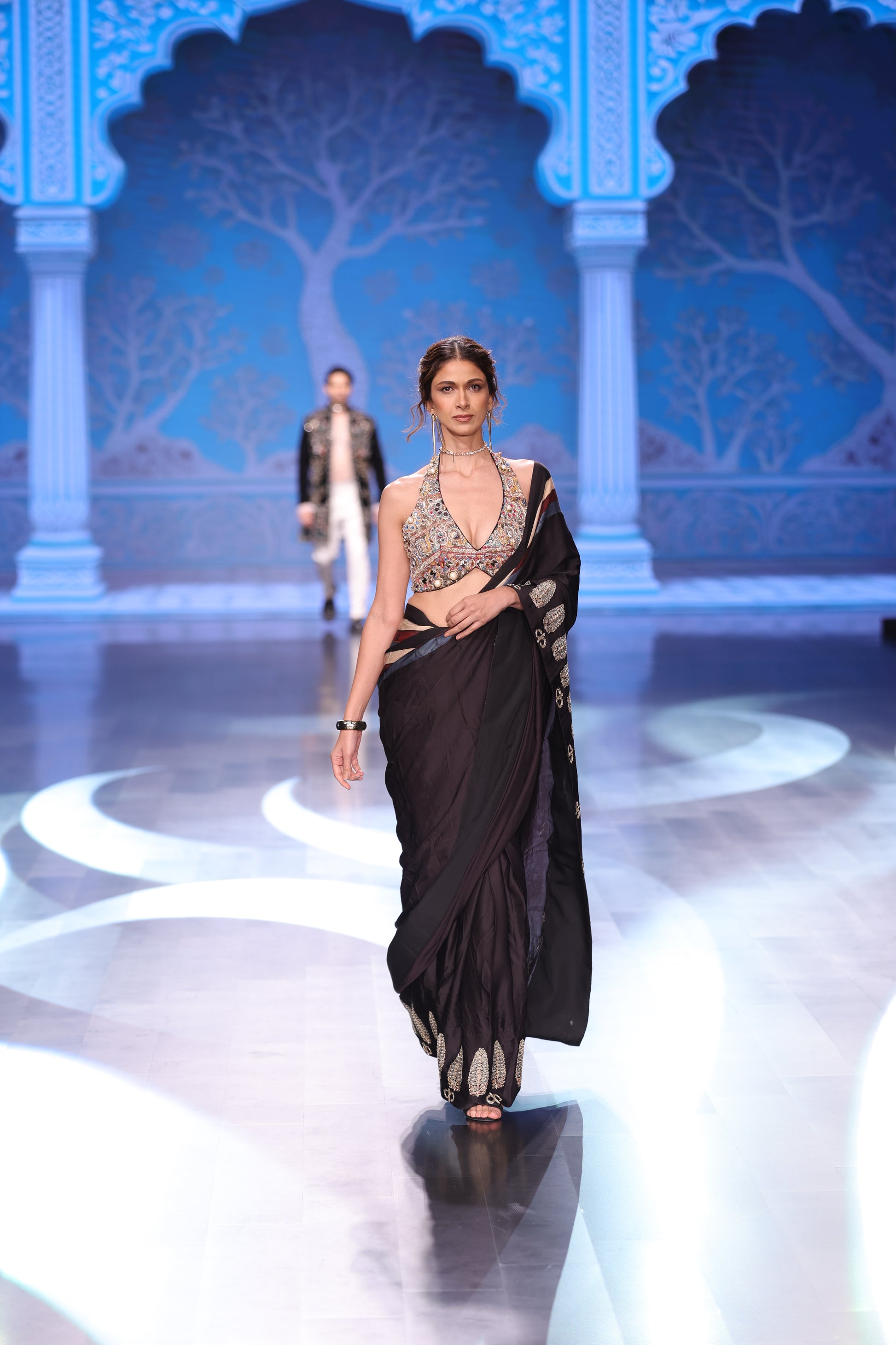 Paired with a Black Asopalav Ajrakh pre-draped saree, created using the traditional hand block printing technique, the ensemble blends heritage craft with modern ease.