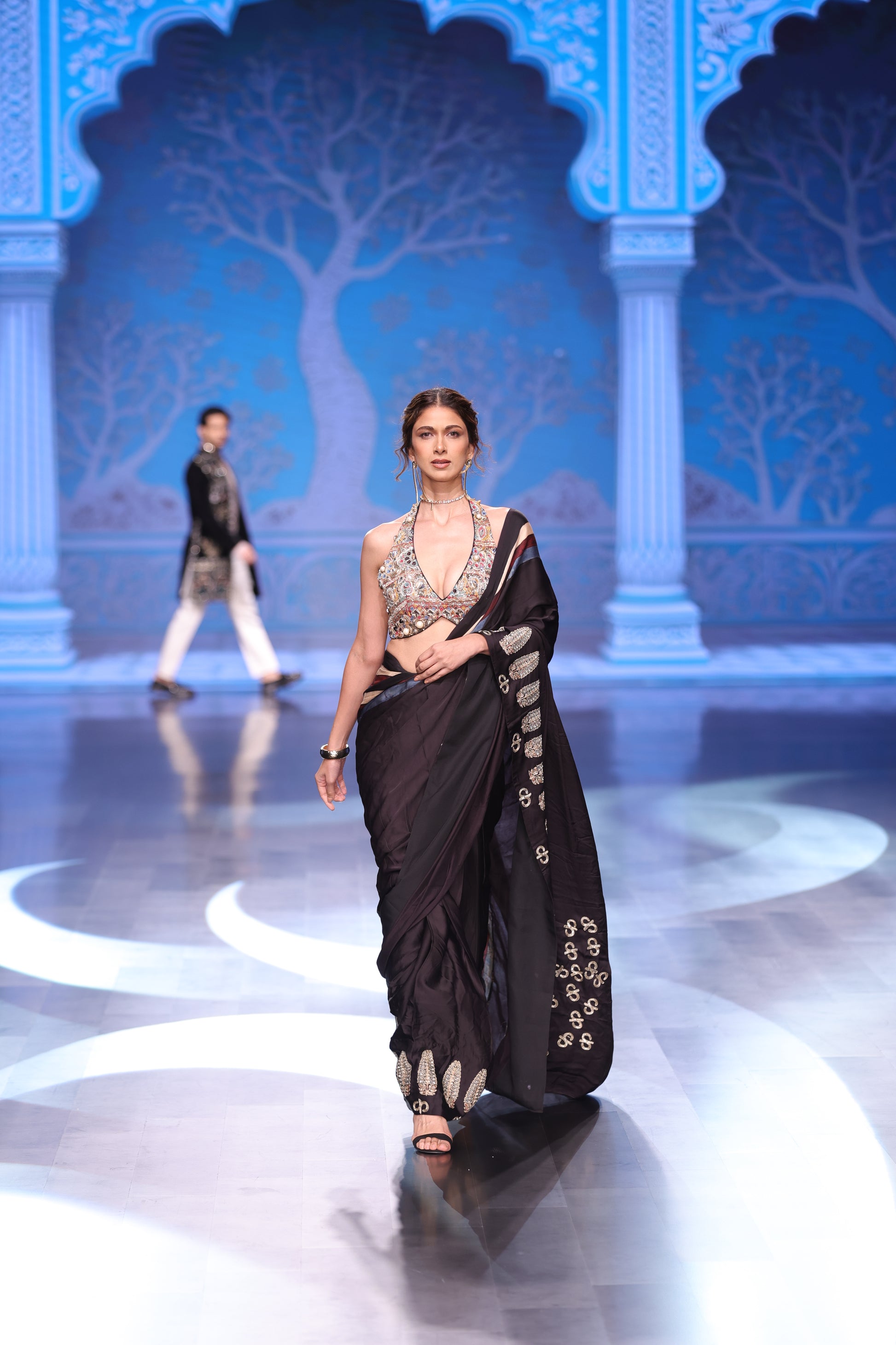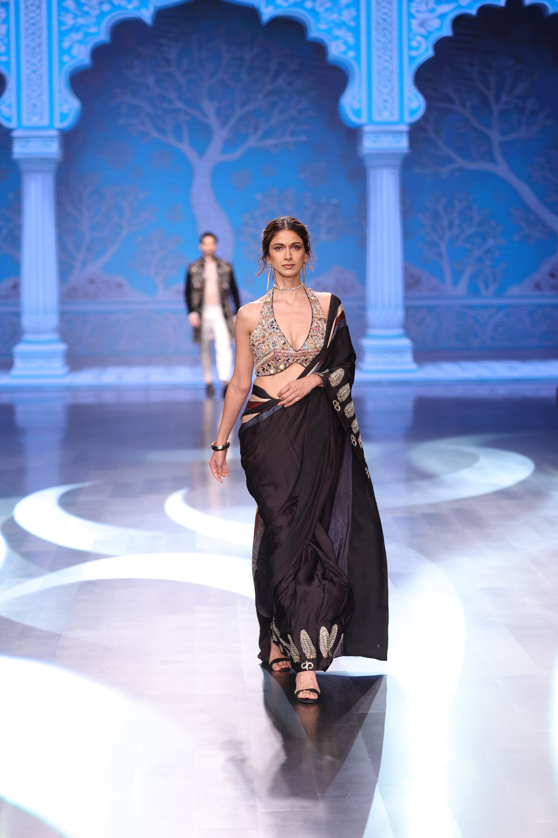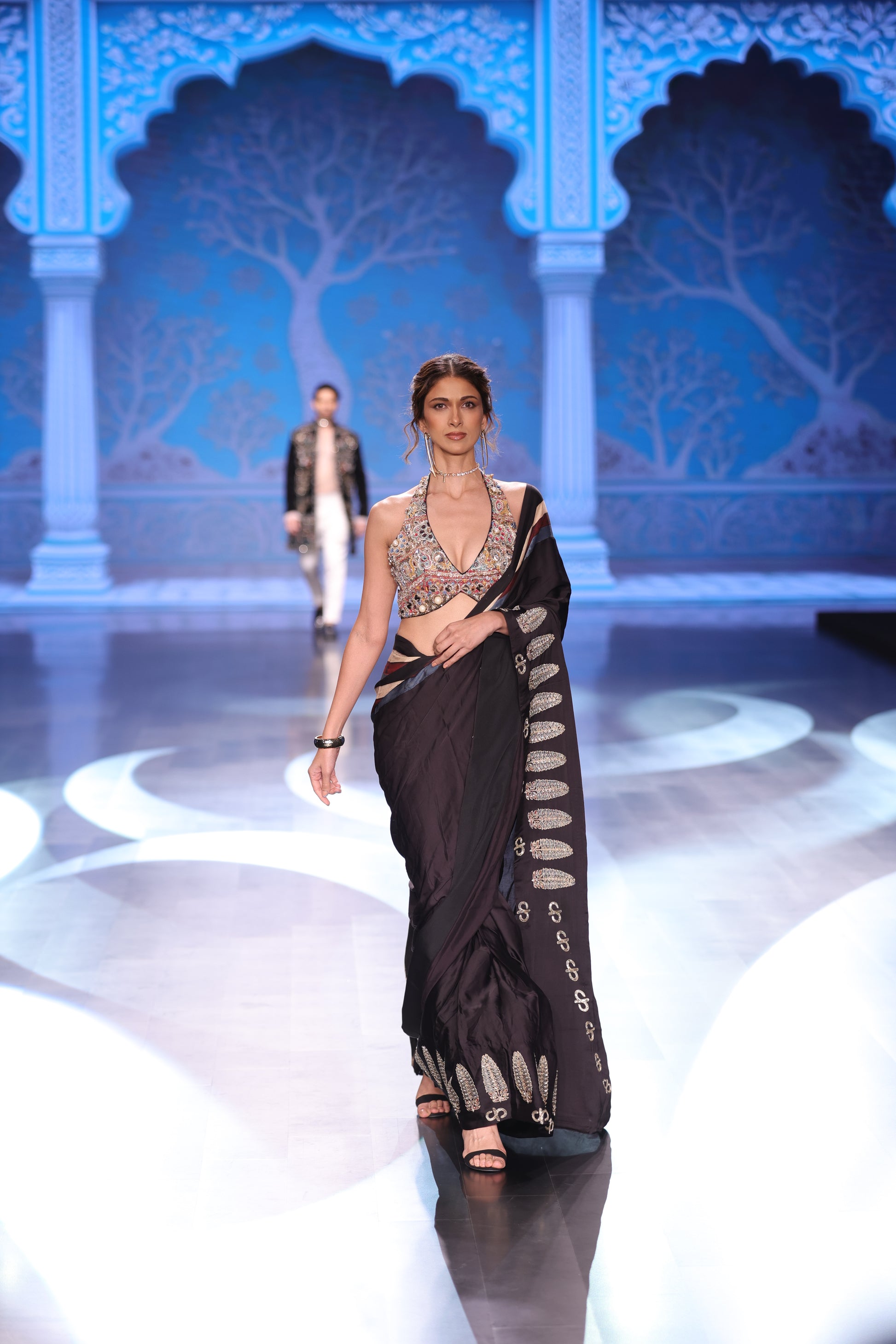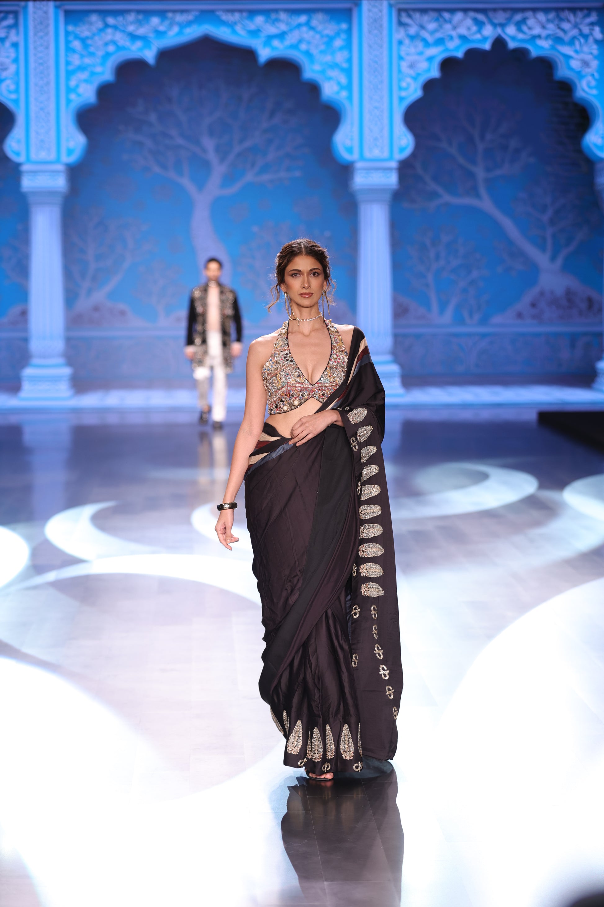Paired with a Black Asopalav Ajrakh pre-draped saree, created using the traditional hand block printing technique, the ensemble blends heritage craft with modern ease.