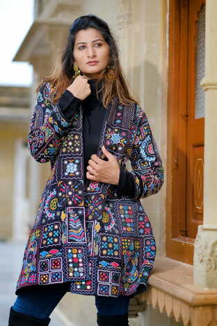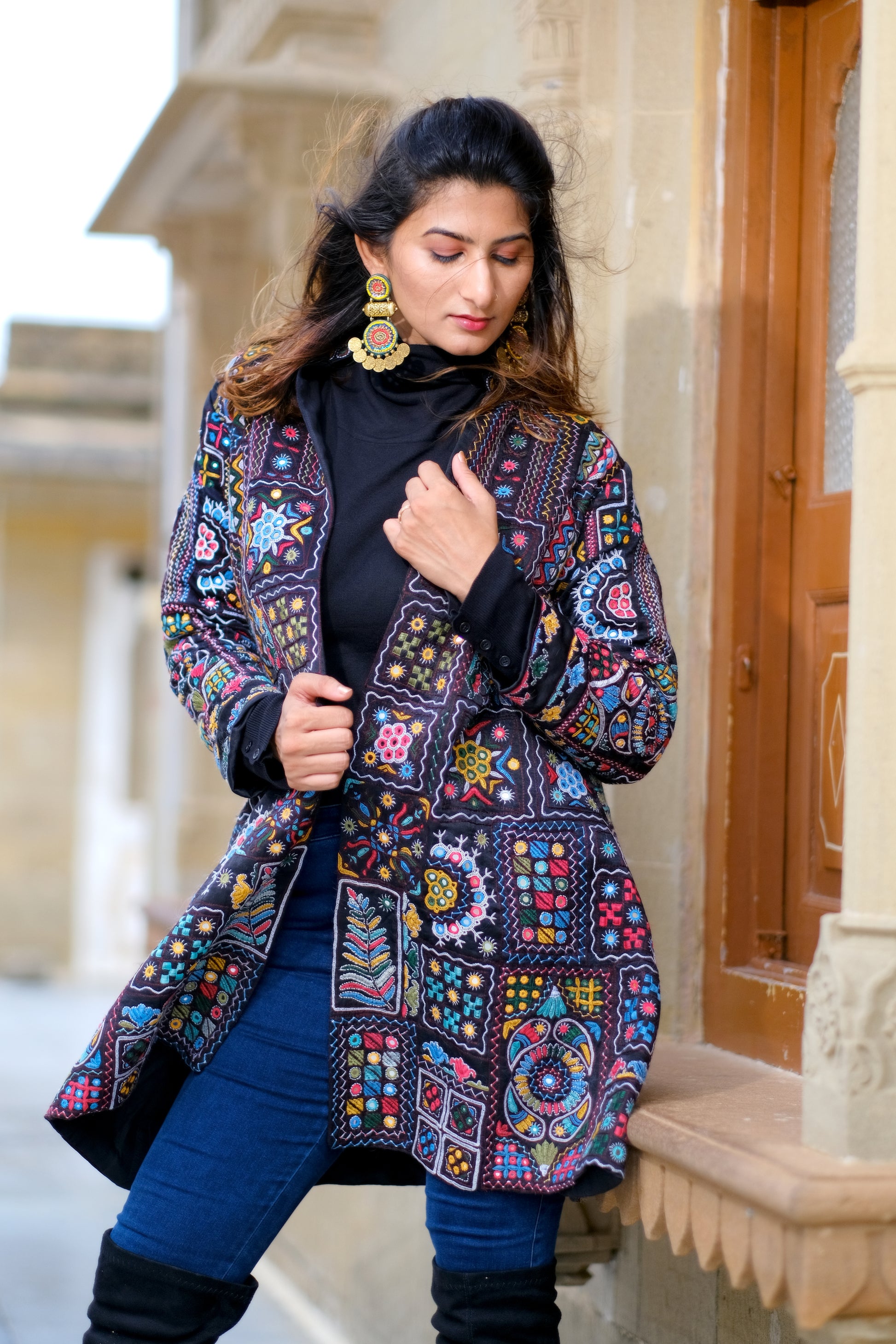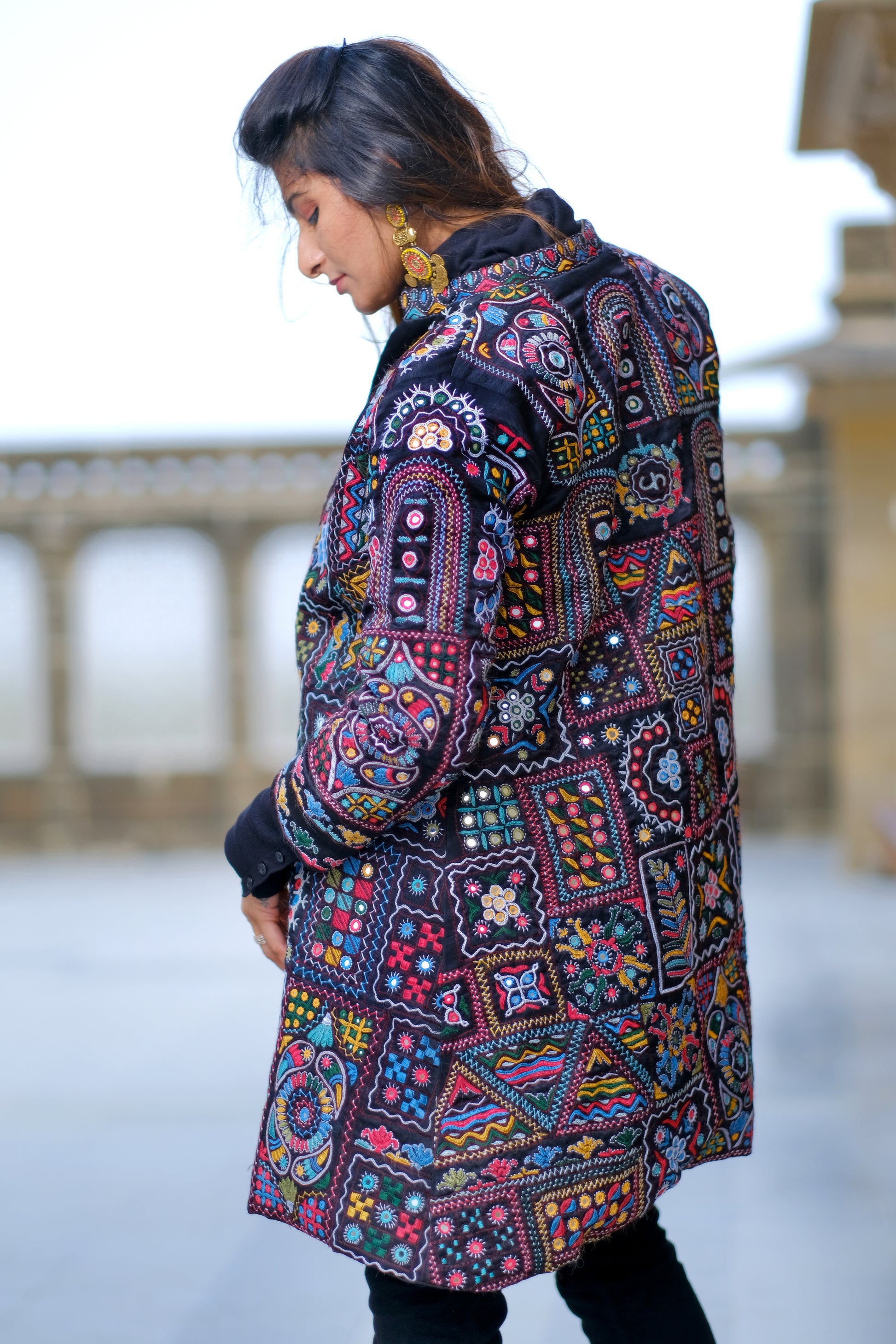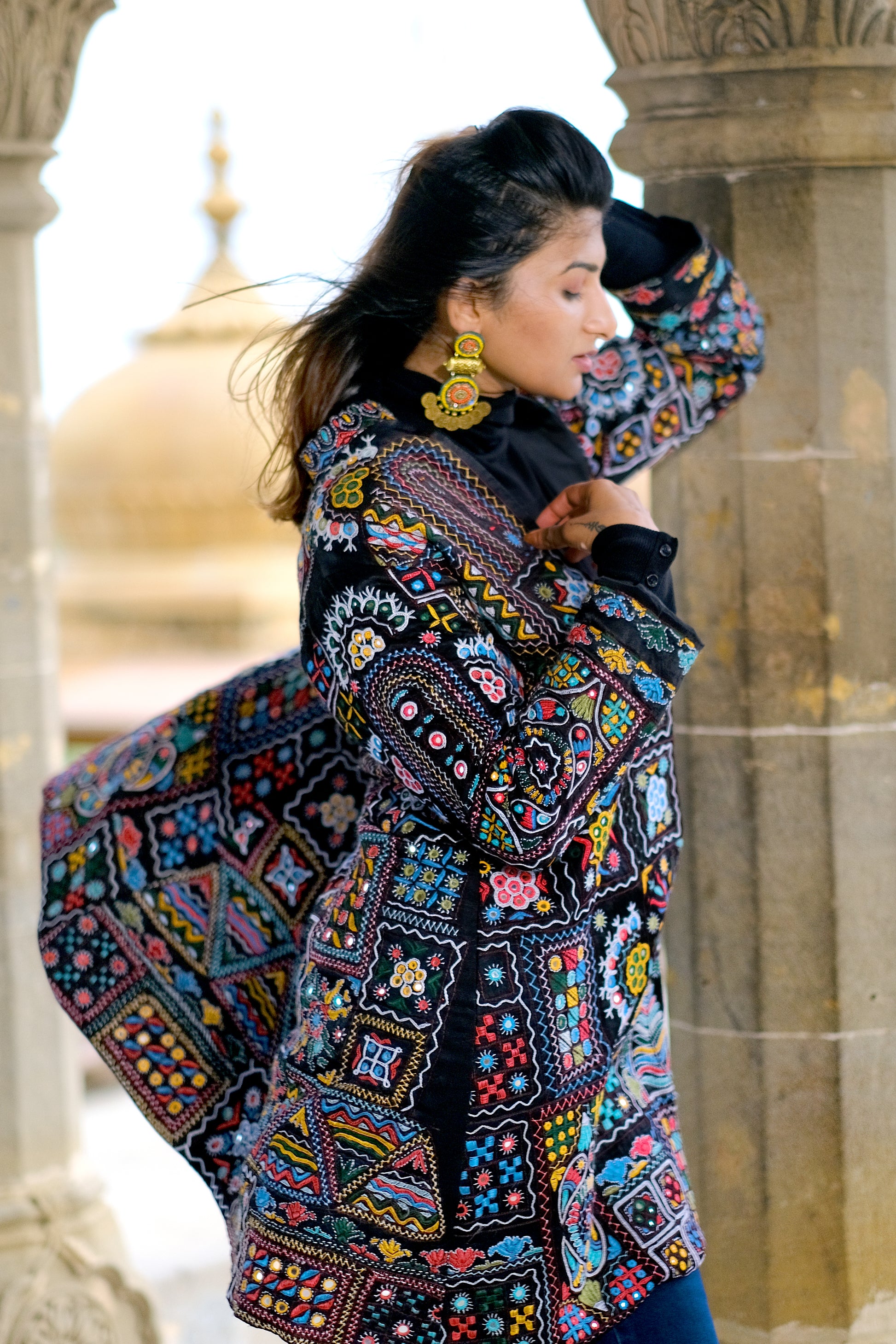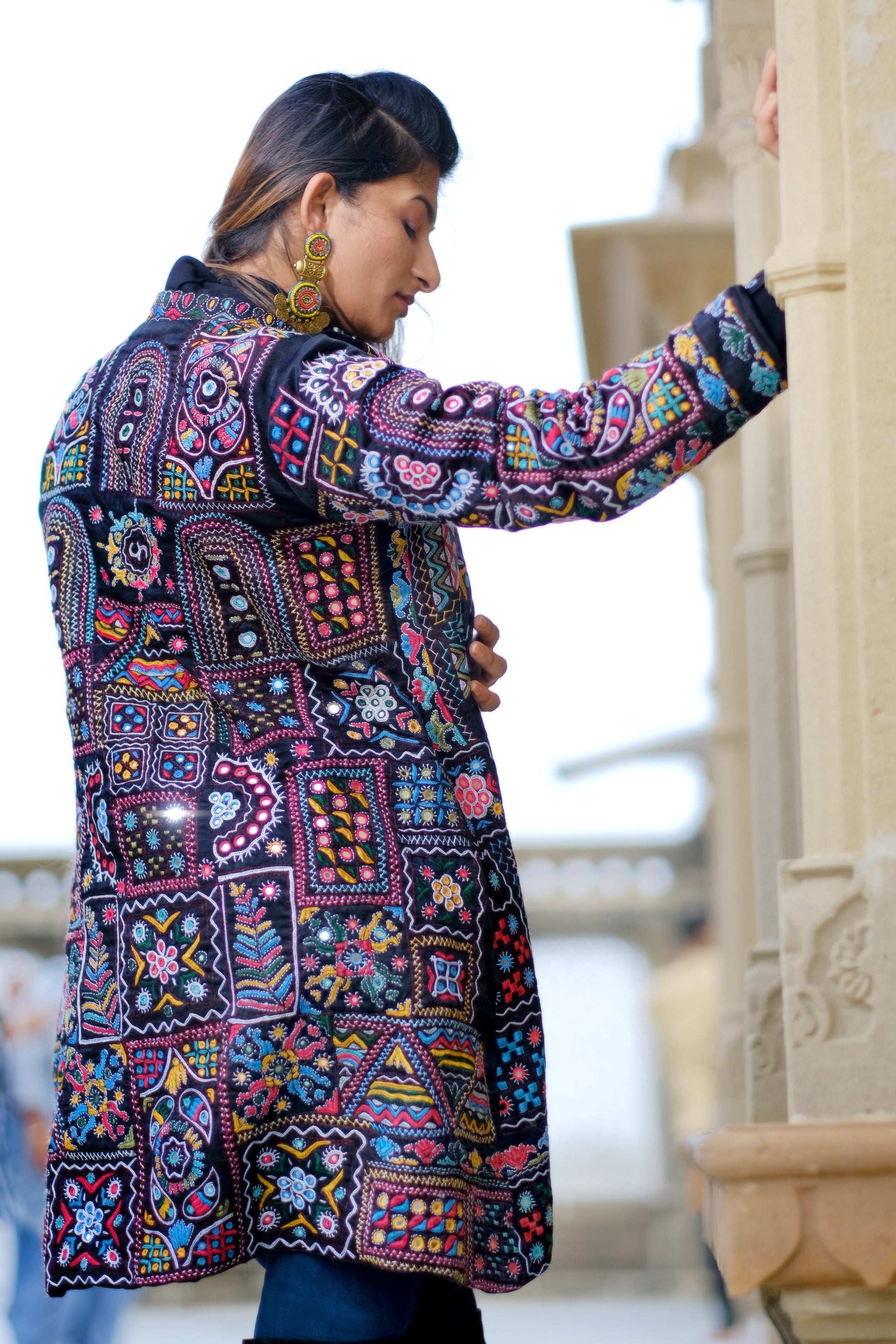 This Kiaayo 'Achija' Jacket is made by a fusion of Five different hand embroidery forms of Kutch and it's a must have garment in your wardrobe. A classic piece of art that can also be passed on to generations.
