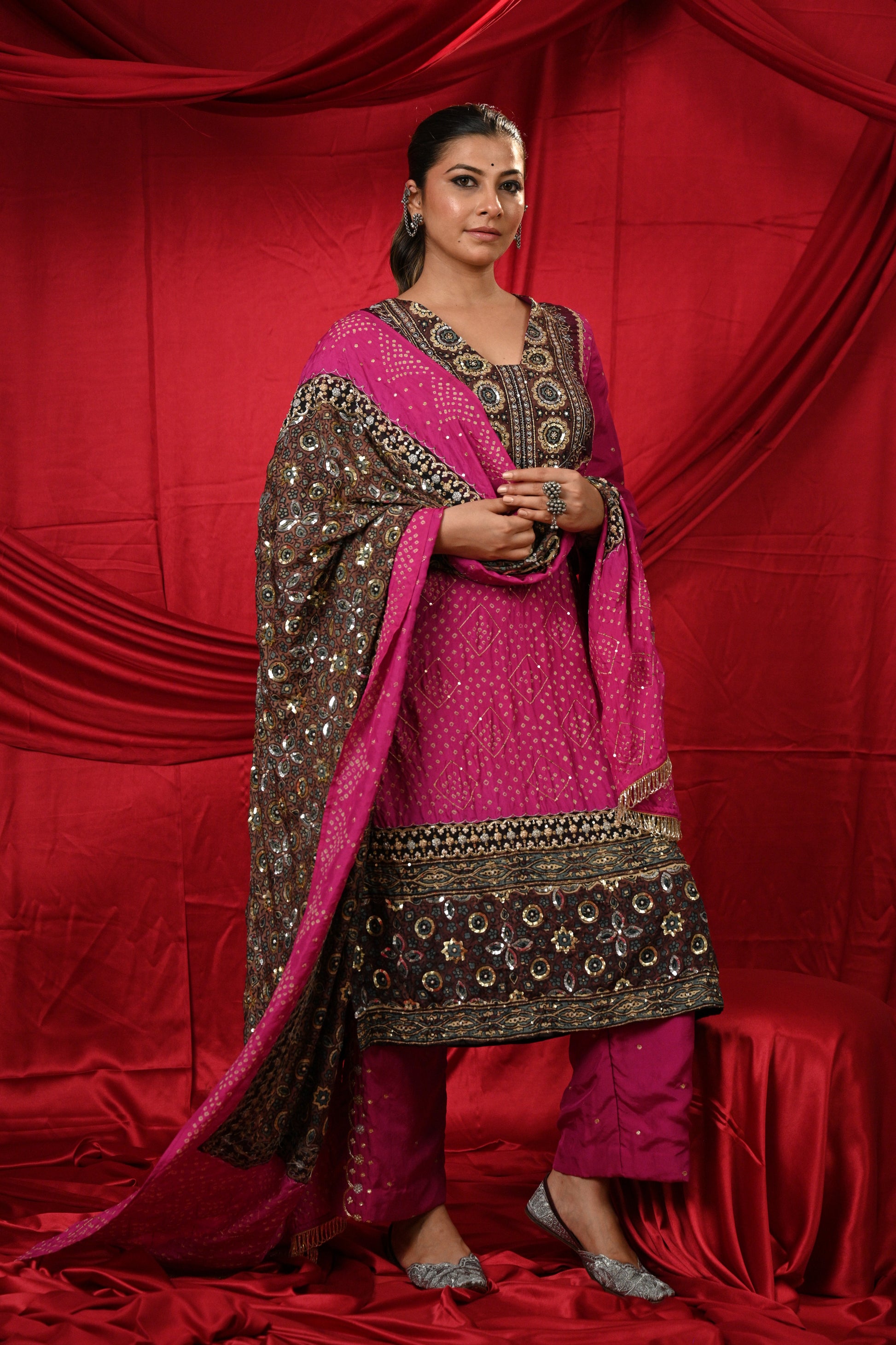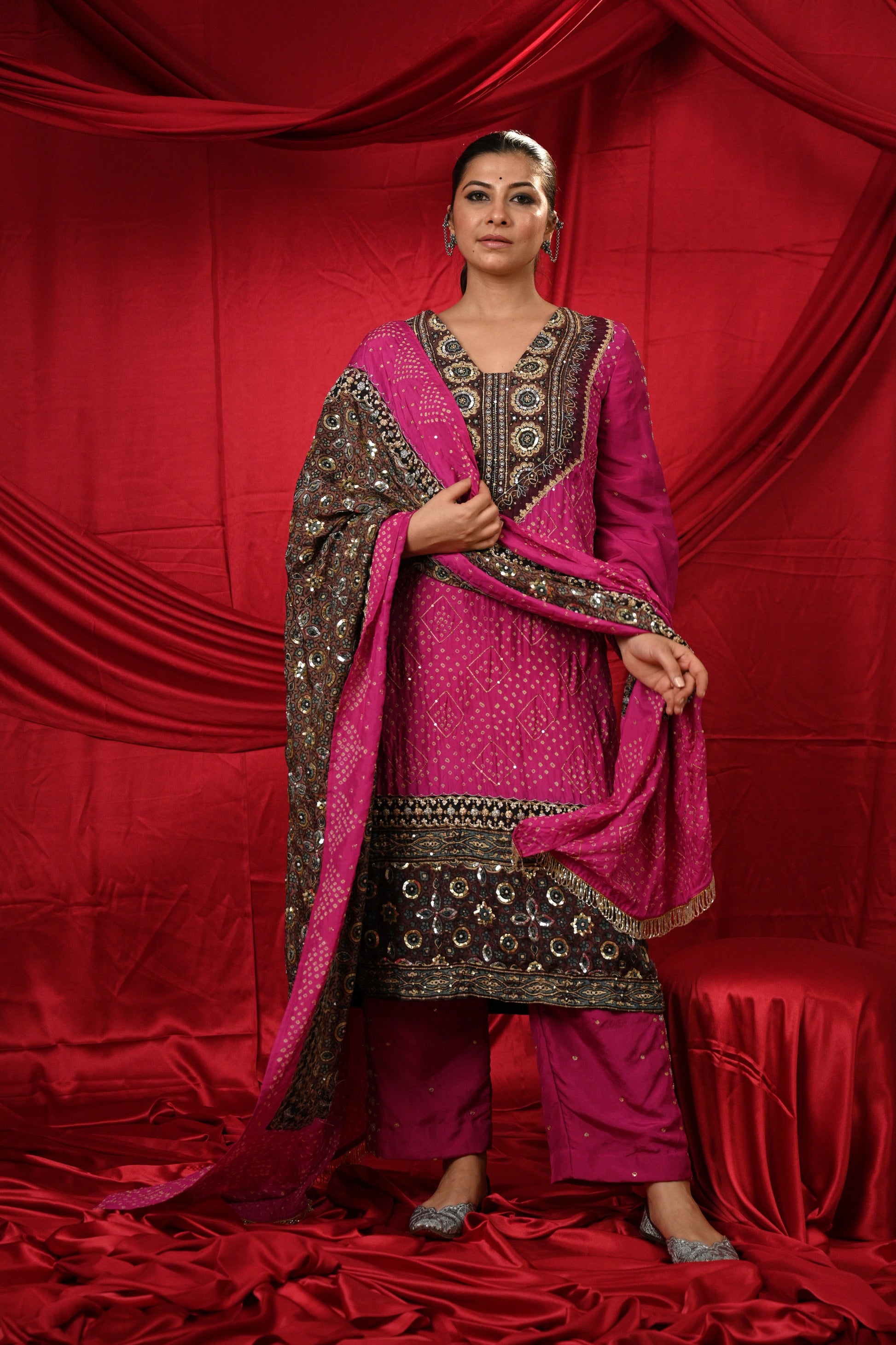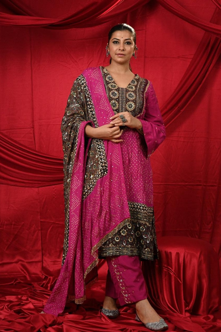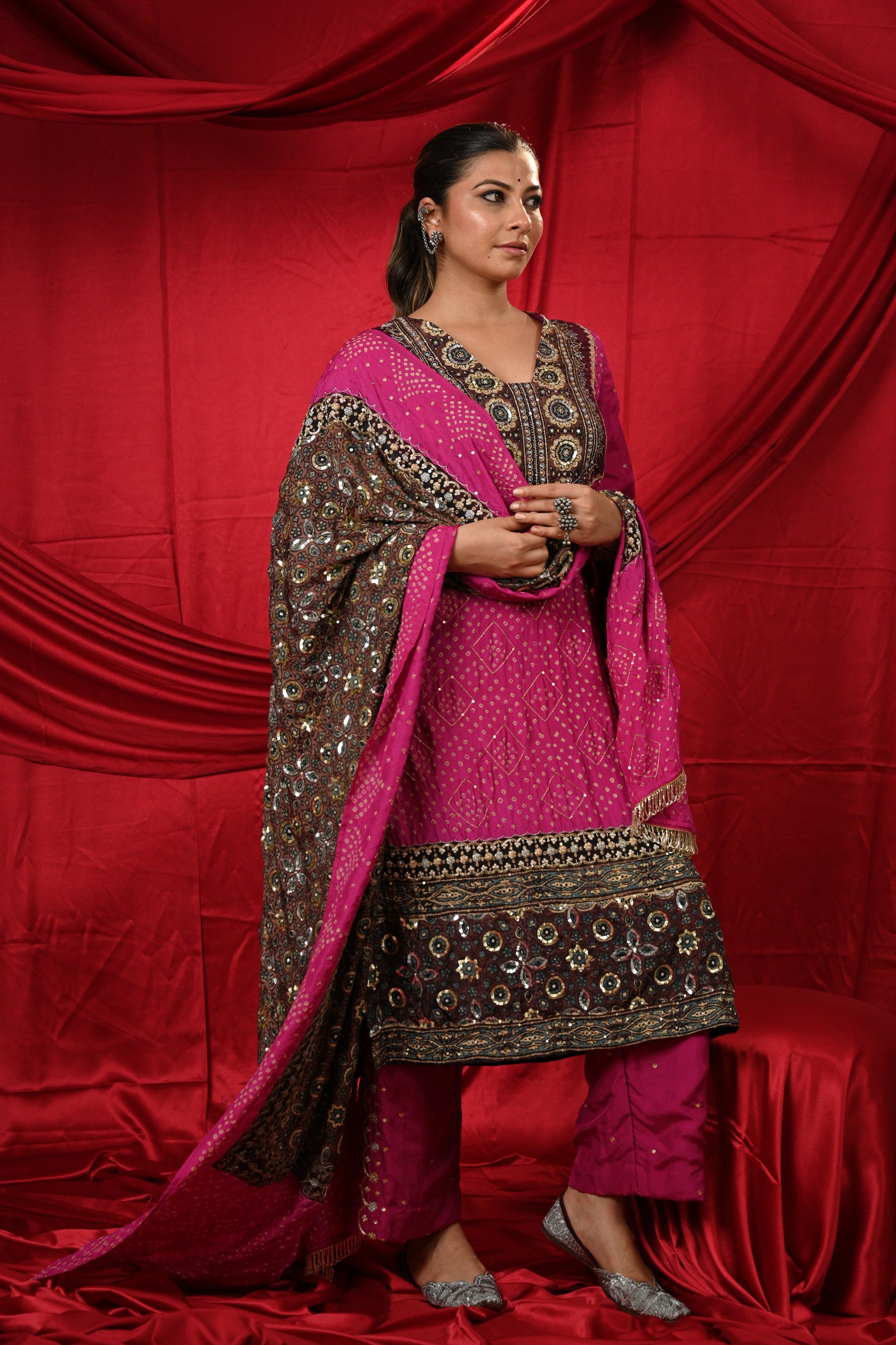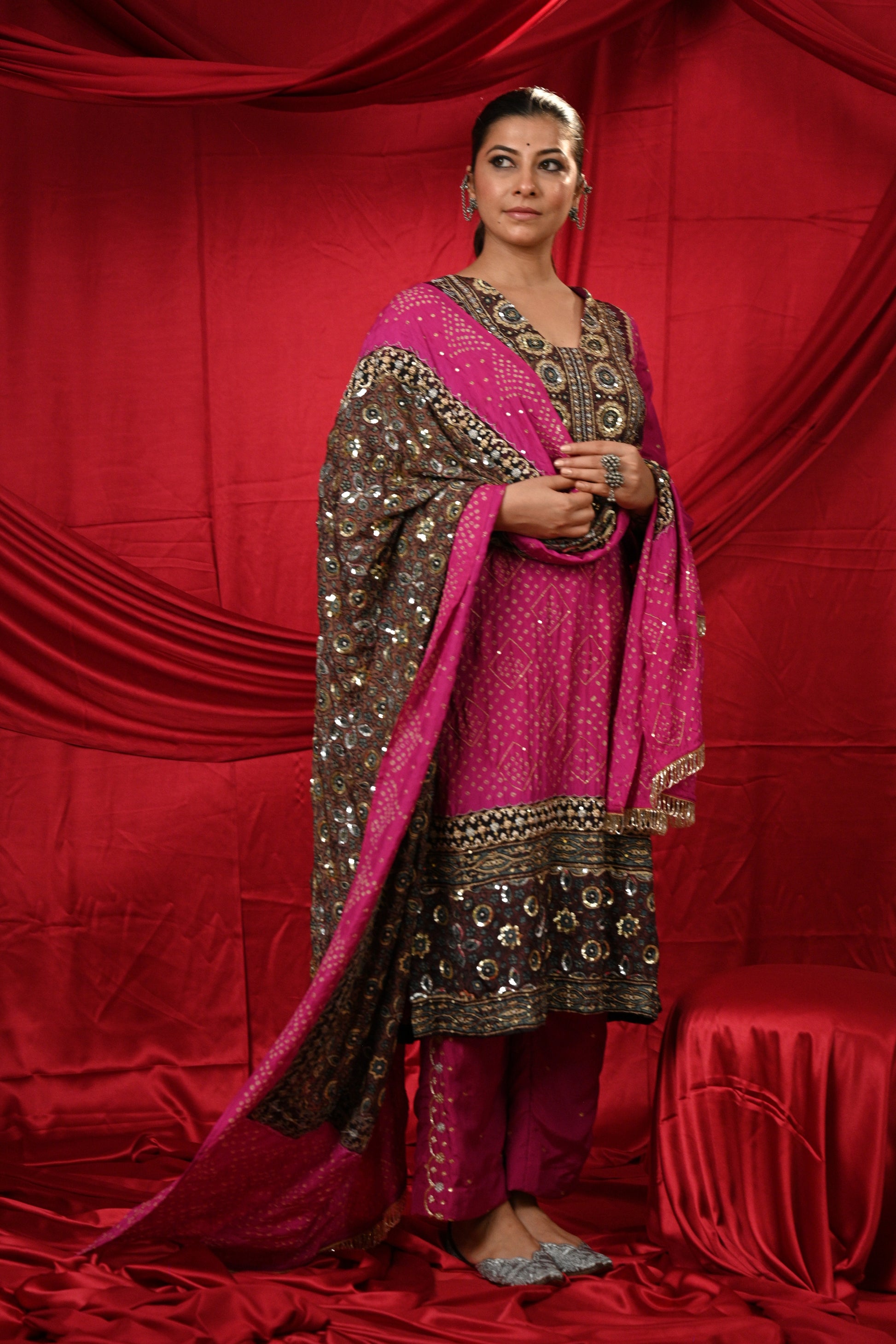 pink bandhani kurta set with Ajrak hand block print created with natural dyes highlighted with hand khat work on youk and sleeves of kurta comes with Ajrak hand block dupatta with hand khat work done all over and wide leg pants with scallop design khat work