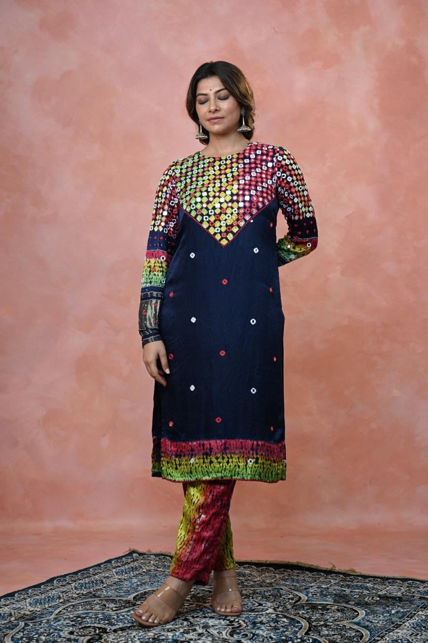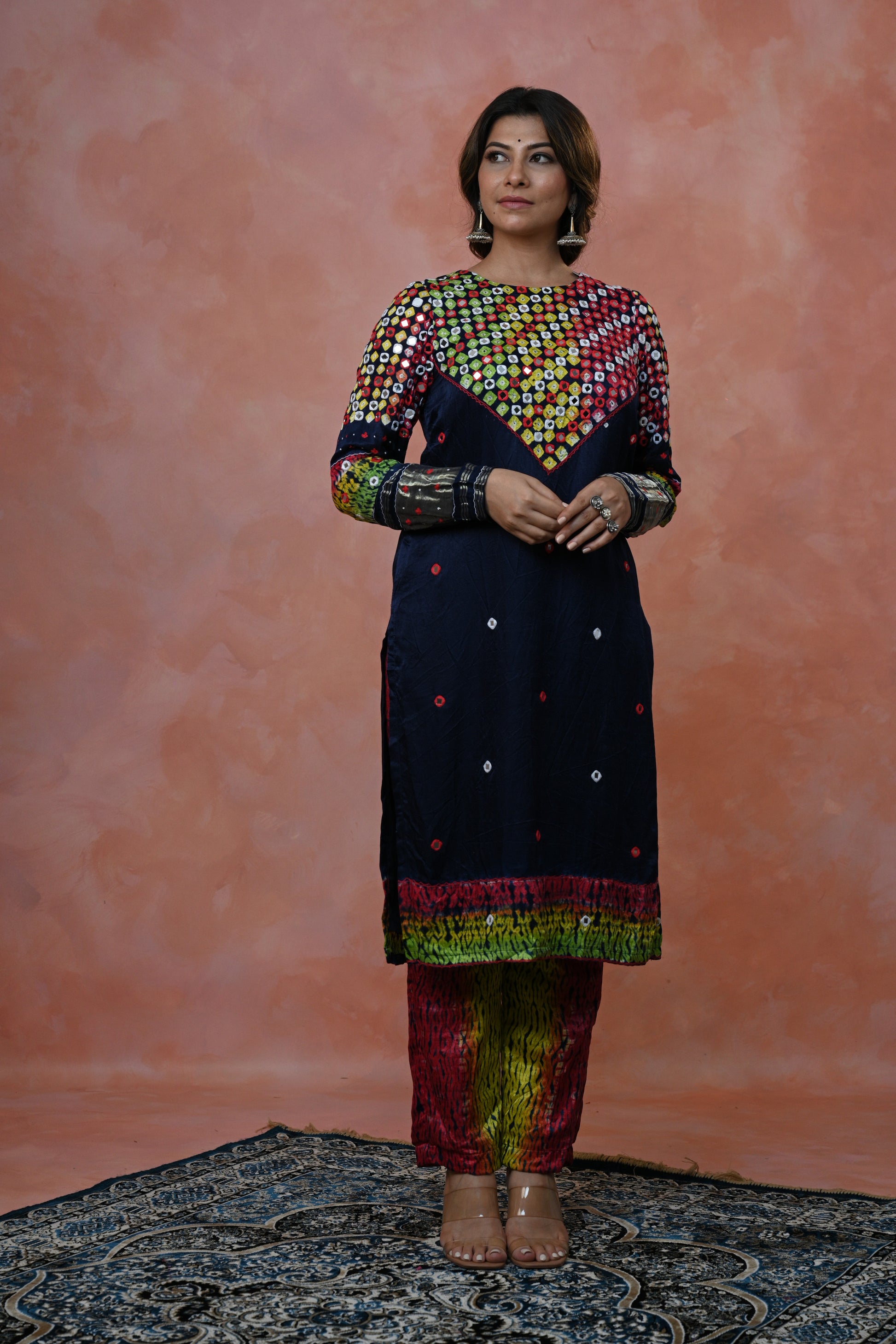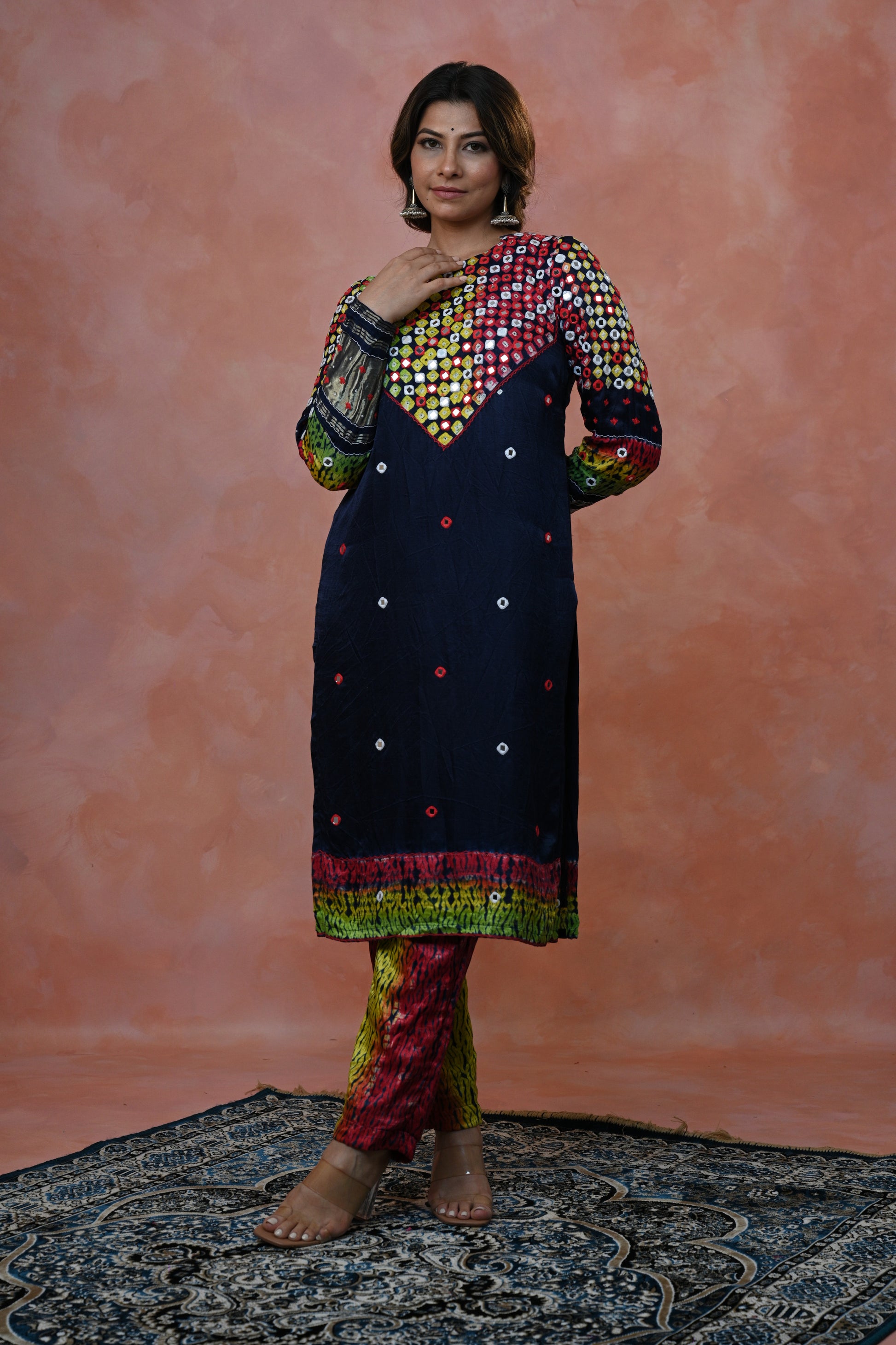 Royal kurta with a blend of Bandhani and Shibori highlighted with heavy Hand Mirror Khat Work on the yok , Hand Khat Work highlighting on the sleeves paired with Ombre Shibori pants