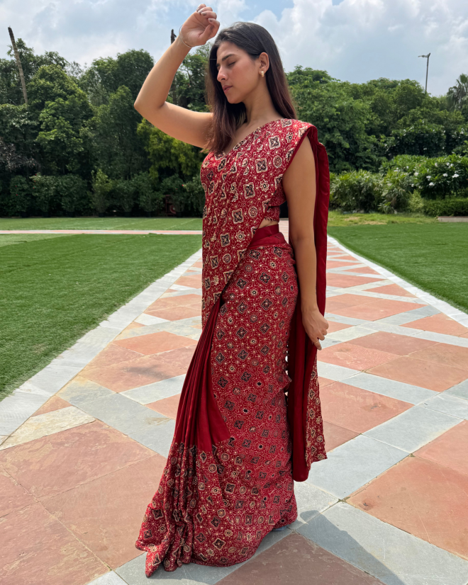 The Classic Pre-Drape Red Ajrakh Saree is crafted in authentic hand-block print and enriched with fine Khat embroidery across the drape and pallu. Designed for effortless elegance, the pre-draped silhouette is paired with a matching blouse detailed in the same artisanal embroidery, creating a statement ensemble of tradition and modern ease.