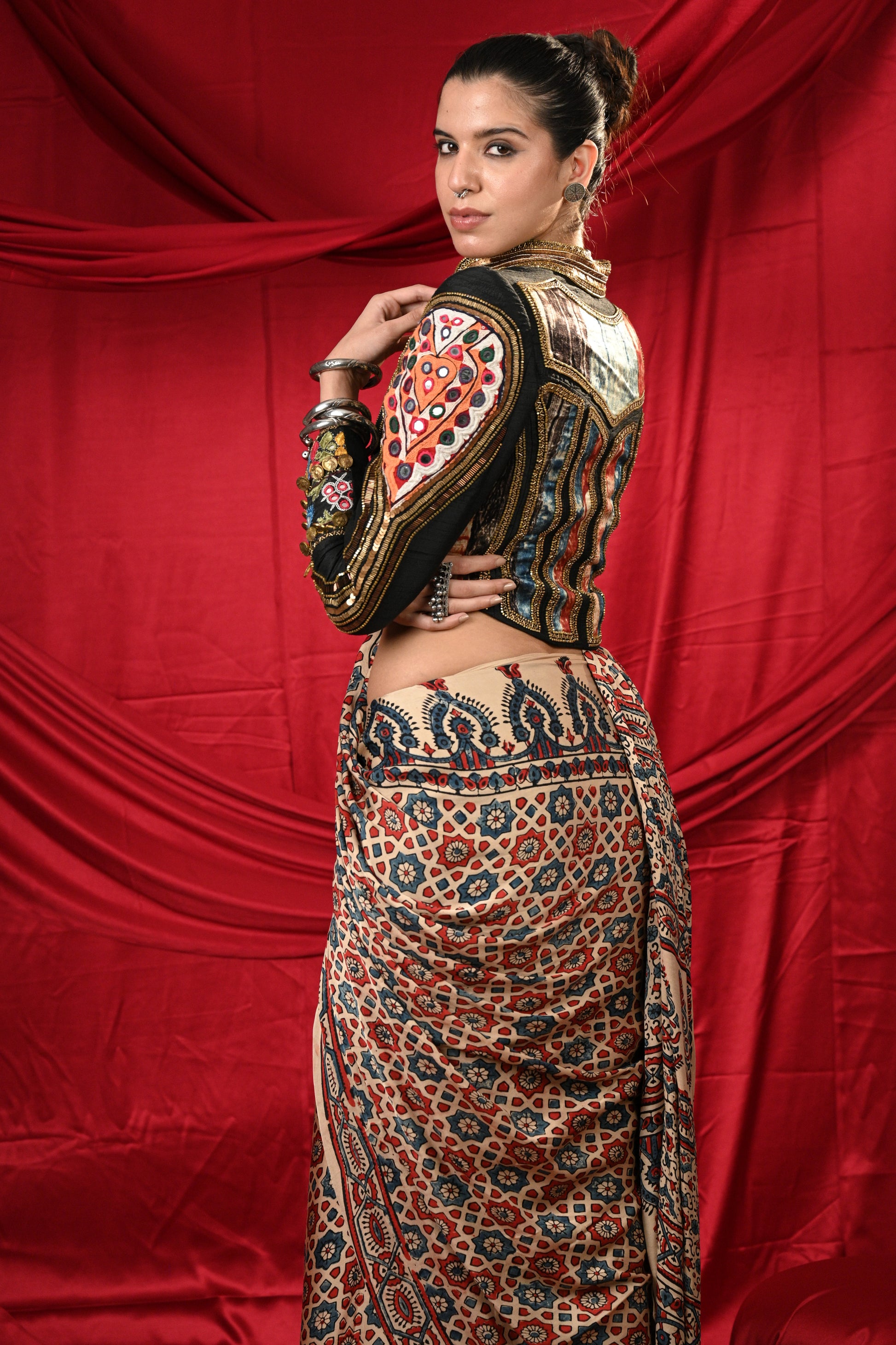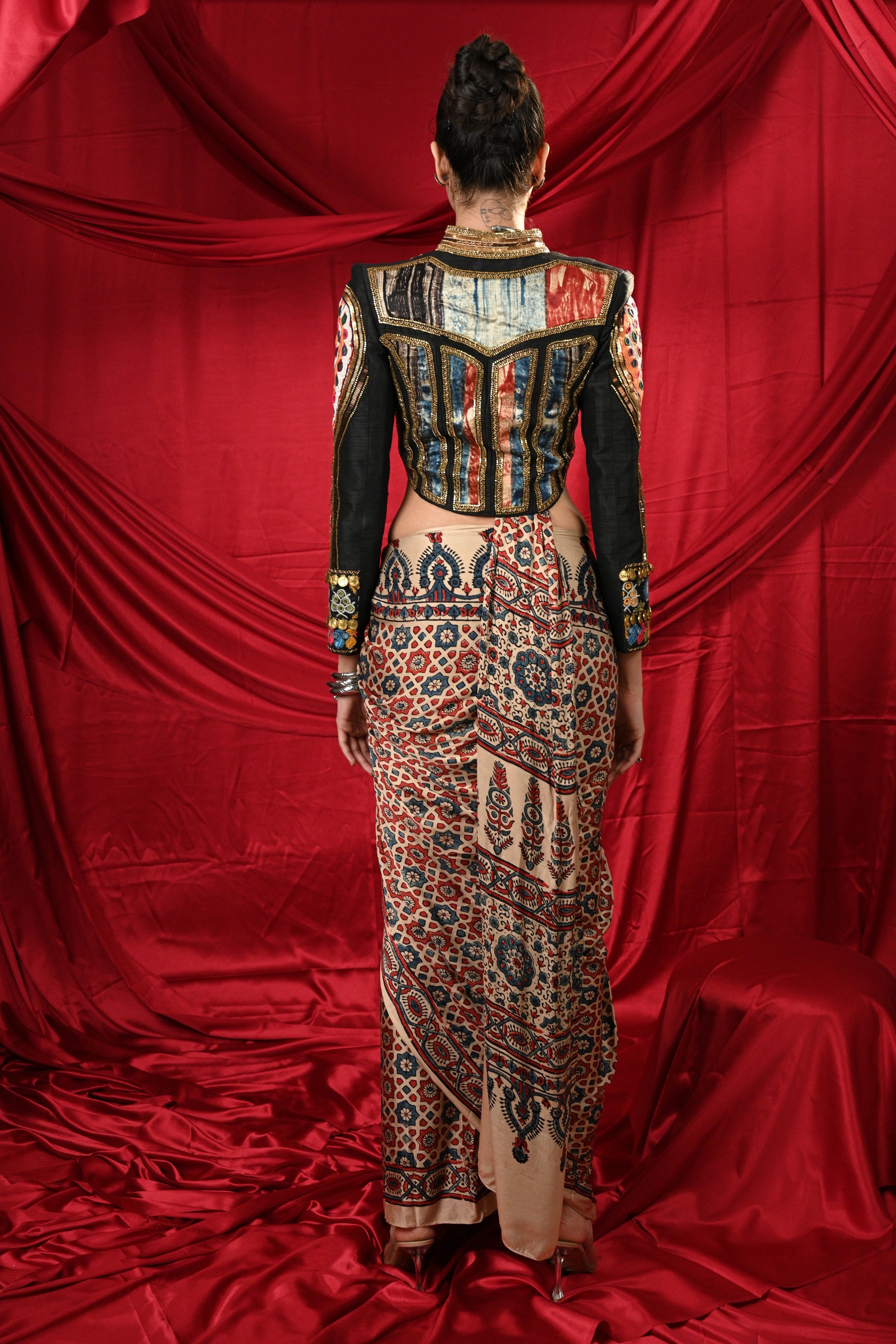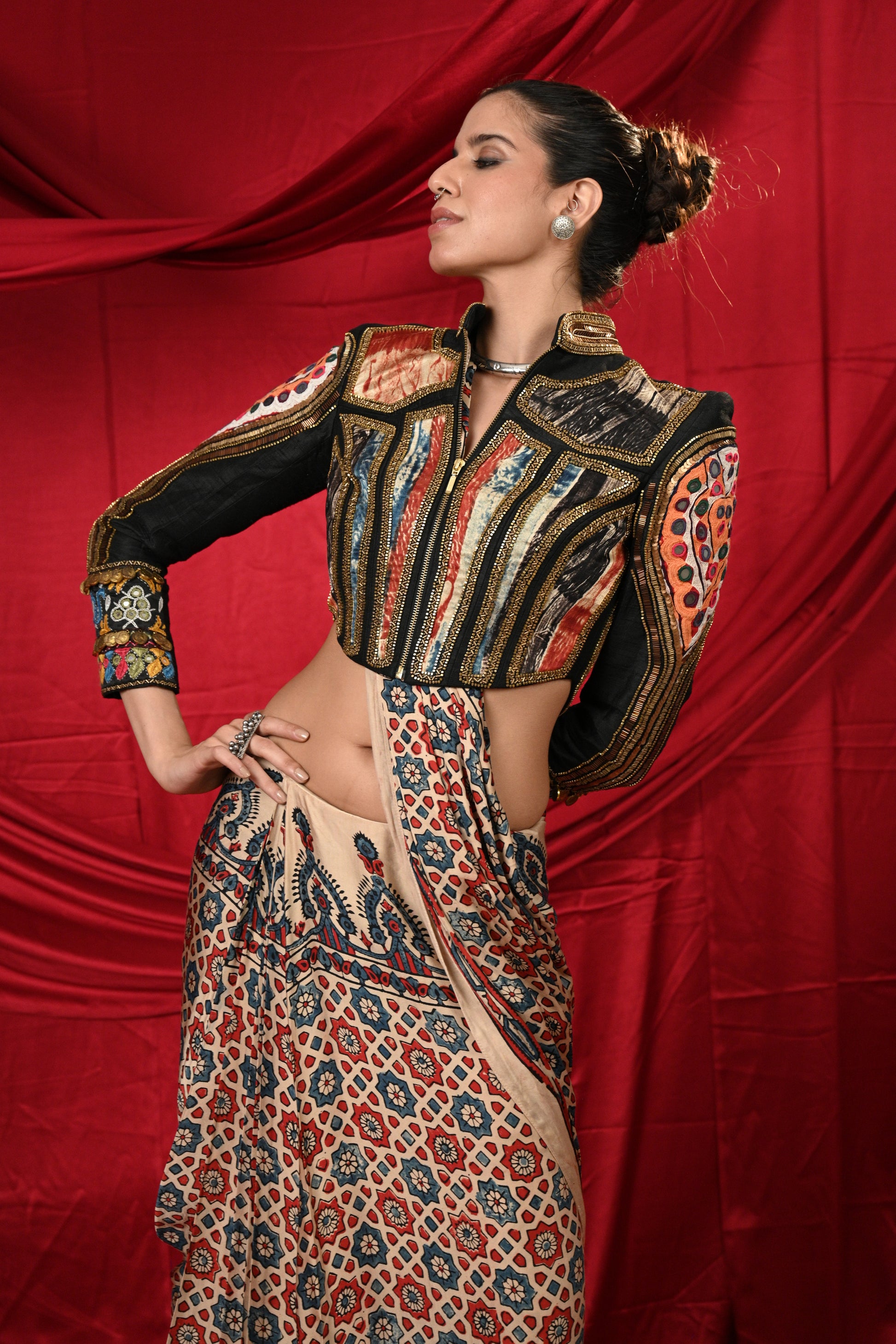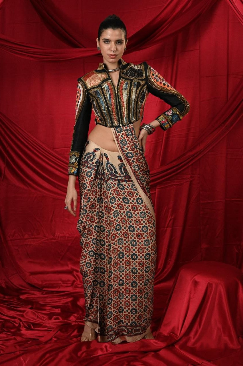Lovely black jacket with Antic Golden Hand Khat Work in the back and sleeves of jacket with multicolor Tie-Dye patches in the front and front zipper on the jacket paired with beautiful pre draped Ajrak saree