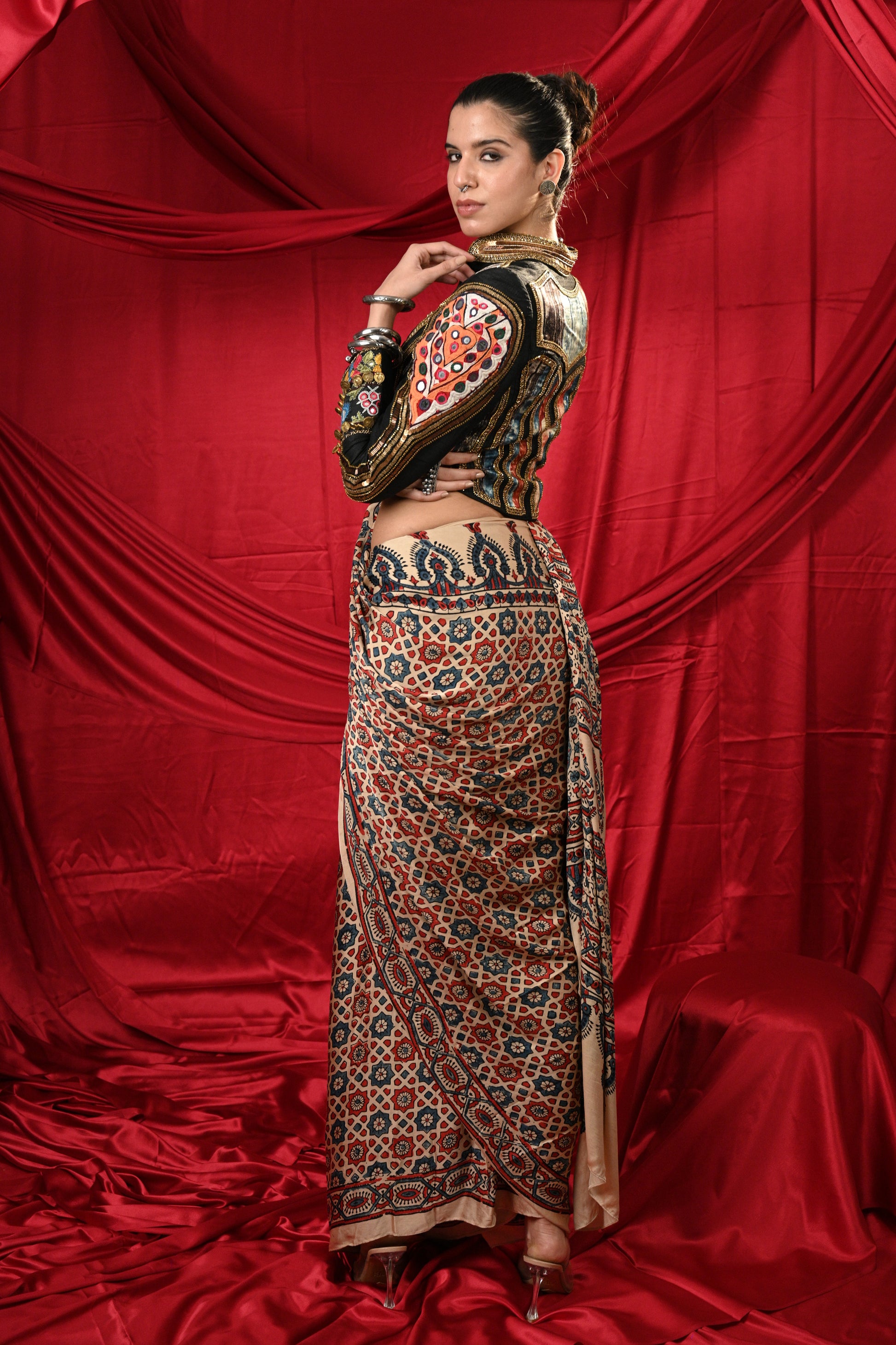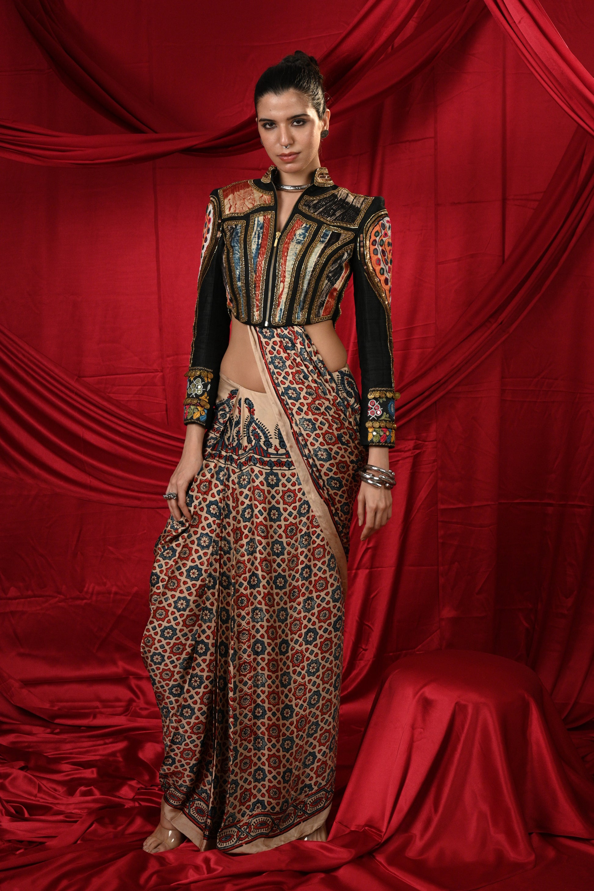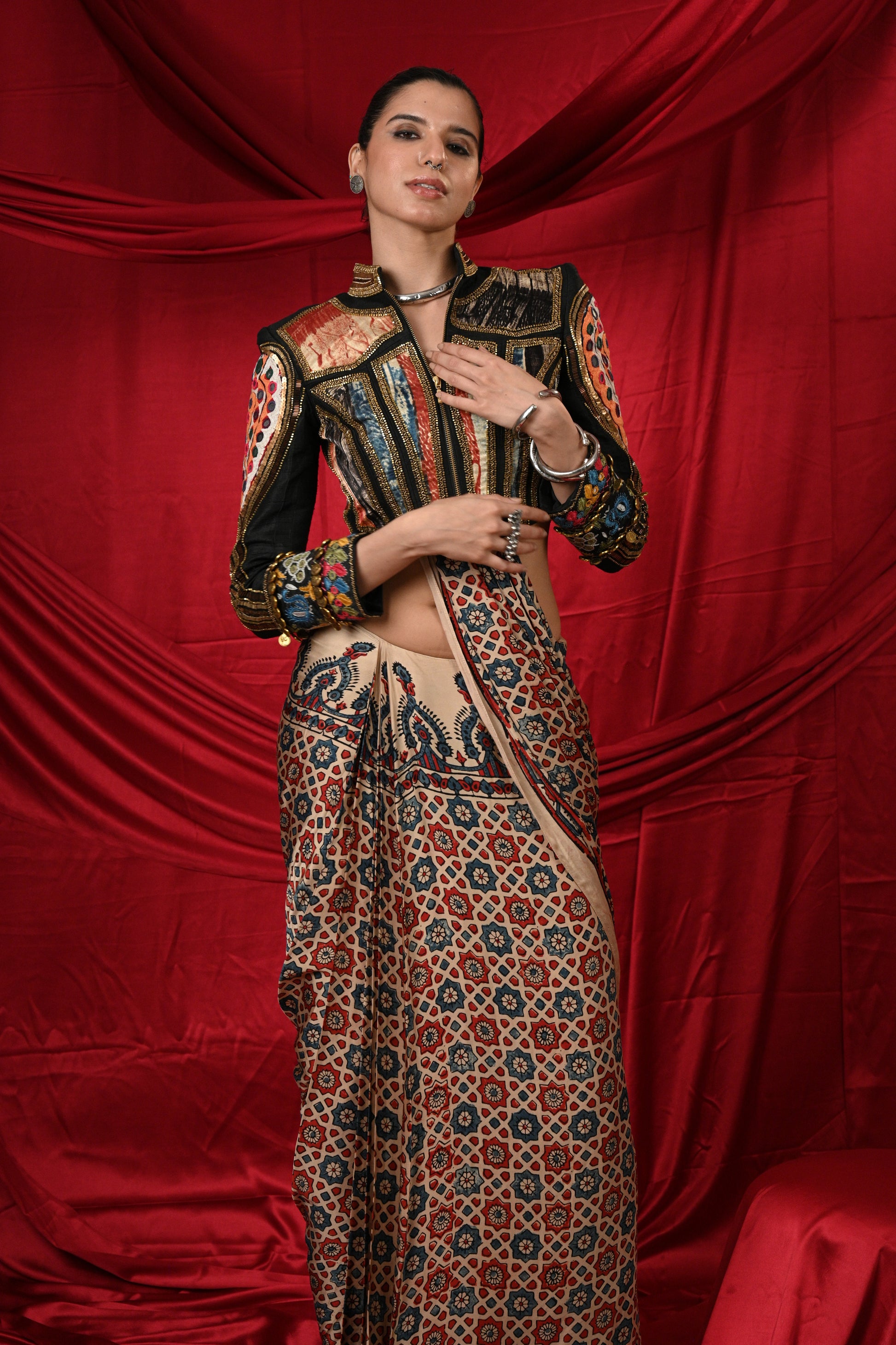 Lovely black jacket with Antic Golden Hand Khat Work in the back and sleeves of jacket with multicolor Tie-Dye patches in the front and front zipper on the jacket paired with beautiful pre draped Ajrak saree