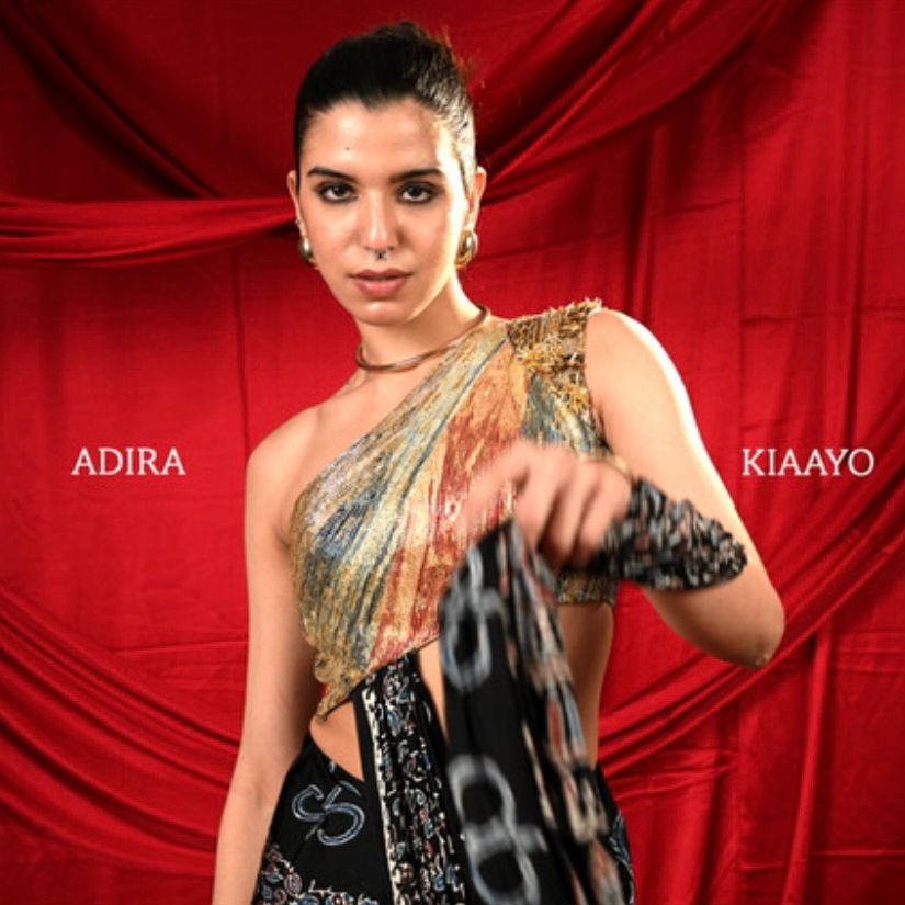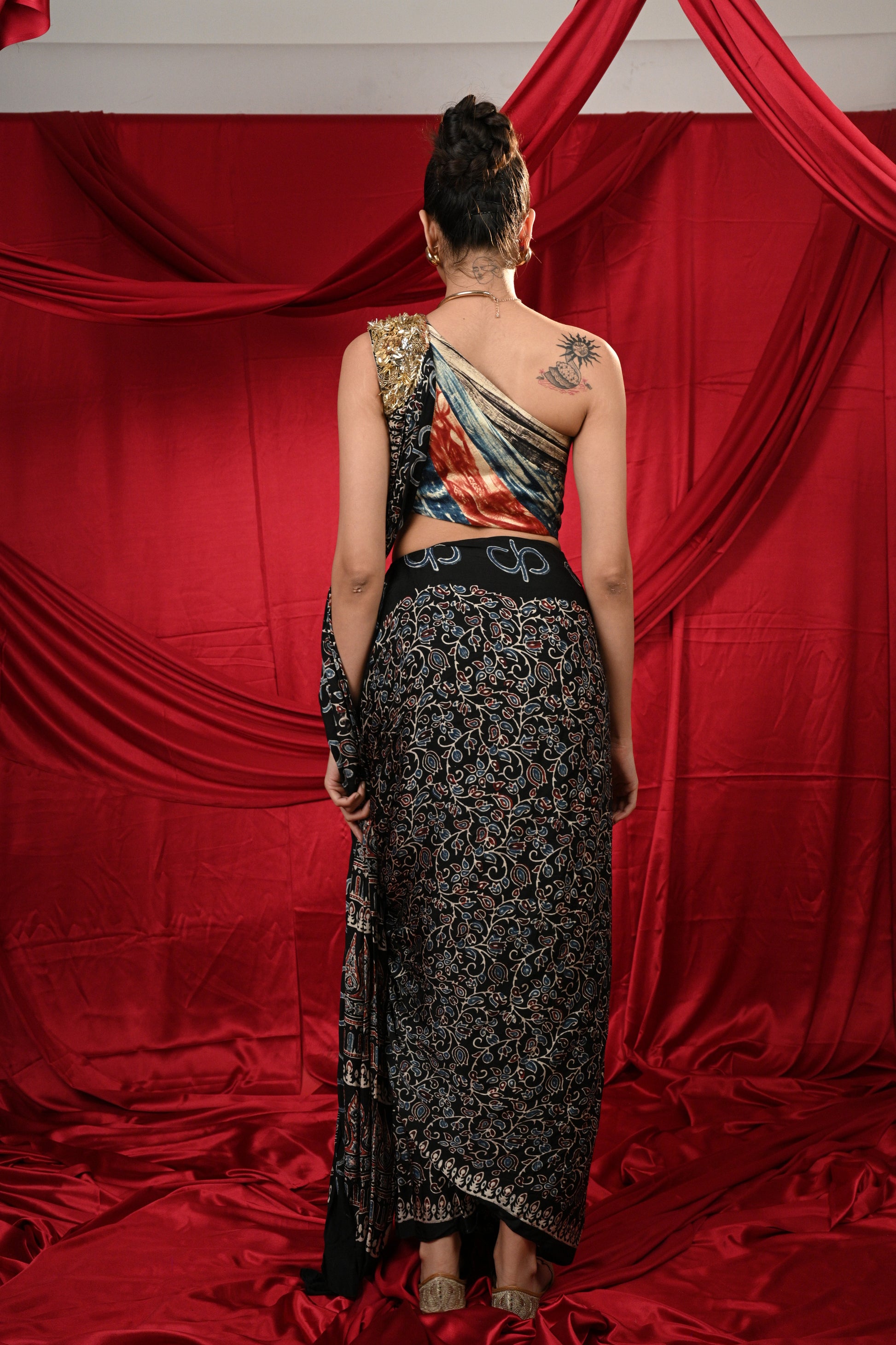 Very elegant multicolor one shoulder blouse with Heavy Cutdana Work paired with lovely pre drapped Ajrak saree