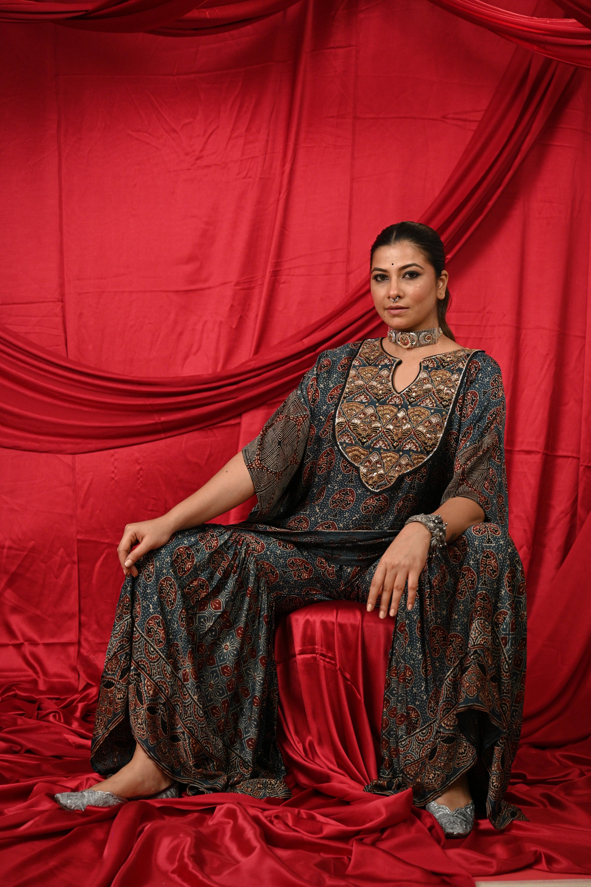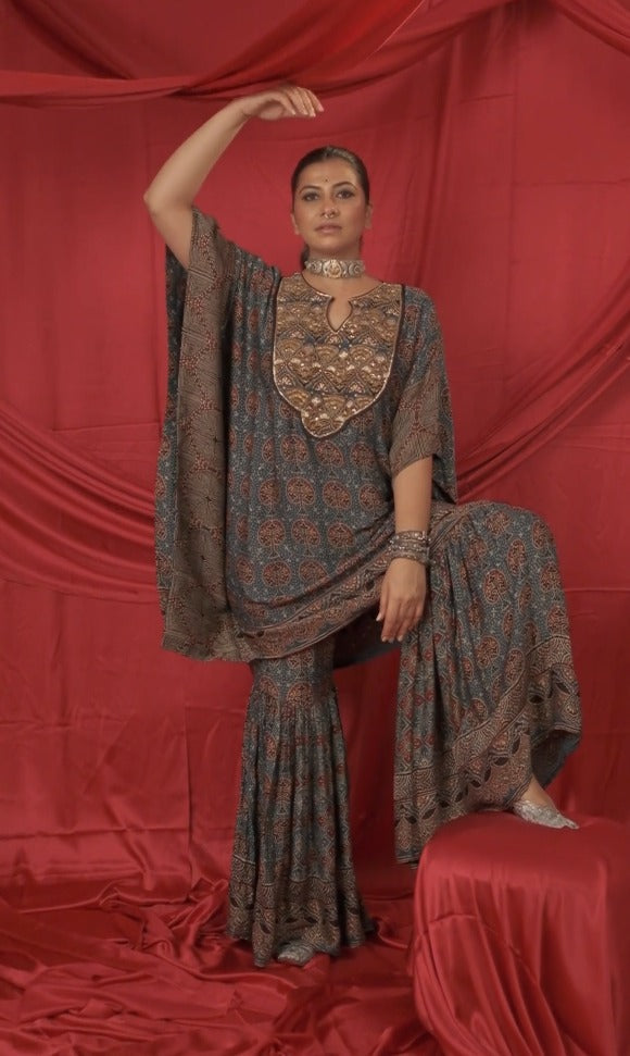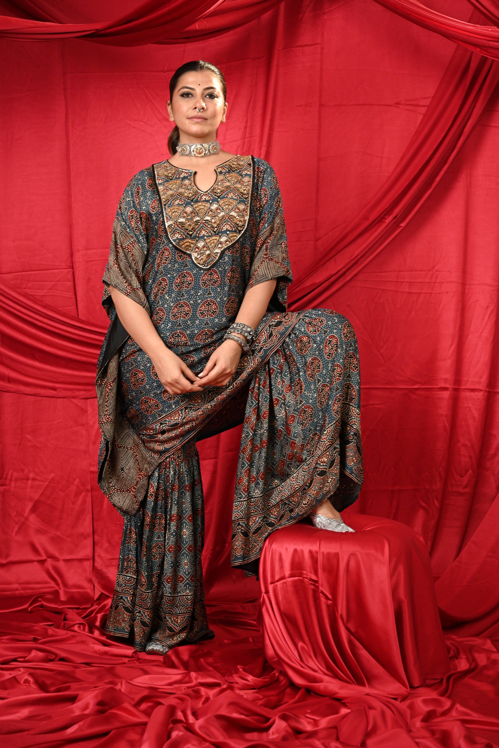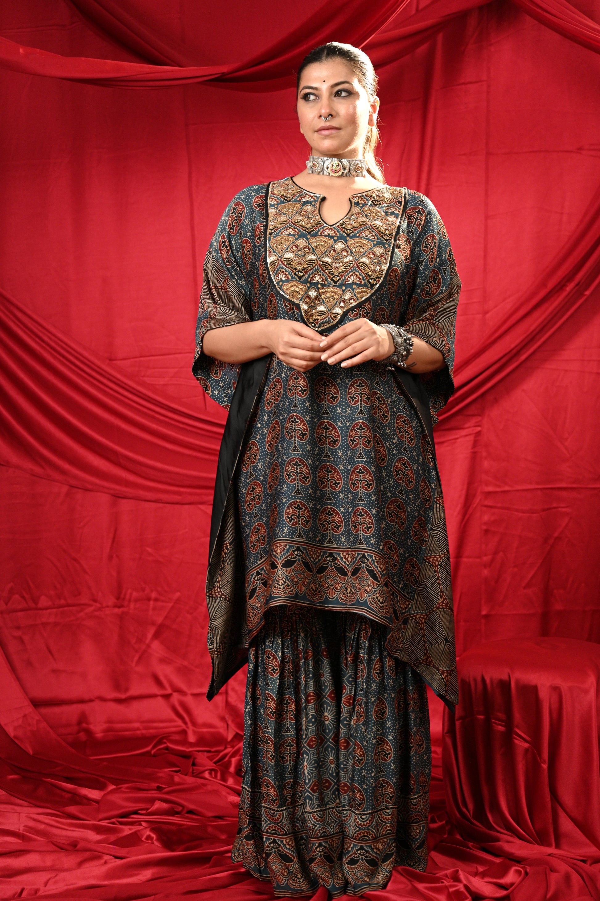Ubique indigo kaftaan style top with heavy Hand Khat Work on the yoke in Ajrak Hand Block Print paired with lovely sharara bottoms in Ajrak Hand Block Print