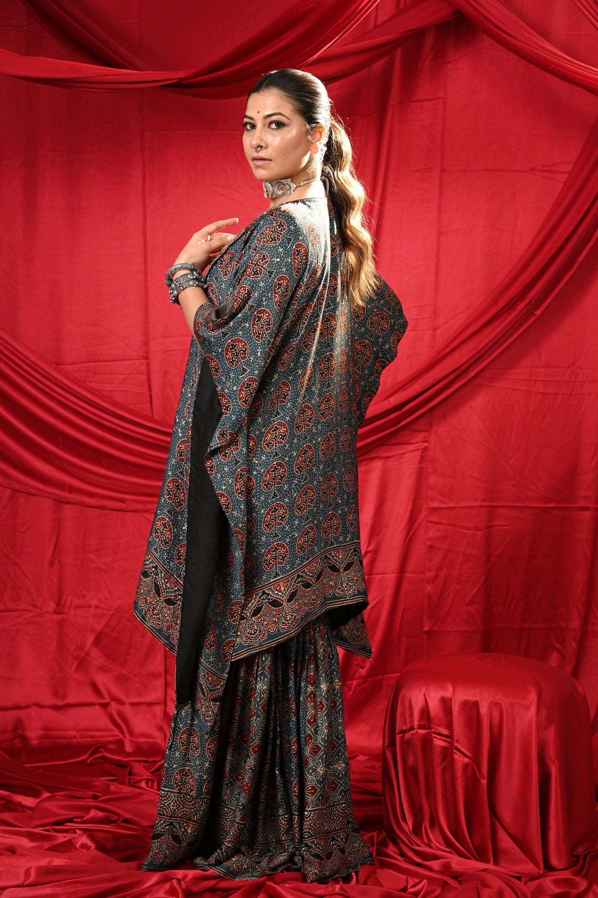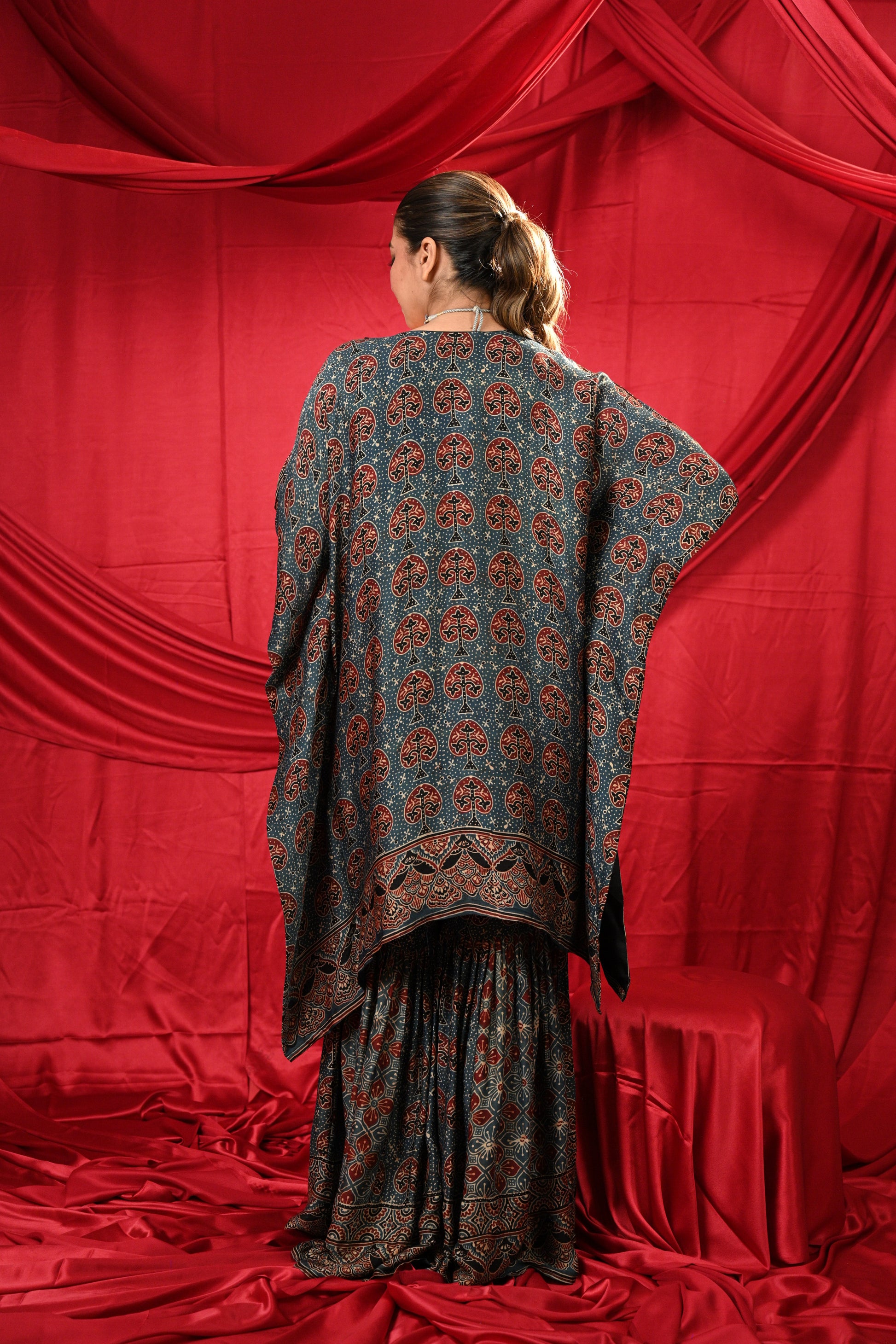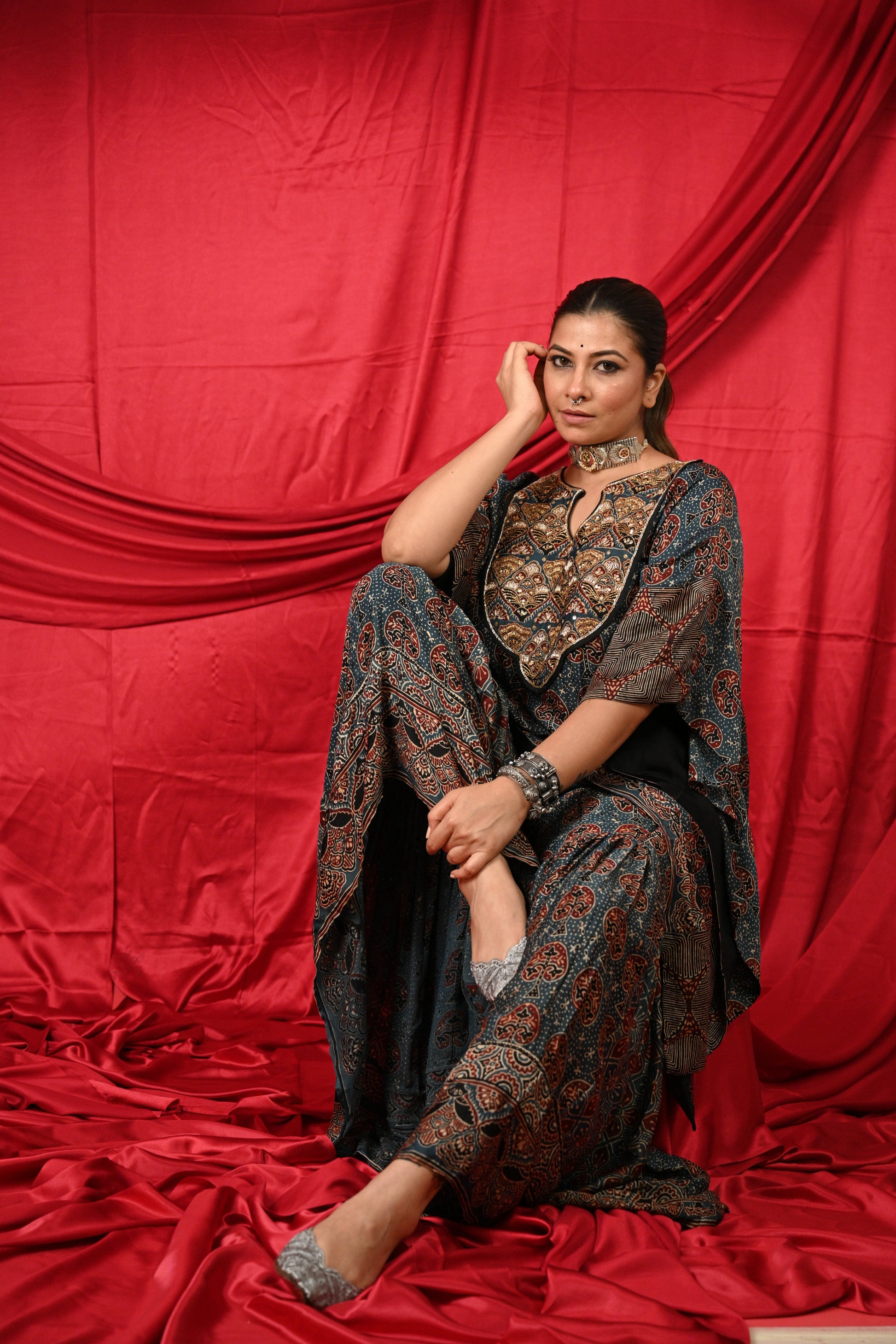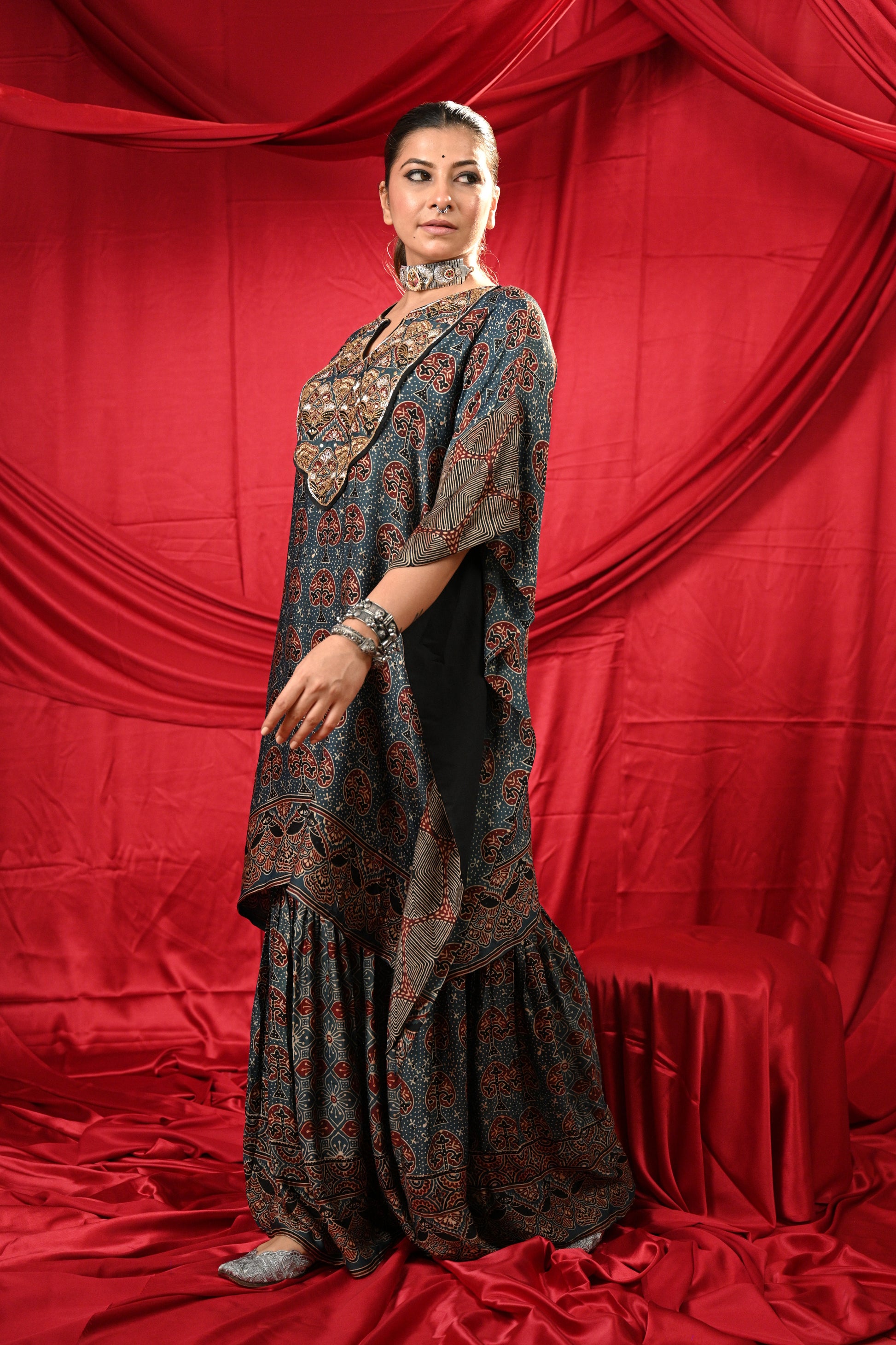 Ubique indigo kaftaan style top with heavy Hand Khat Work on the yoke in Ajrak Hand Block Print paired with lovely sharara bottoms in Ajrak Hand Block Print