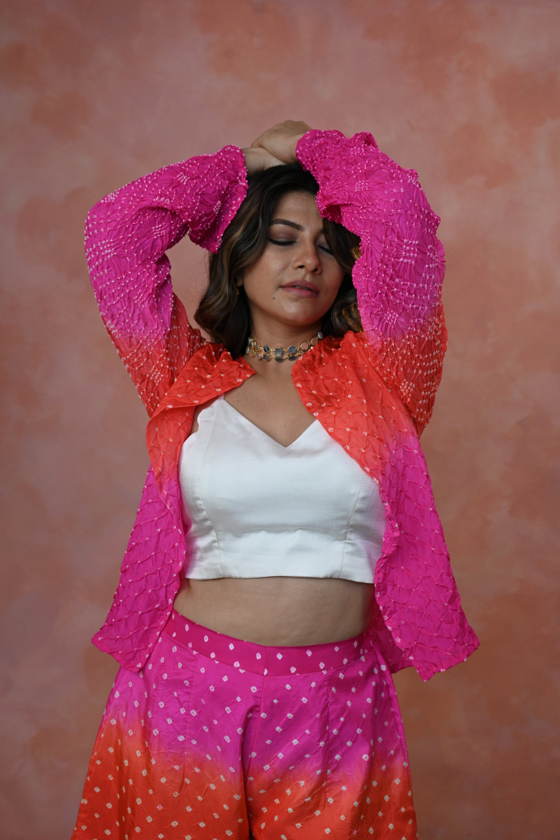 Stunning ombre short jacket in Habutai Silk in Rai Bandh paired with plain white bustyer and classy shorts in Ombre in single Dot Bandhni with comfortable back elastic and pocket