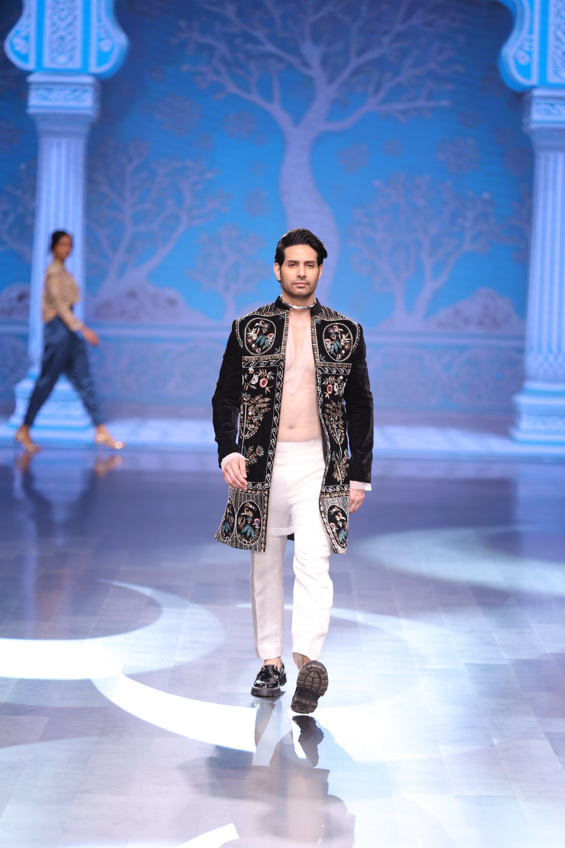 Intricate Aari embroidery, enhanced with detailed Zardozi work, elevates the ensemble with artisanal finesse and subtle shine. Ideal for weddings, evening celebrations, and festive occasions, this set reflects modern masculinity rooted in timeless craftsmanship.
