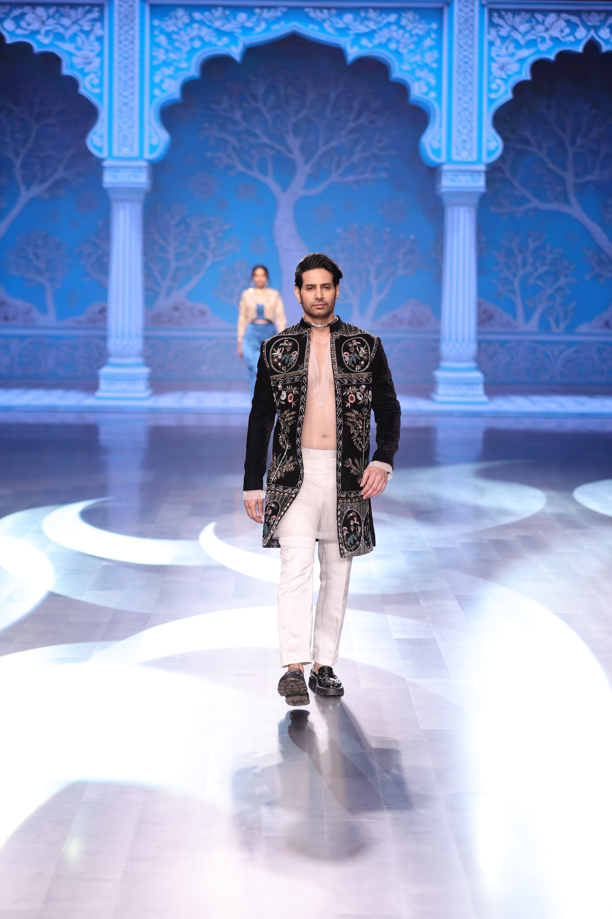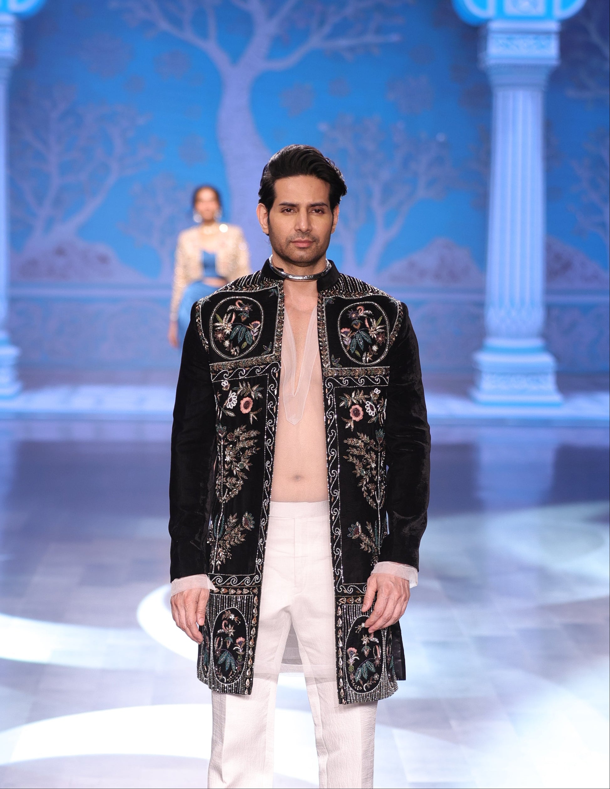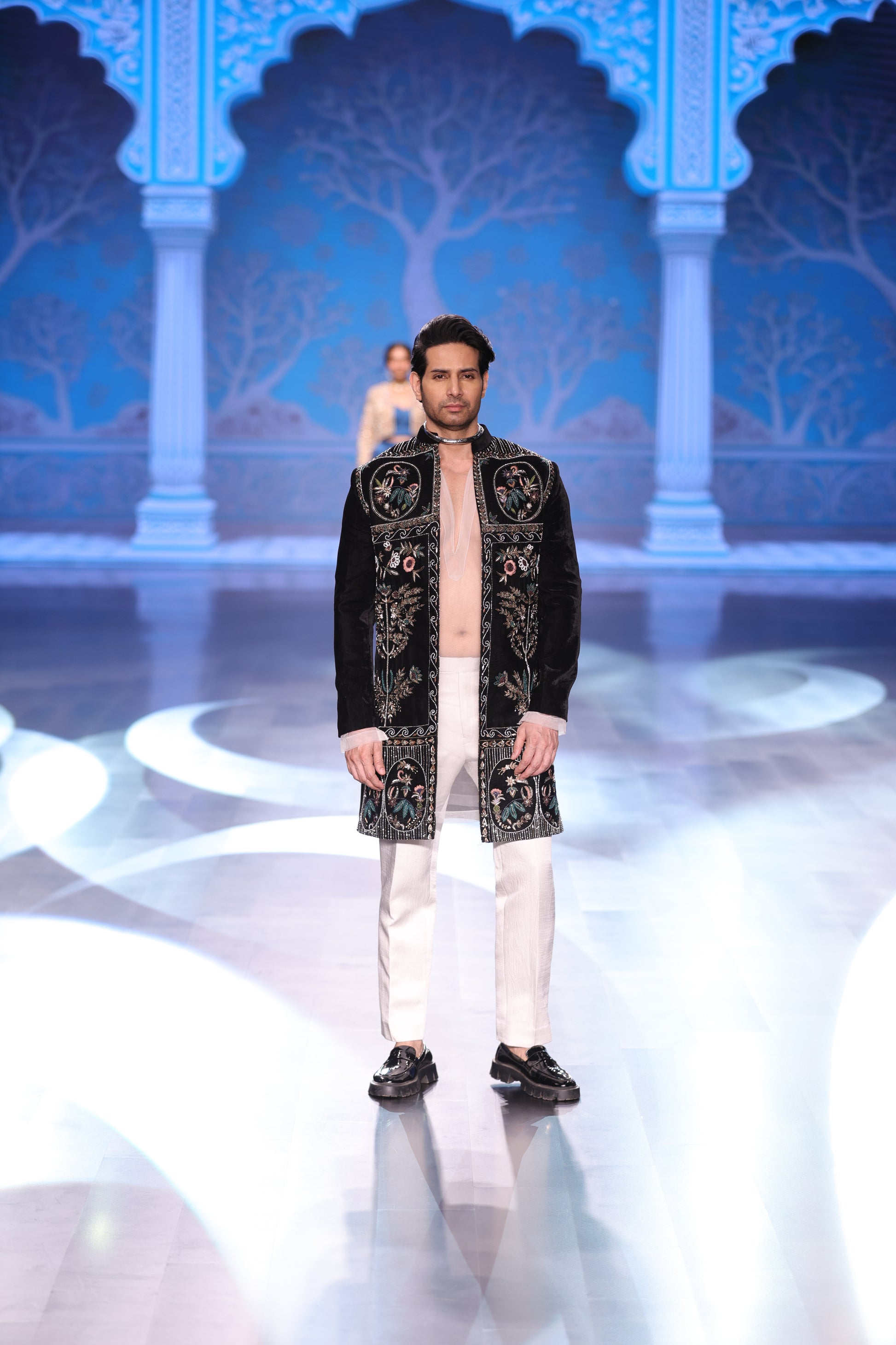 This elegant men’s Indo set is crafted to make a refined statement. The open Indo, made in rich black velvet fabric, offers depth and a luxurious finish, creating a strong and regal silhouette.