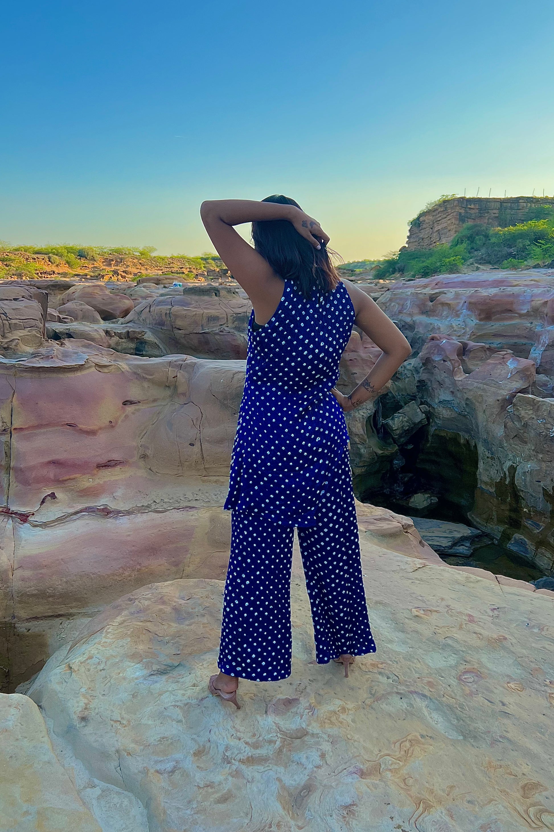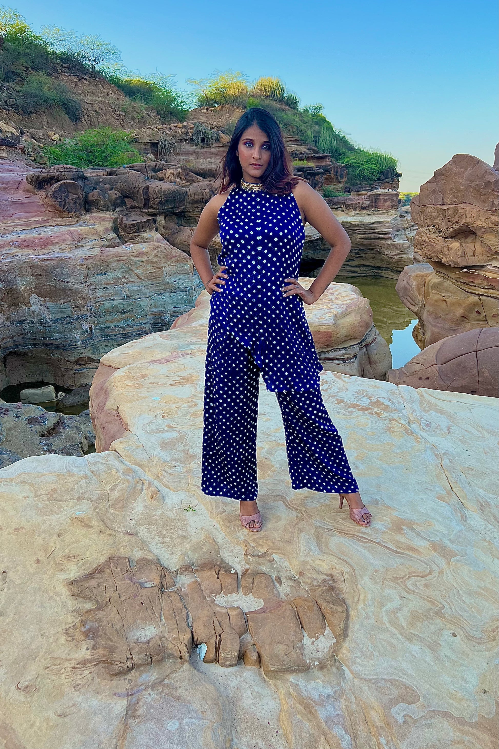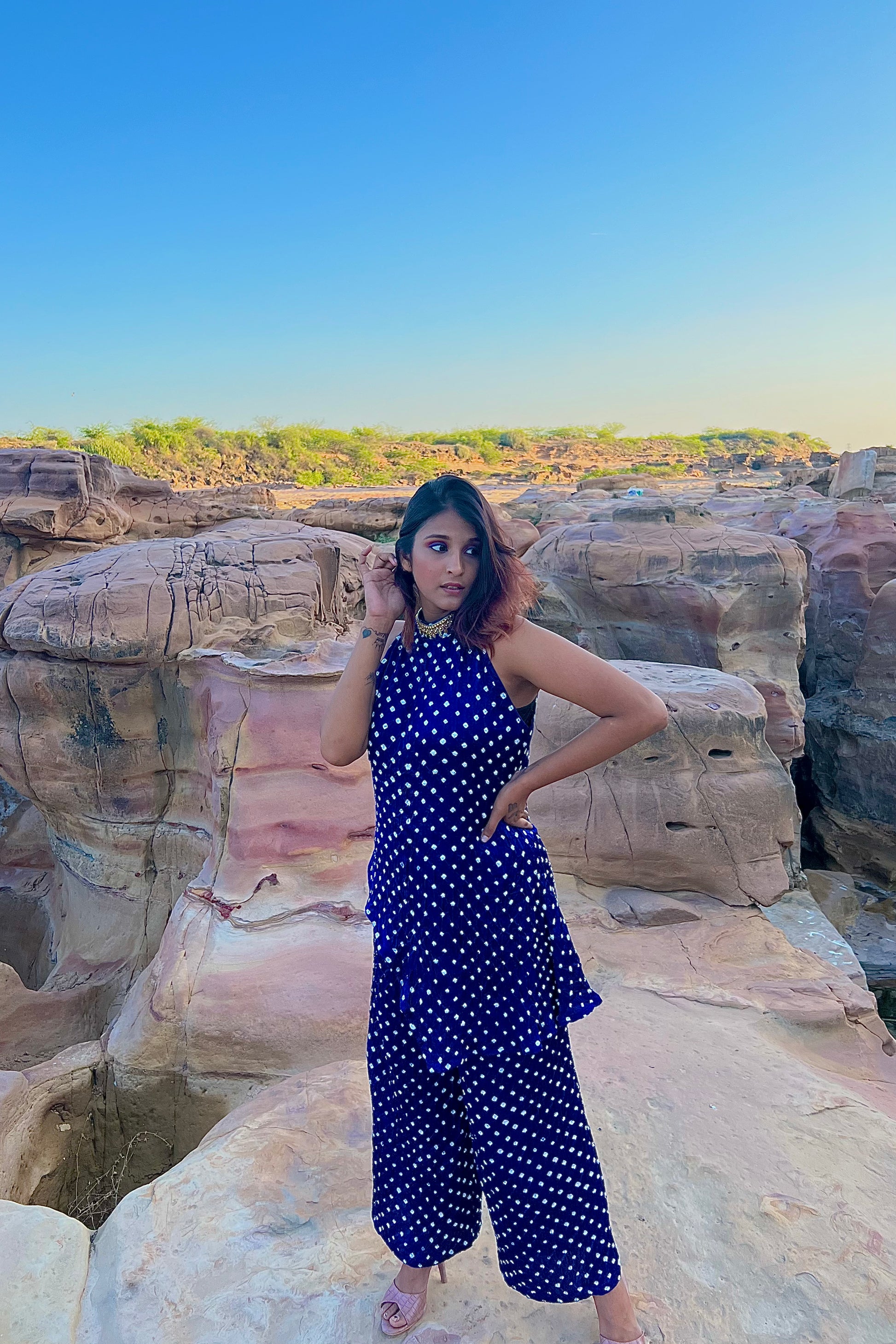 Stylish & comfortable Single Dot Bandhani Co-ord Set. Featuring a chic halter neckline with intricate detailing and a stylish high-low hemline, this set is paired with comfortable flared pants. Perfect for any occasion.