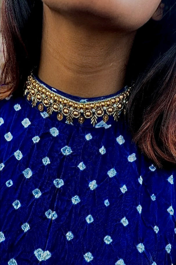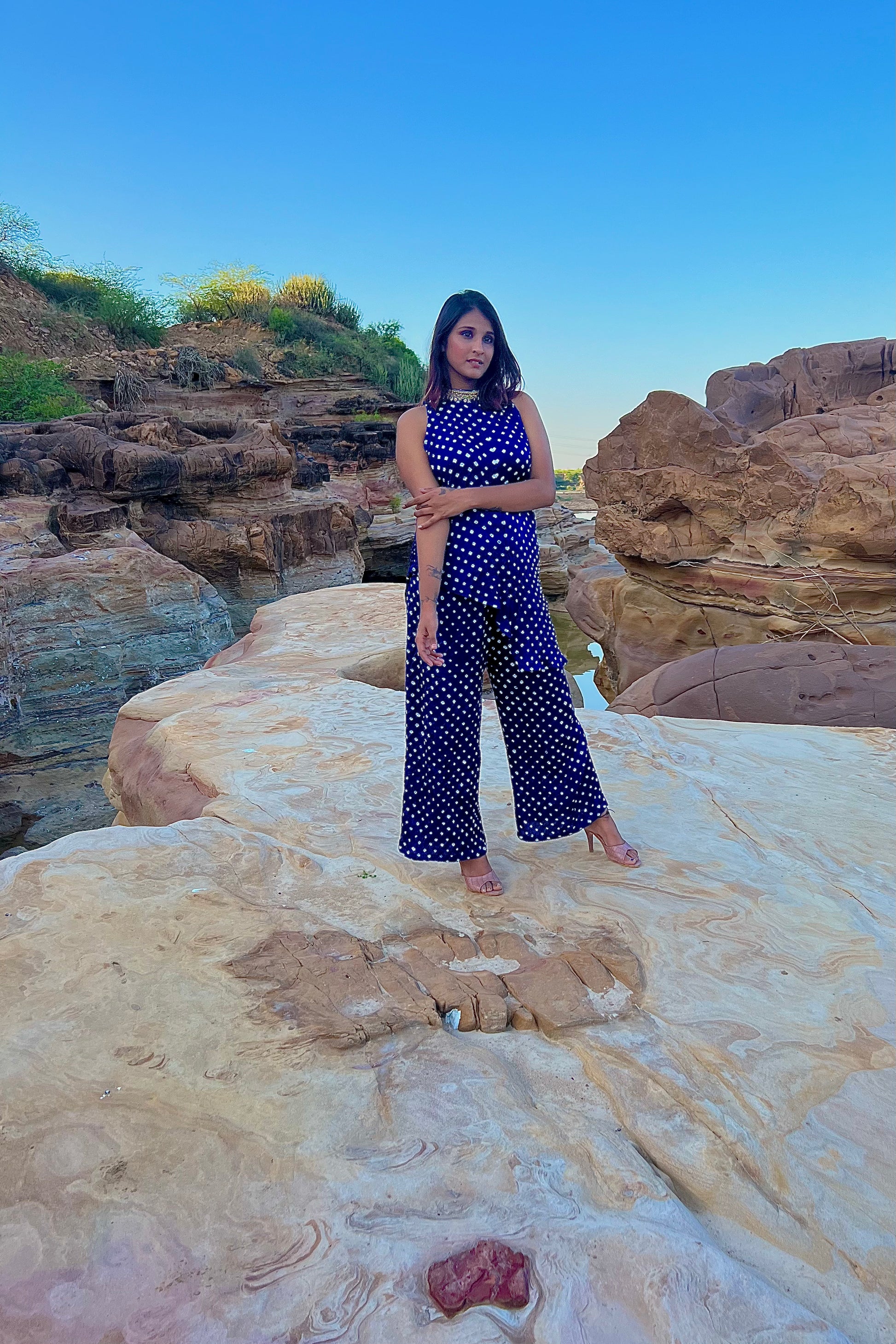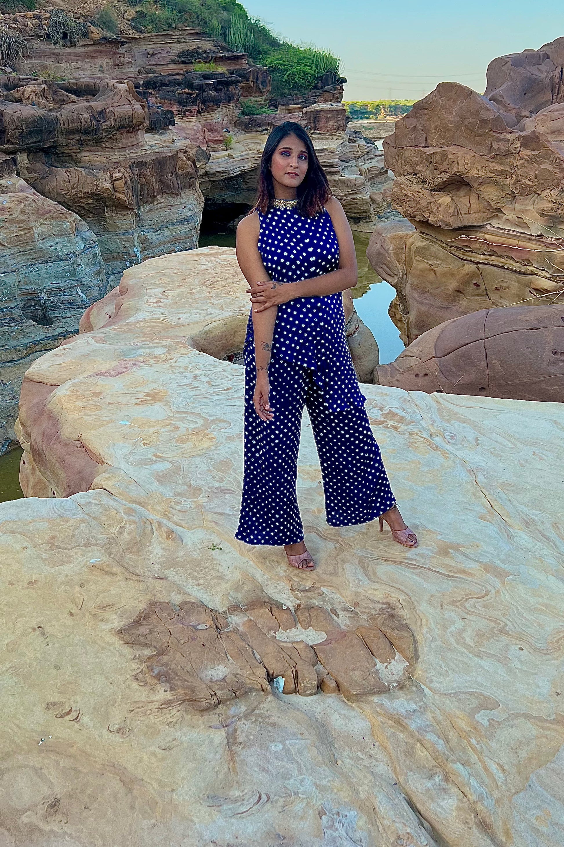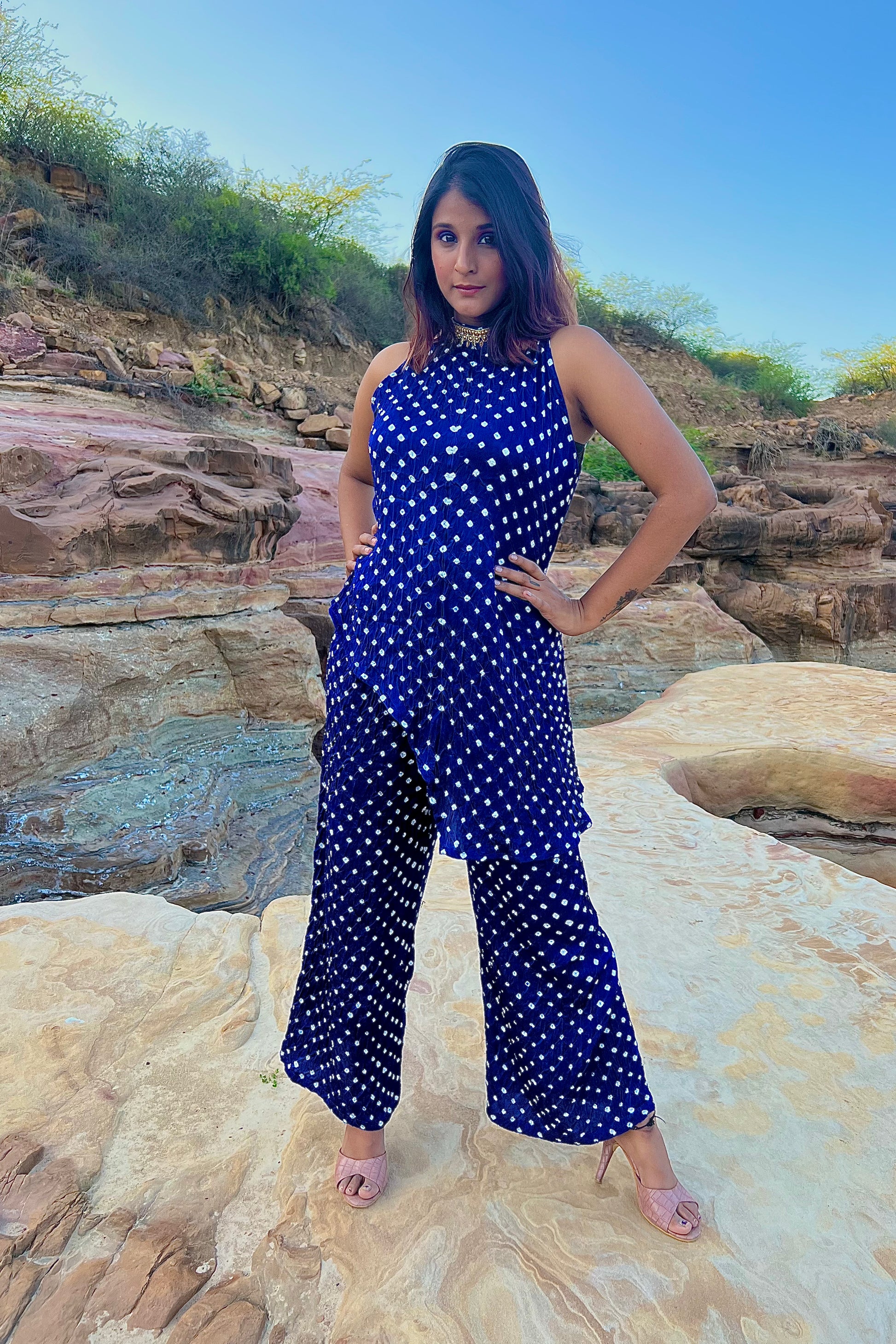 Stylish & comfortable Single Dot Bandhani Co-ord Set. Featuring a chic halter neckline with intricate detailing and a stylish high-low hemline, this set is paired with comfortable flared pants. Perfect for any occasion.