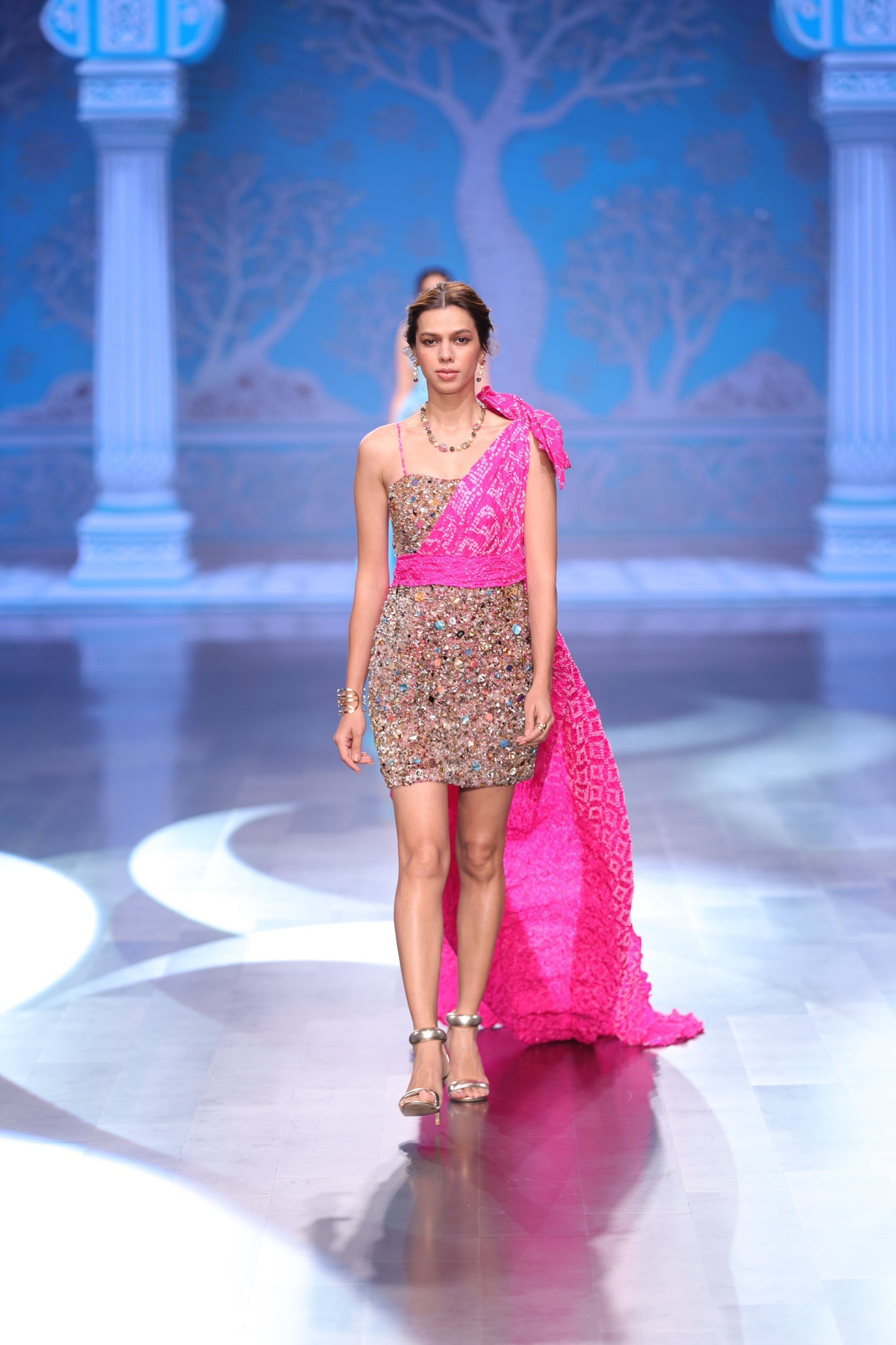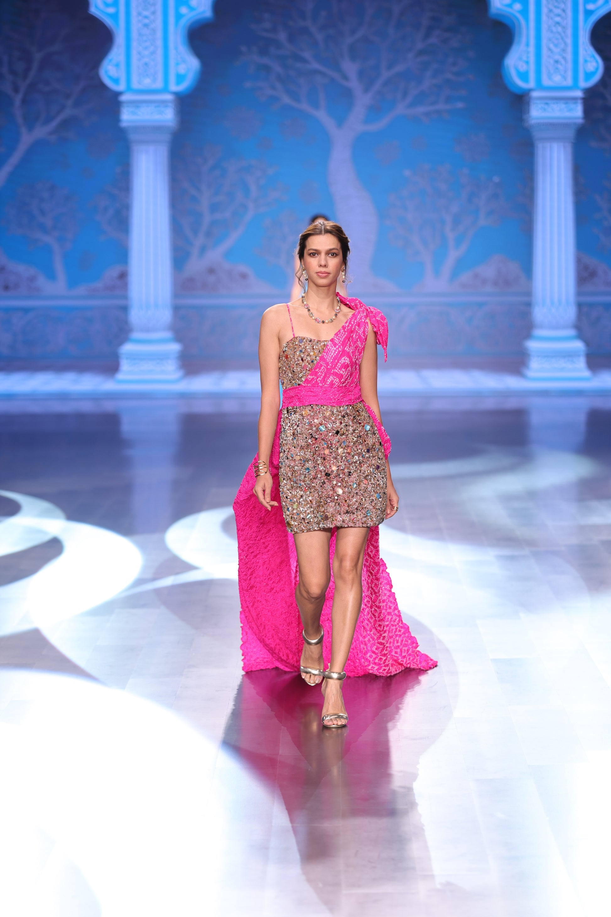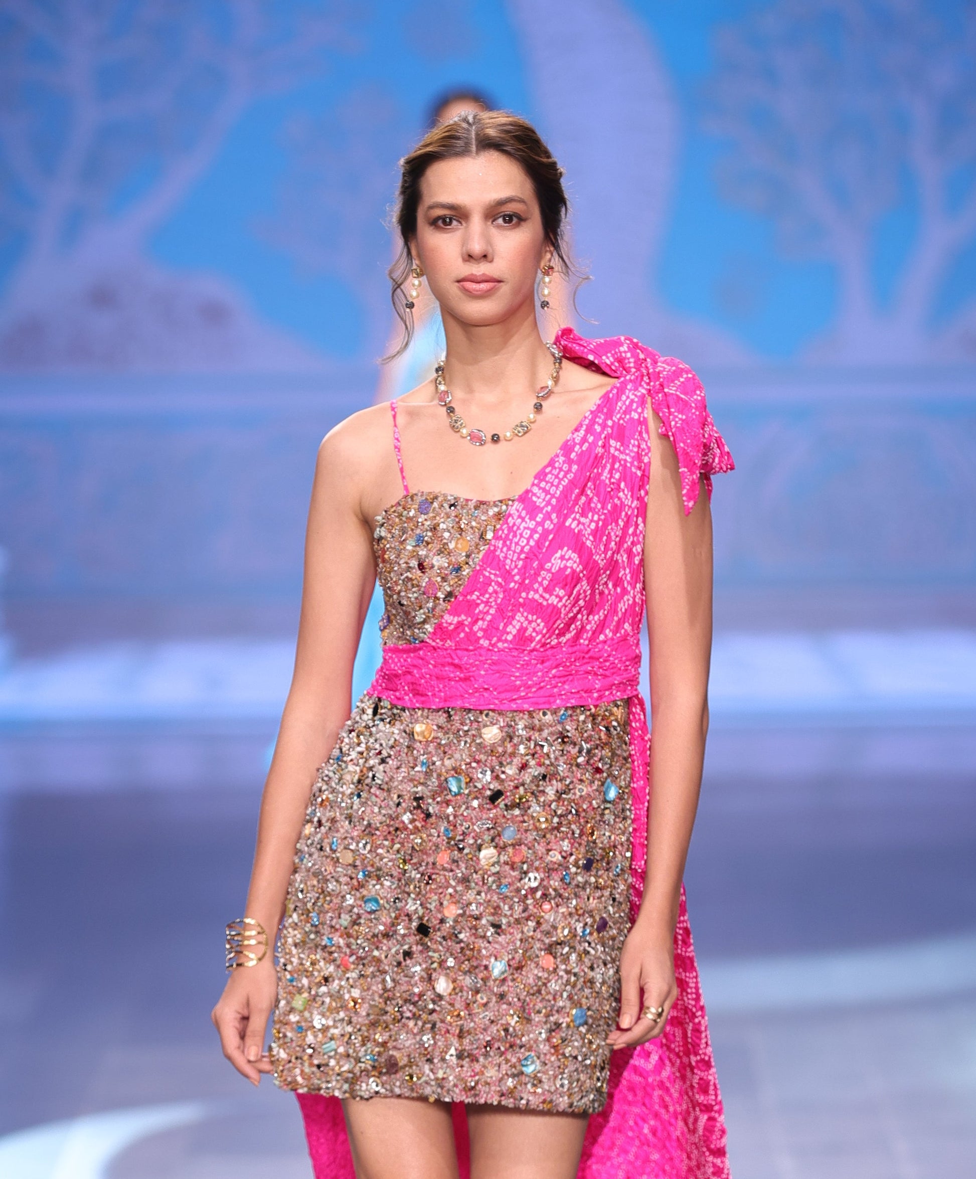 This elegant one-piece is crafted in a refined blend of raw silk and Habutai Bandhani, offering a rich texture with a soft, fluid drape. The Bandhani technique adds depth and character, creating a look that feels both timeless and contemporary.